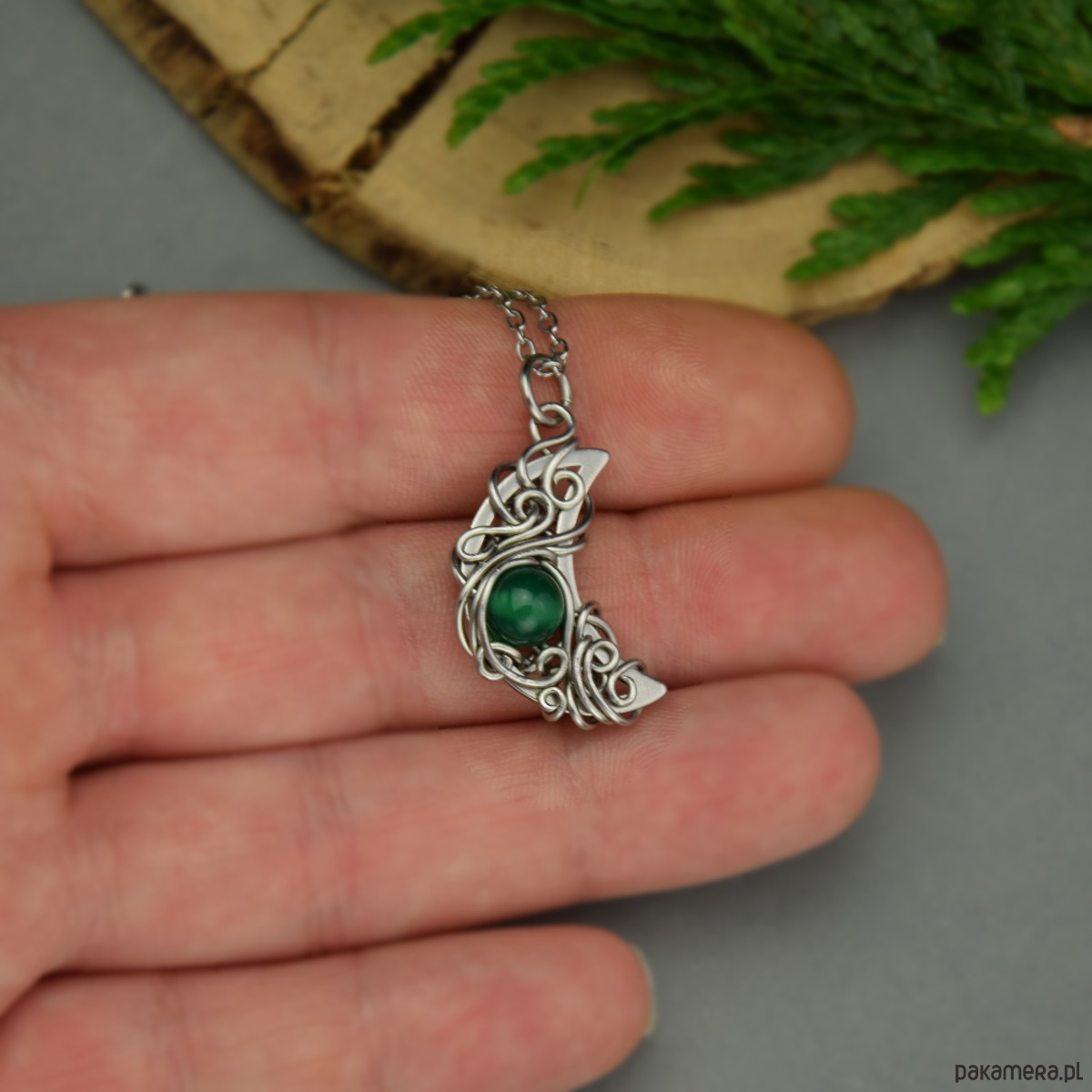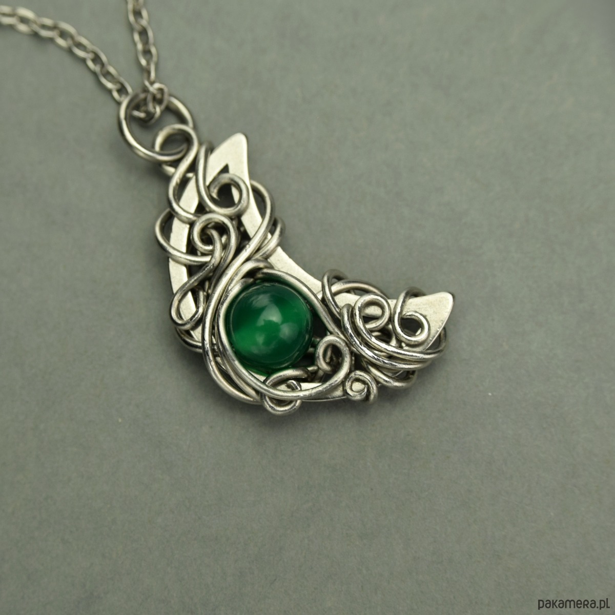 Ręcznie robiony wisiorek księżyc z zielonym onyksem, wykonany techniką wire wrapping z drutów ze stali chirurgicznej.