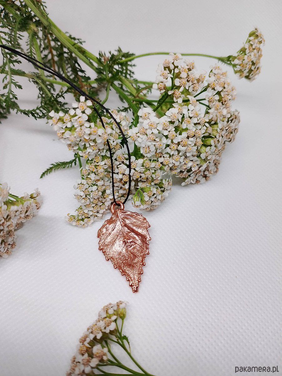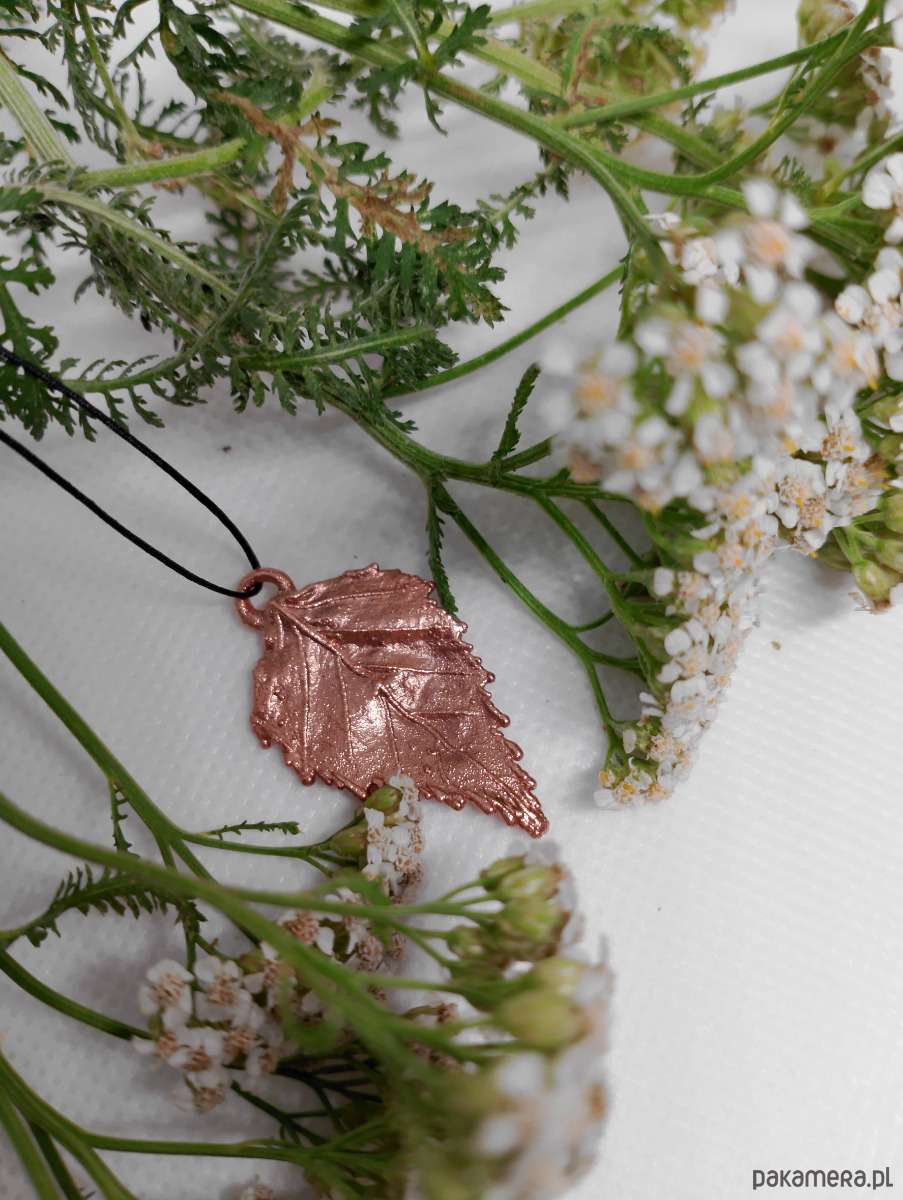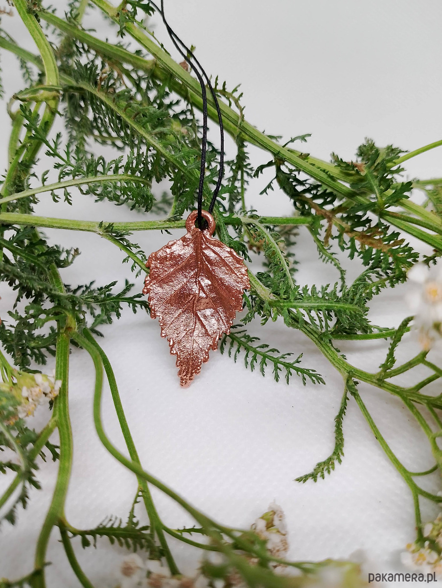 Ręcznie wykonany wisiorek z prawdziwego liścia brzozy, pokrytego czystą miedzią, to wyjątkowy amulet łączący Cię z energią natury.Zawieszony jest na regulowanym sznurku, który dopasuje się do Twoich potrzeb.