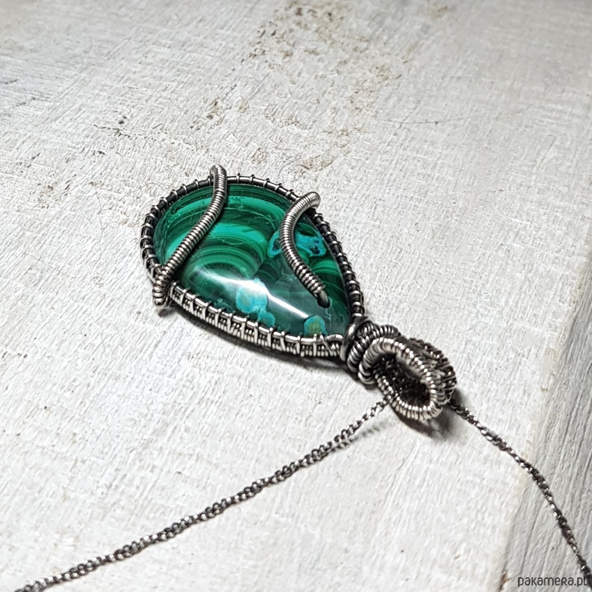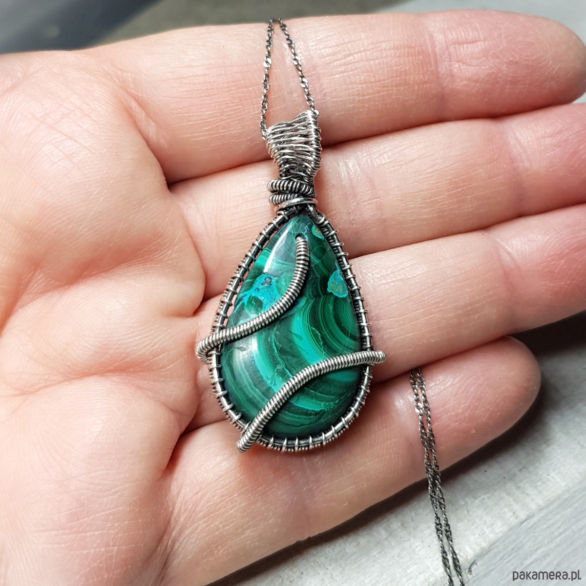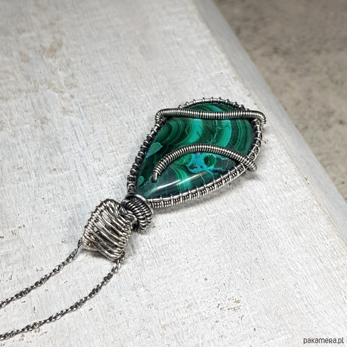 Zawieszka wykonana ręcznie metodą wire-wrappingu której głównym elementem jest naturalny malachit z azurytem na krawędziach. Do wykonania wisiorka użyłam srebra najwyższej próby 999, następnie zaoksydowałam i wypolerowałam w celu uzyskania szlachetnego efektu postarzenia. Wymiary zawieszki 44x24mm z delikatnym łańcuszkiem długości około 48-50 cm.