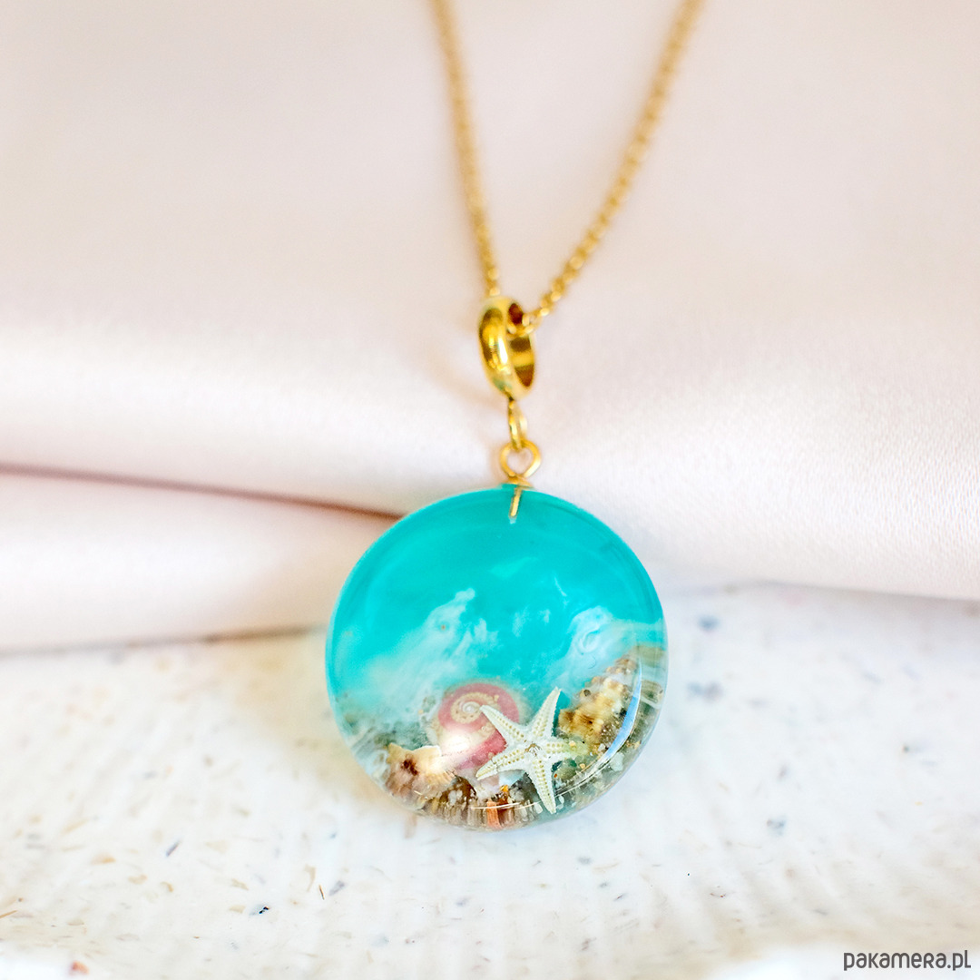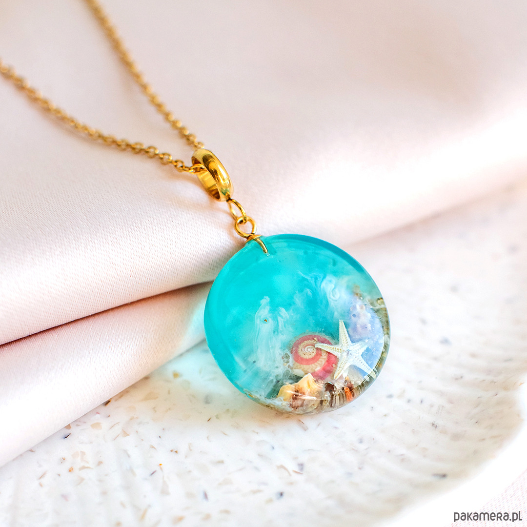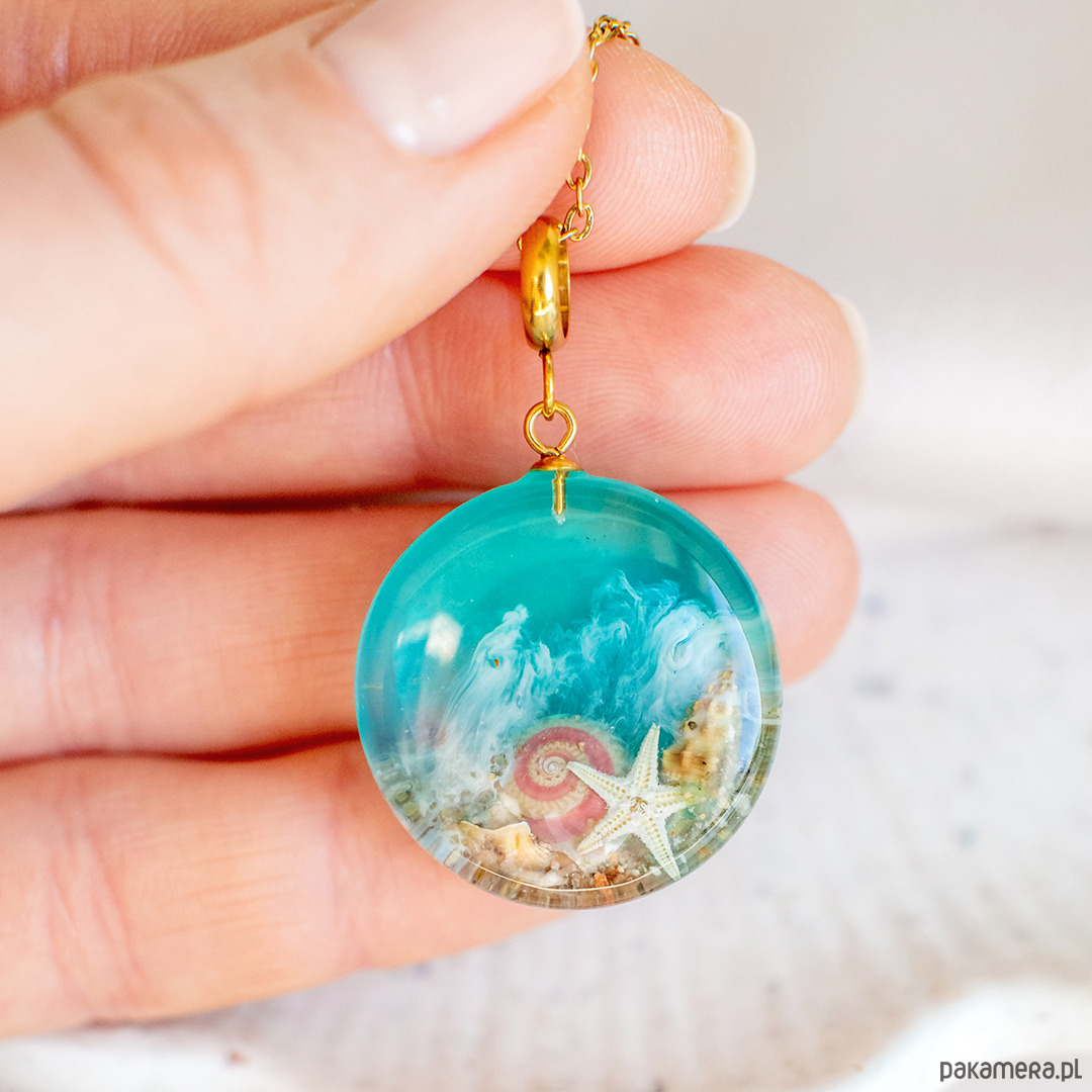 Zainspirowana spokojem morza, ta biżuteria kryje w sobie jego delikatne piękno i tajemniczy urok. W jej wnętrzu znajdują się naturalne elementy morza — drobinki piasku, muszelki i małe rozgwiazdy, tworzące wyjątkową kompozycję.