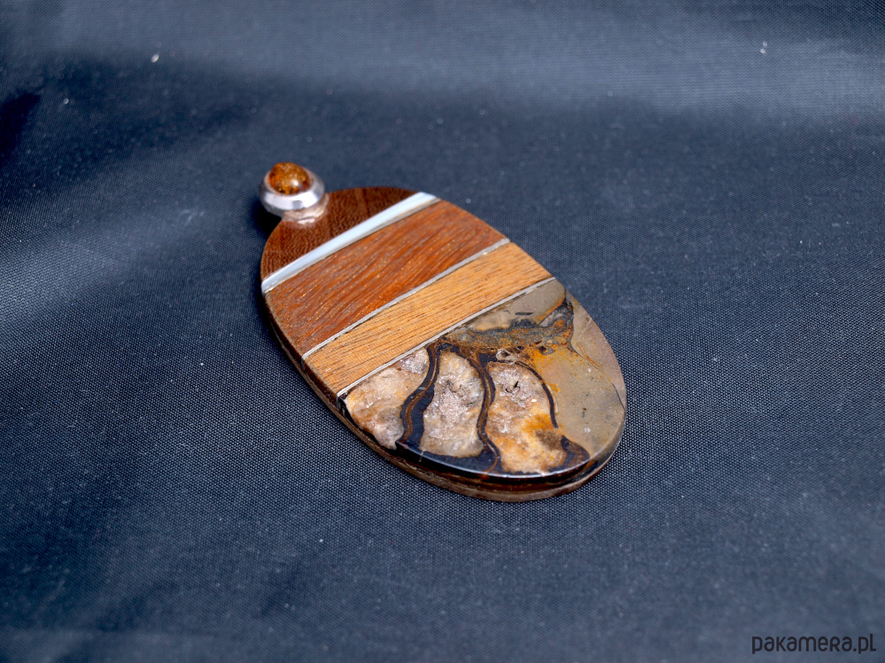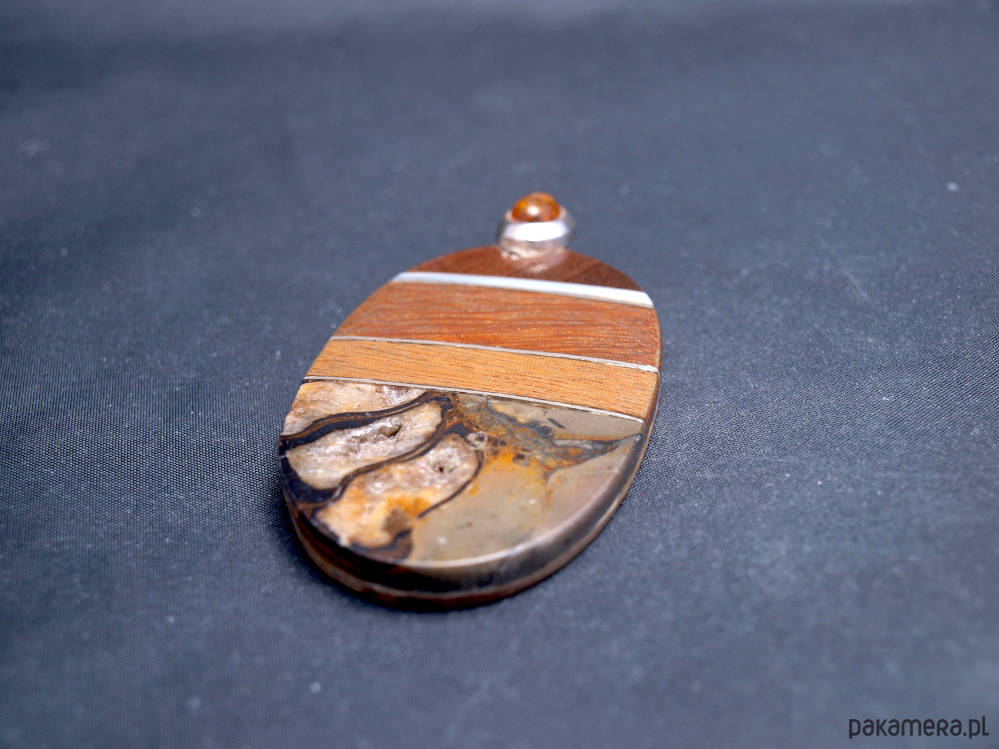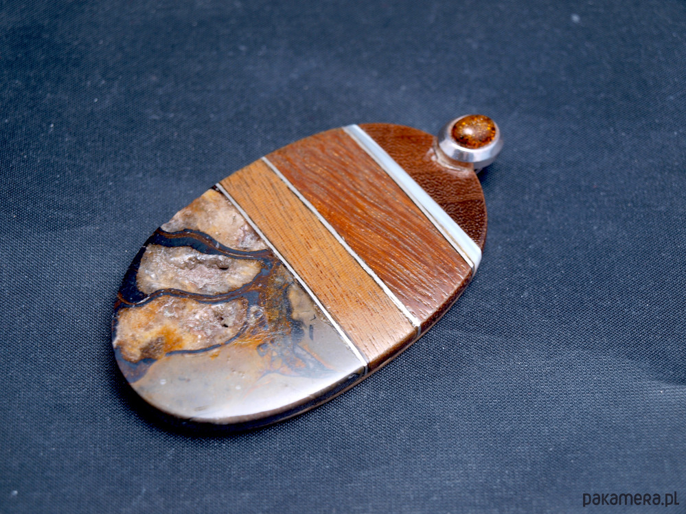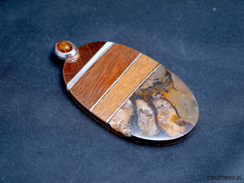 Ręcznie wykonany wisiorek z naturalnych tworzyw. Produkt wykonano ze srebra próby 925 ,polskiego bursztynu, drewna oraz naturalnego kamienia. Wisiorek przypomina mozaikę. Elementy przedzielono srebrnymi ramkami. Całość umieszczono na kawałku drewna - dębu z kanału panamskiego.