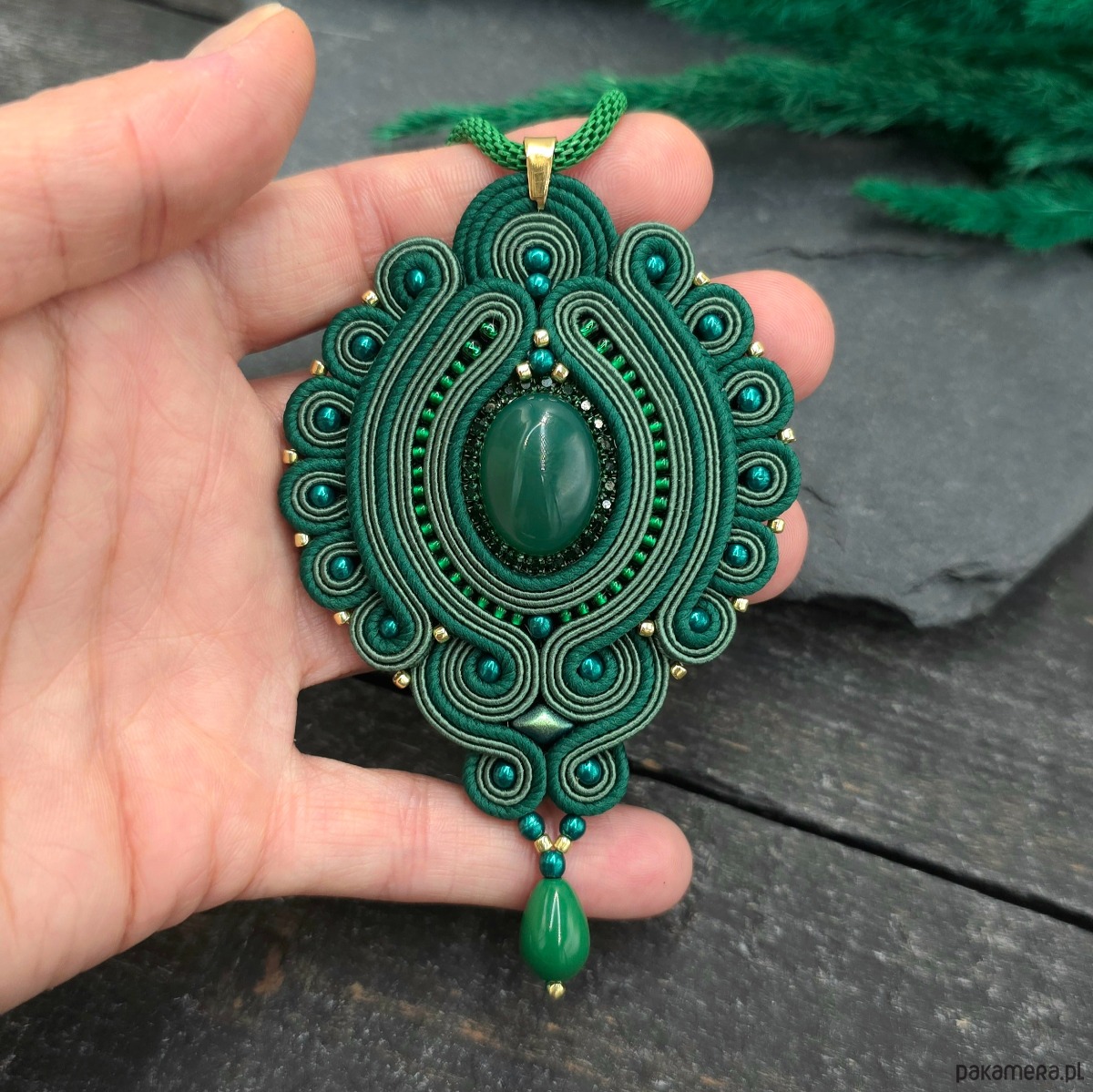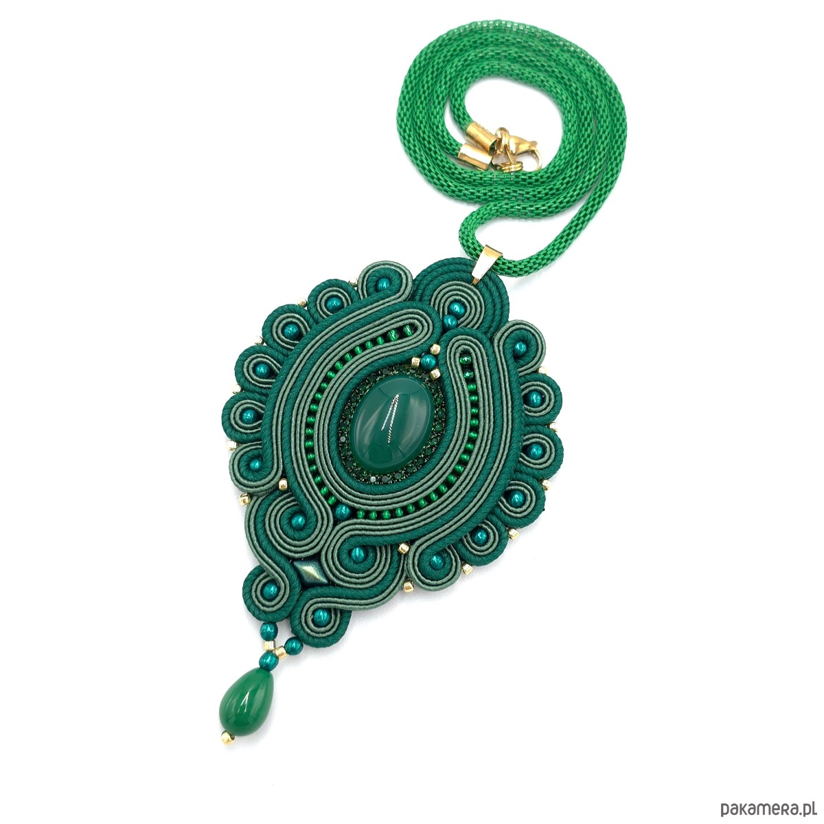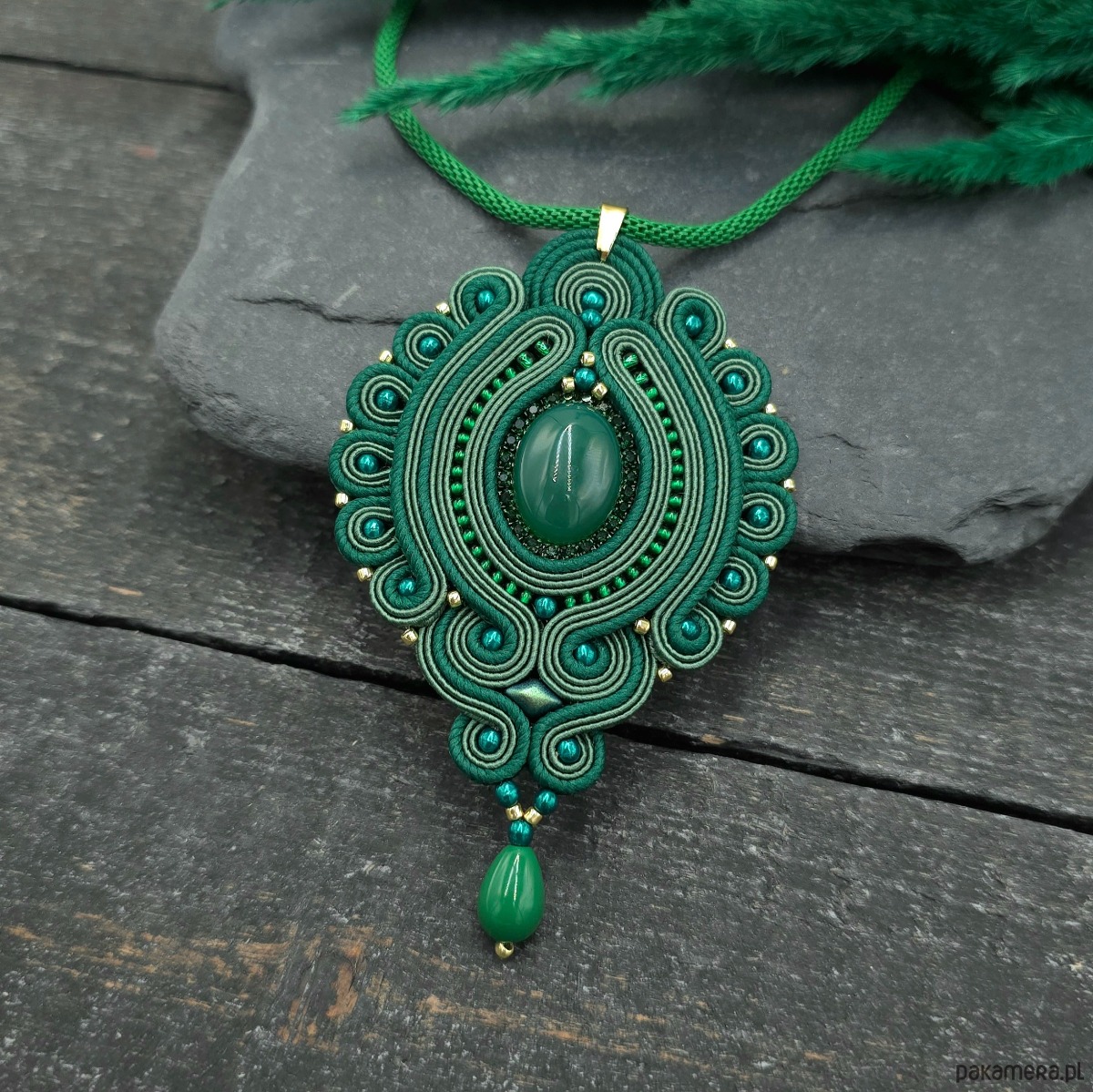 Klasyczny wisiorek sutasz w odcieniach butelkowej i szłwiowej zieleni.