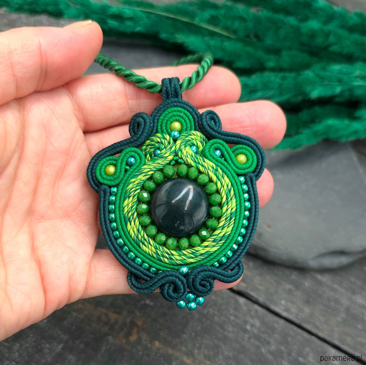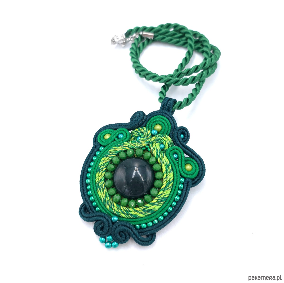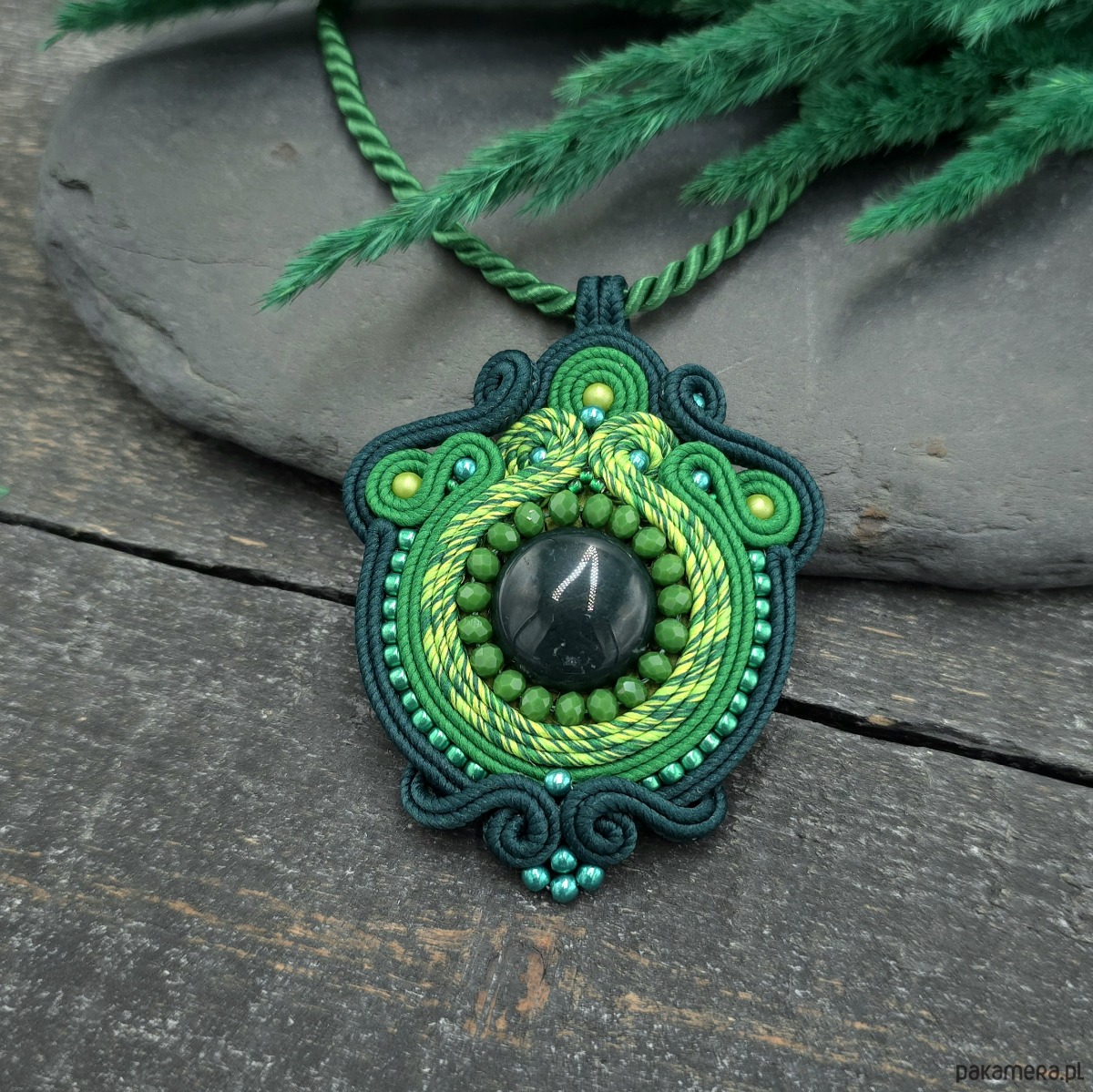 Ten ręcznie wykonany wisiorek sutasz zachwyca bogactwem zielonych odcieni.