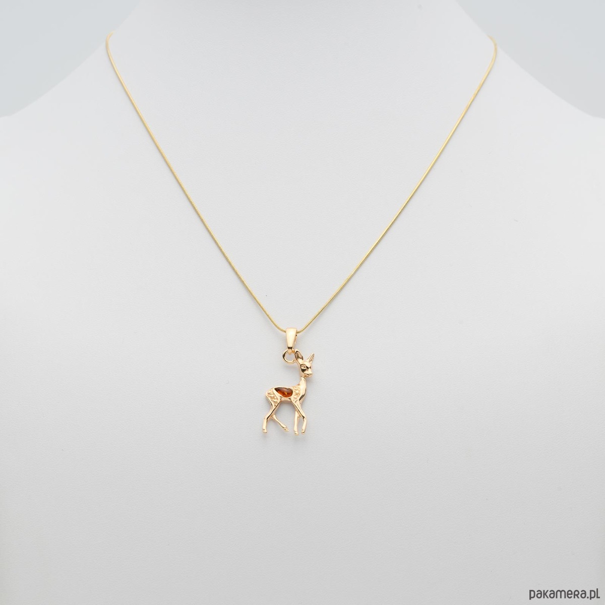 Wisiorek Pozłacany Bursztyn Sarna Łańcuszek, Bursztynowa Sarenka Prezent)