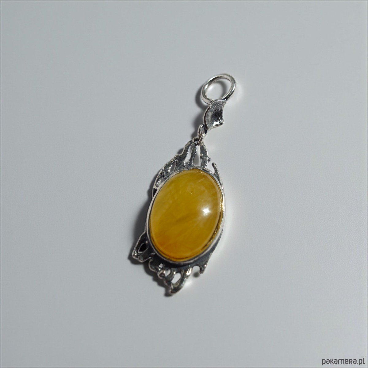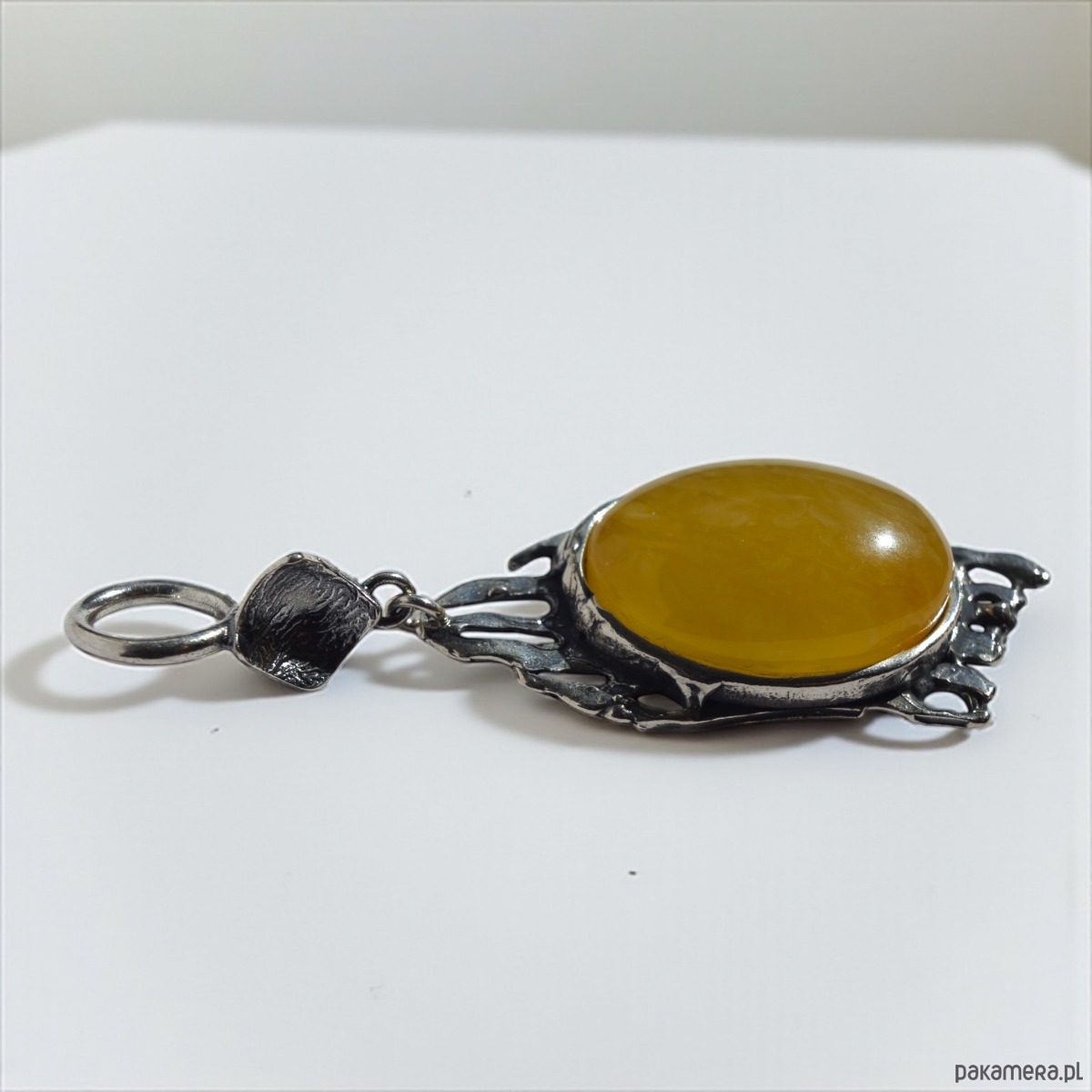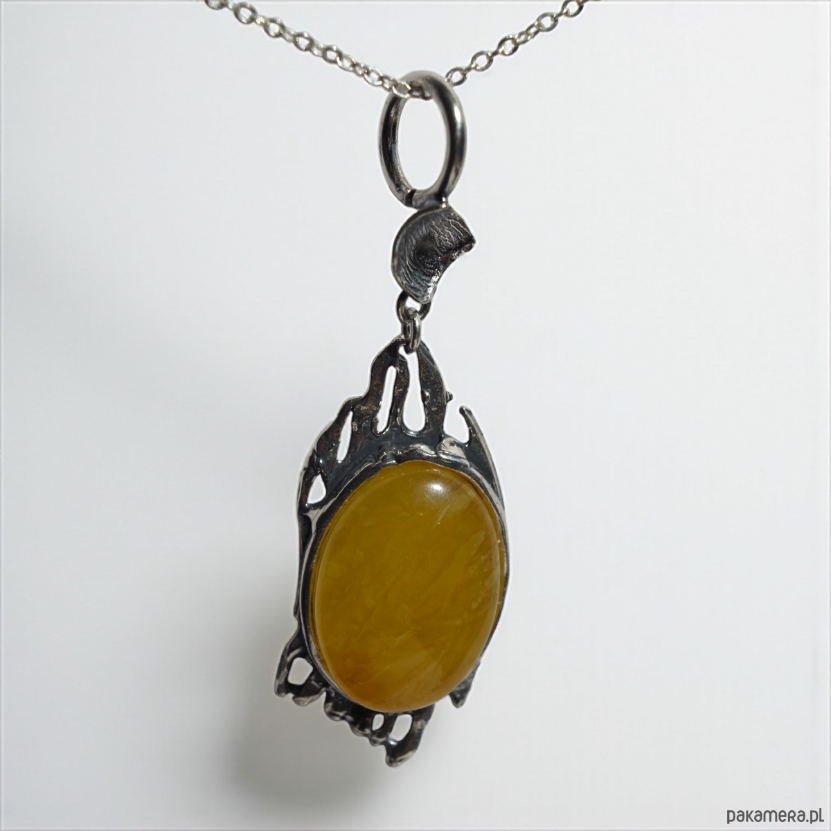 Ręcznie robiony wisiorek z dużym bursztynem w odcieniu żółtym, oprawionym w ażurową, srebrną ramę o nieregularnej formie. Wyjątkowym detalem jest solidne, szerokie oczko, które umożliwia zawieszenie wisiorka także na grubszych łańcuszkach czy rzemieniach. Całość prezentuje się szlachetnie i oryginalnie.
