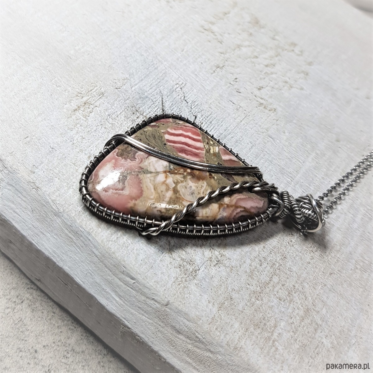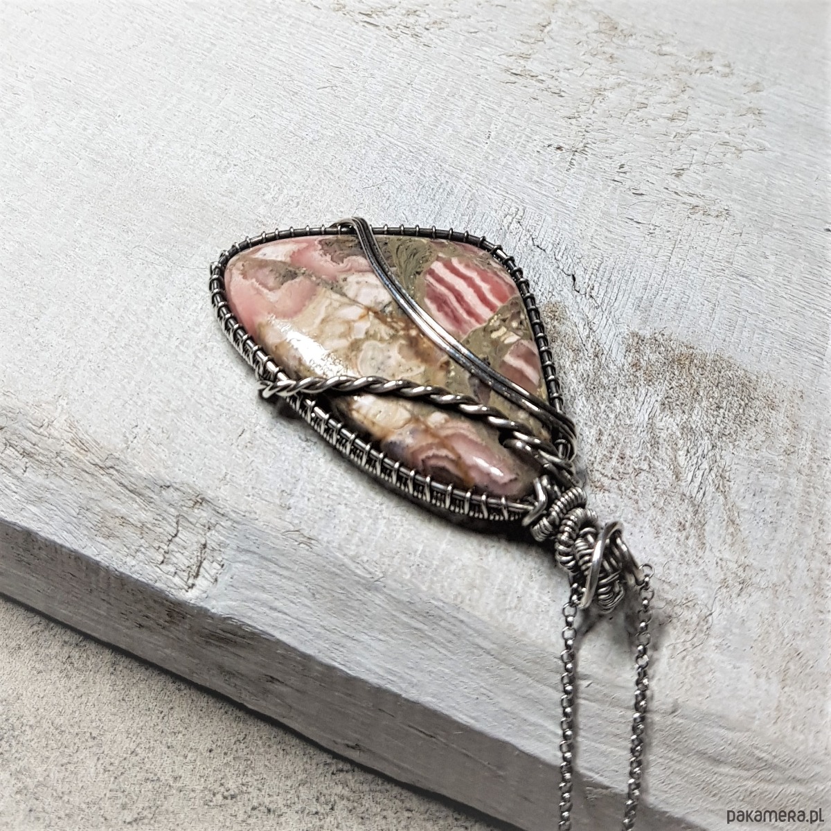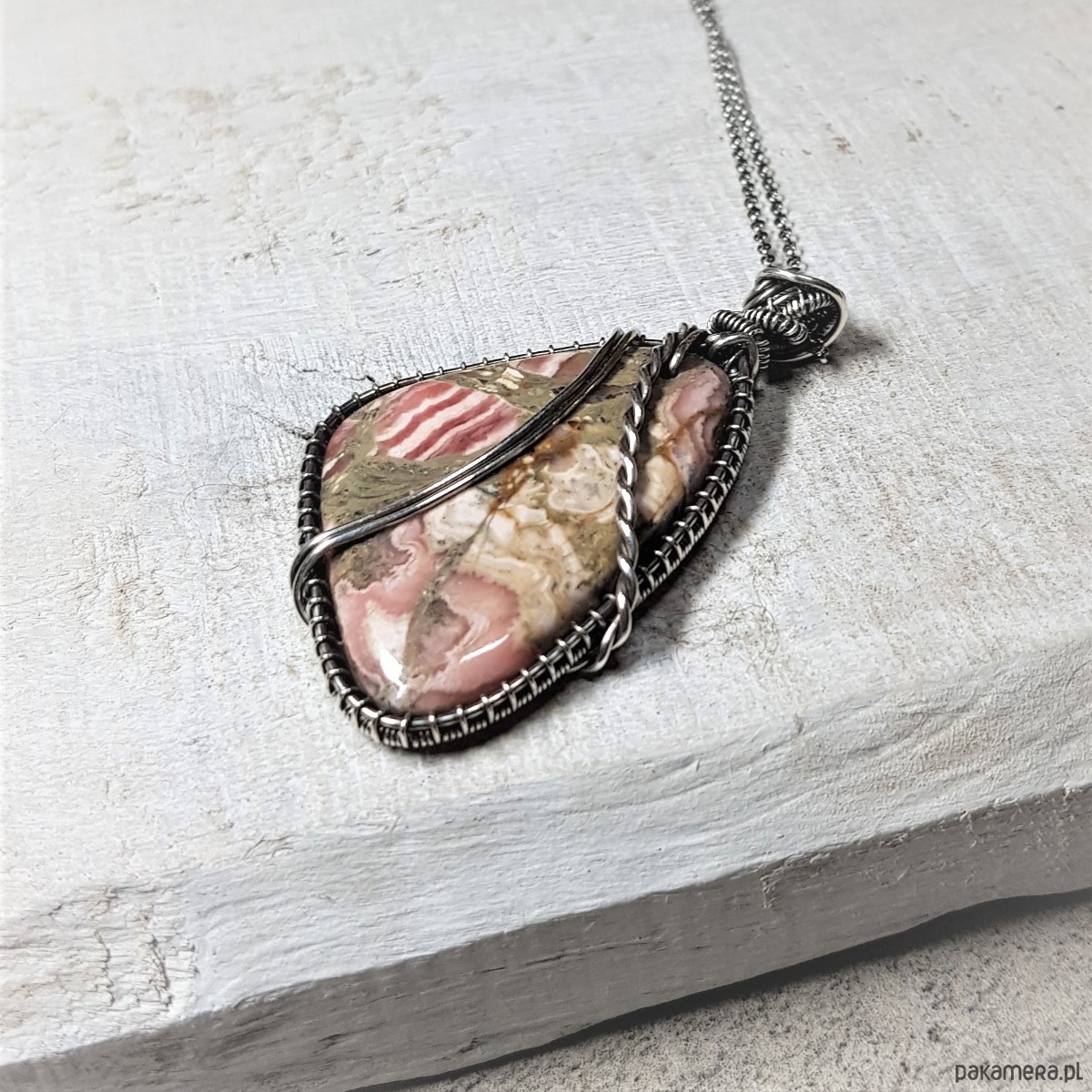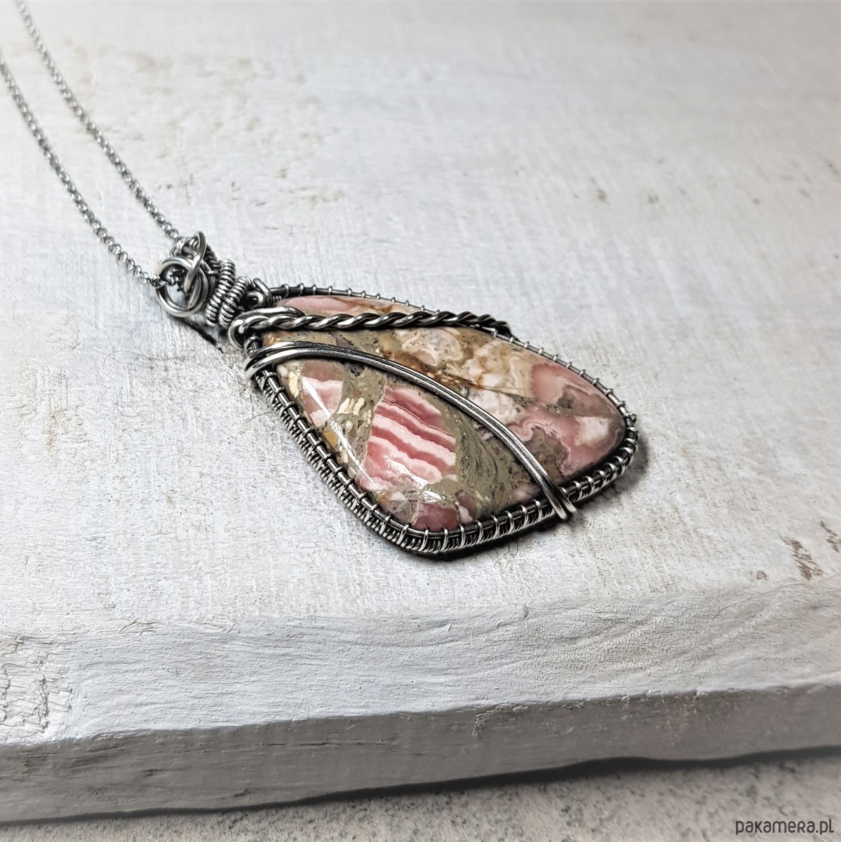 Zawieszka wykonana ręcznie metodą wire-wrappingu której głównym elementem jest naturalny rodochrozyt. Kamień który oferuję ma bardzo ciekawy, niepowtarzalny wzór. Do wykonania wisiorka użyłam srebra najwyższej próby 999. Wisiorek jest pokryty oksydą i wypolerowany. Wymiary zawieszki 52x30mm z łańcuszkiem długości około 48-50 cm.