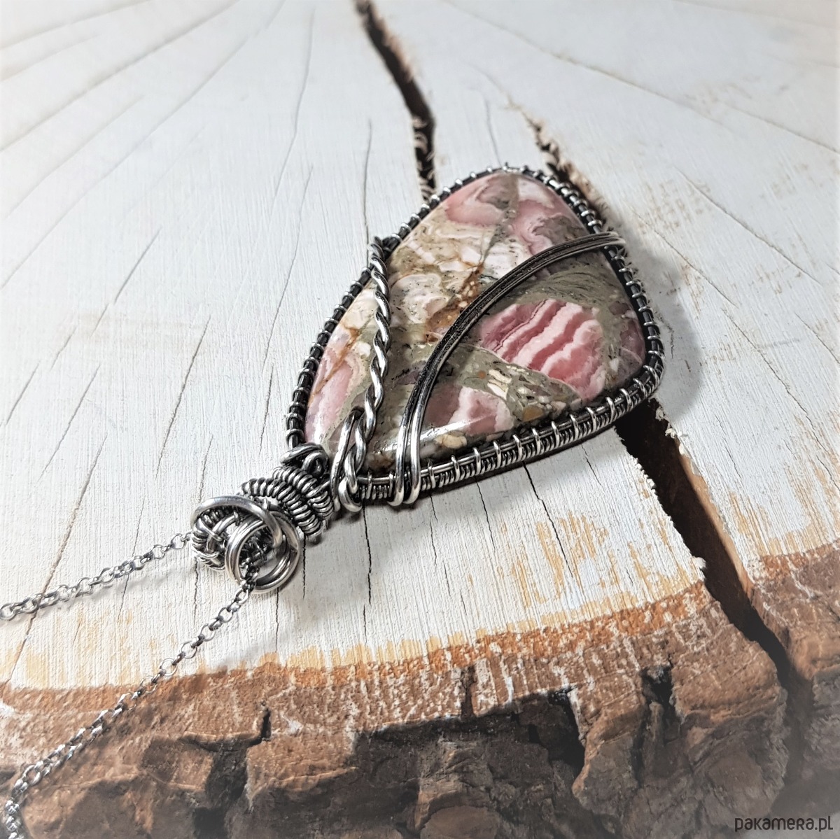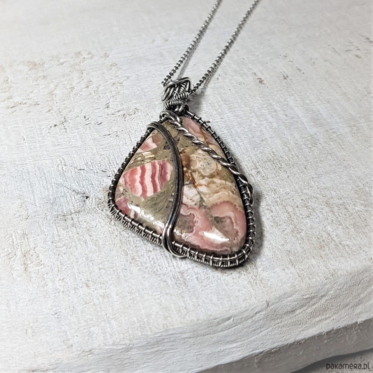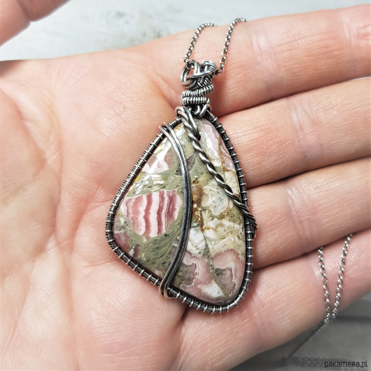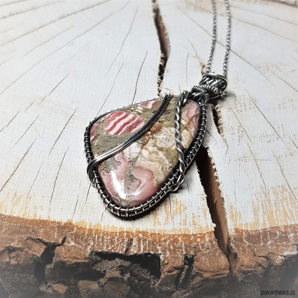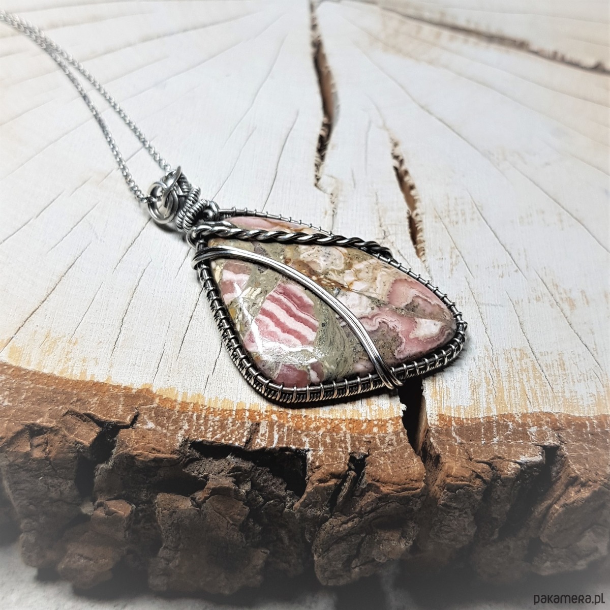 Zawieszka wykonana ręcznie metodą wire-wrappingu której głównym elementem jest naturalny rodochrozyt. Kamień który oferuję ma bardzo ciekawy, niepowtarzalny wzór. Do wykonania wisiorka użyłam srebra najwyższej próby 999. Wisiorek jest pokryty oksydą i wypolerowany. Wymiary zawieszki 52x30mm z łańcuszkiem długości około 48-50 cm.