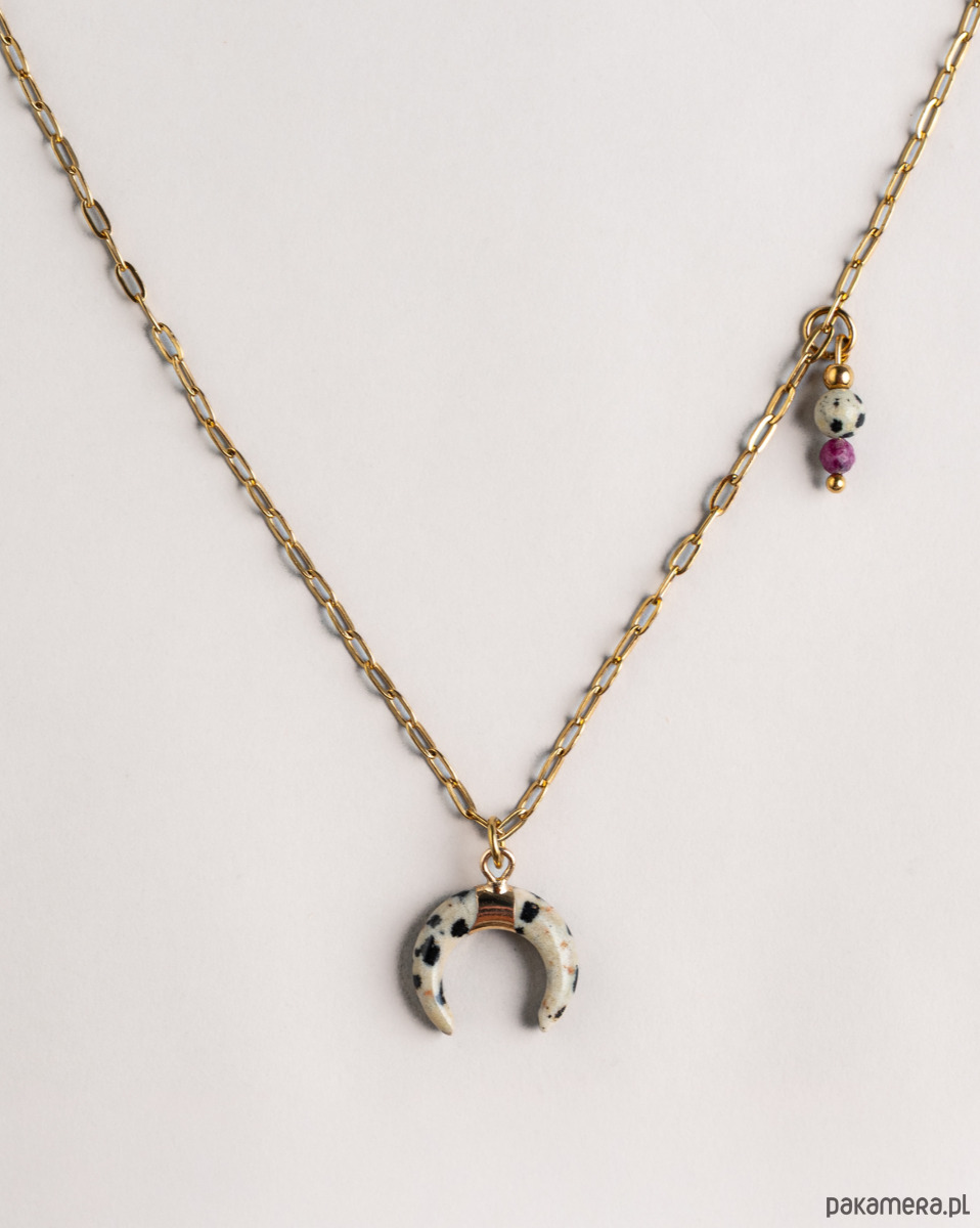 Naszyjnik wykonany z łańcuszka ze stali szlachetnej. Przepiękny wisiorek w kształcie rogu z pięknym kamieniem ( jaspis dalmatyński ) W akompaniamencie malusia zawiesza z jaspisu i rubinu