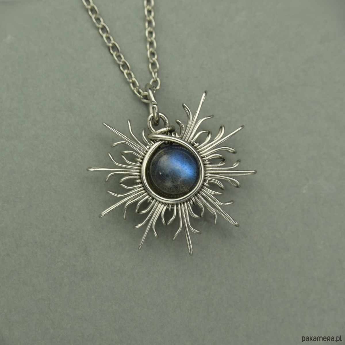 Oryginalny wisiorek w kształcie słońca z kulką labradorytu połyskującego na niebiesko. Wykonany ręcznie techniką wire wrapping z drutów ze stali chirurgicznej. Jego długość całkowita (z kółeczkiem) to około 2,5cm. Słońce ma średnicę około 2,4cm. Zawieszony został na łańcuszku o długości 50cm, ale mogę dowolnie zmienić jego długość. Na zdjęciach przedstawione są przykładowe wisiorki.