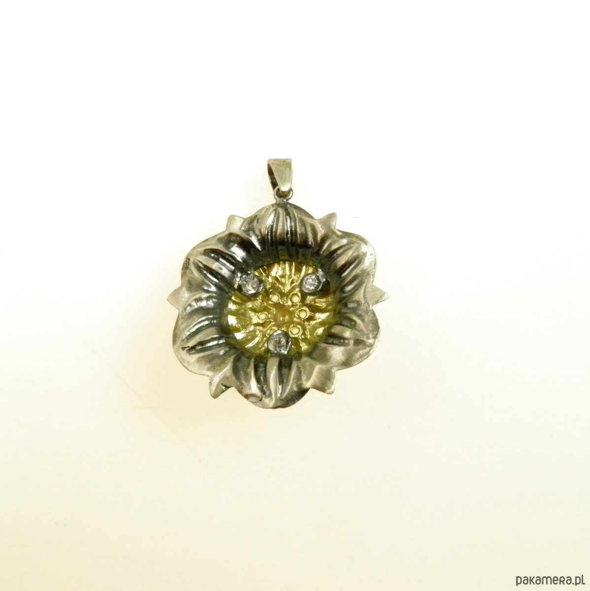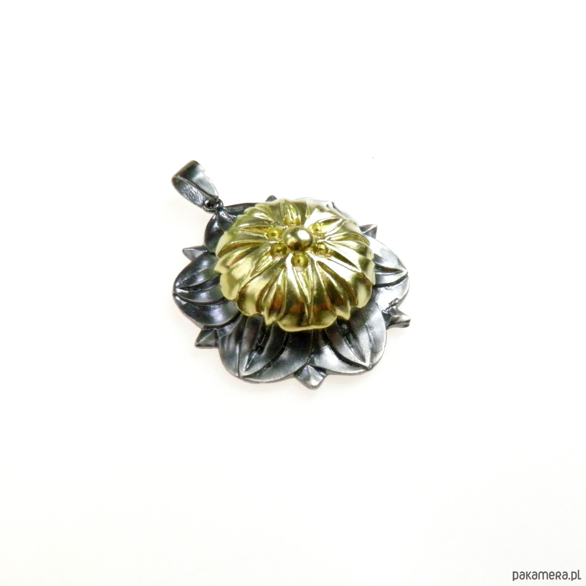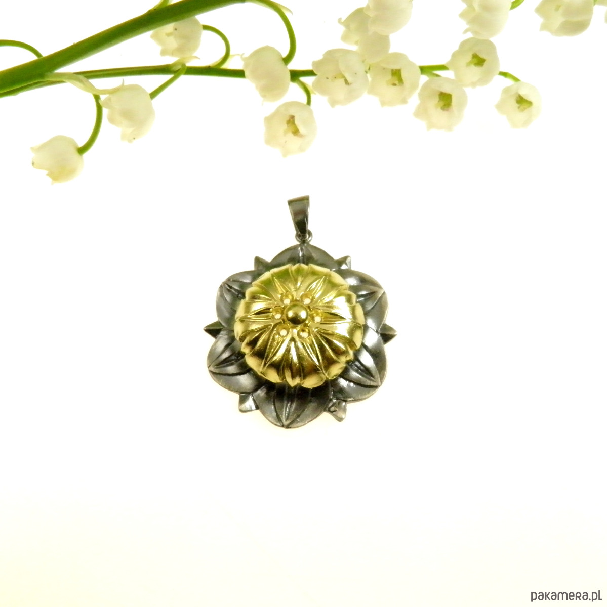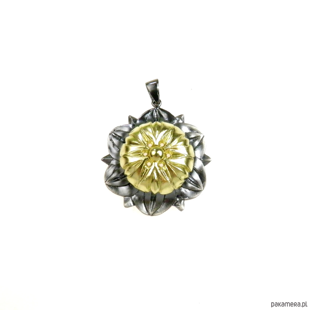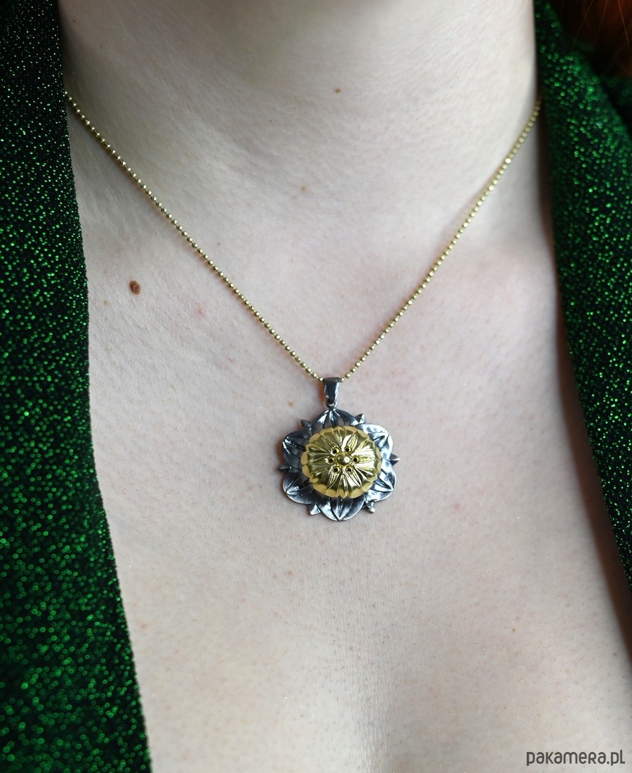Środek kwiatka został pozłocony, nadając mu subtelnego blasku i wyjątkowego charakteru, podczas gdy płatki, zoksydowane na kolor szary, dodają mu nieco industrialnego uroku, tworząc harmonijną i kontrastową całość.
