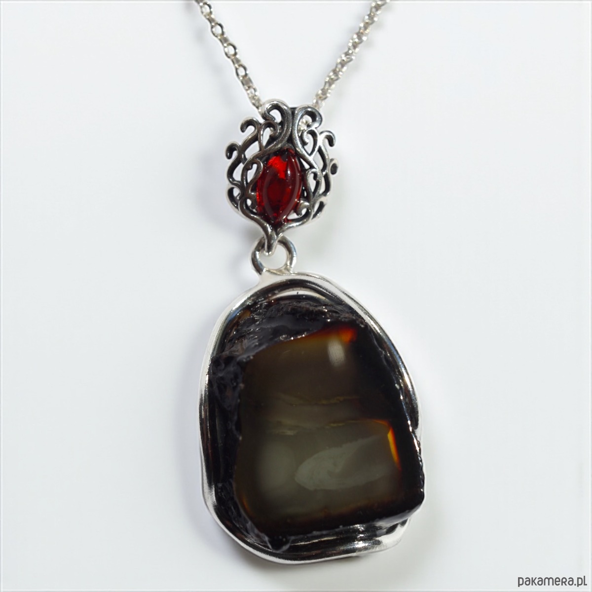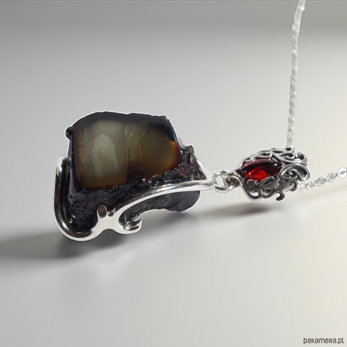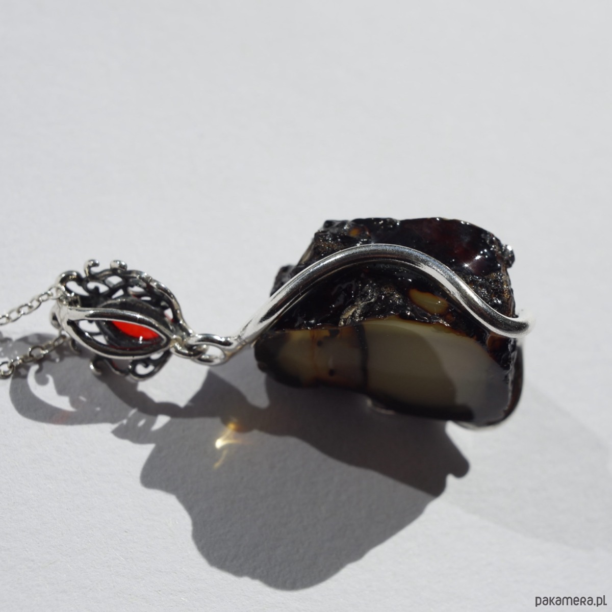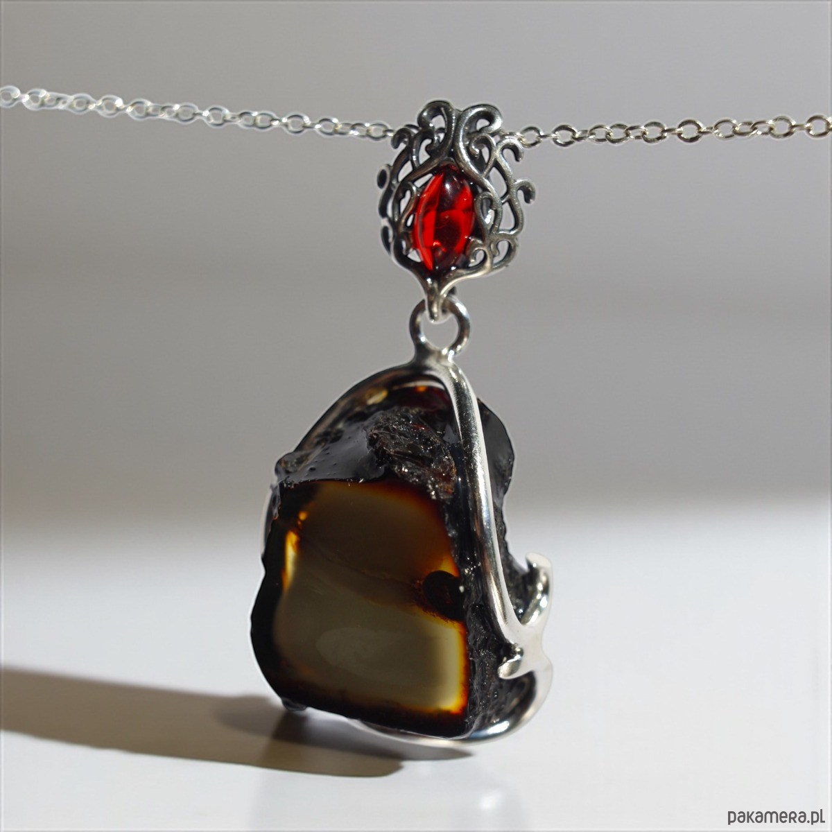 Ręcznie wykonany wisiorek, w którym łączą się dwa bursztyny - duży, naturalny w ciemnym, głębokim odcieniu oraz mniejszy, w barwie intensywnego koniaku. Całość osadzona została w misternie zdobionej oprawie ze srebra, nadającej biżuterii elegancki i wyjątkowy charakter.