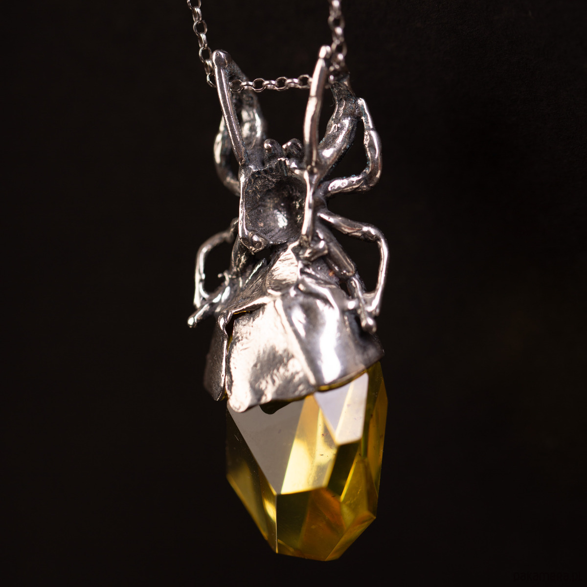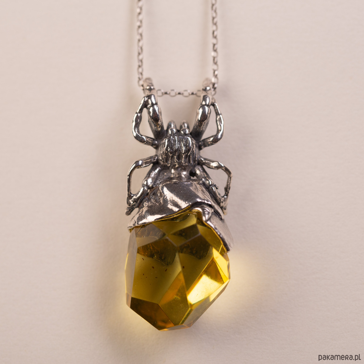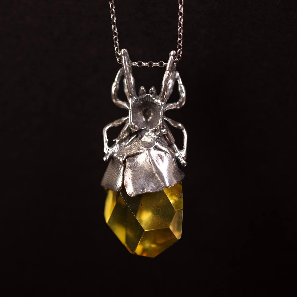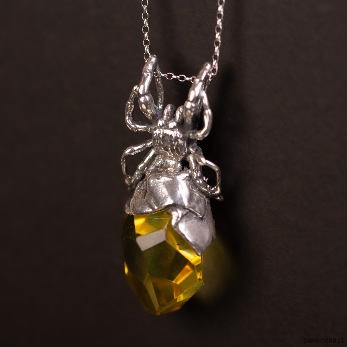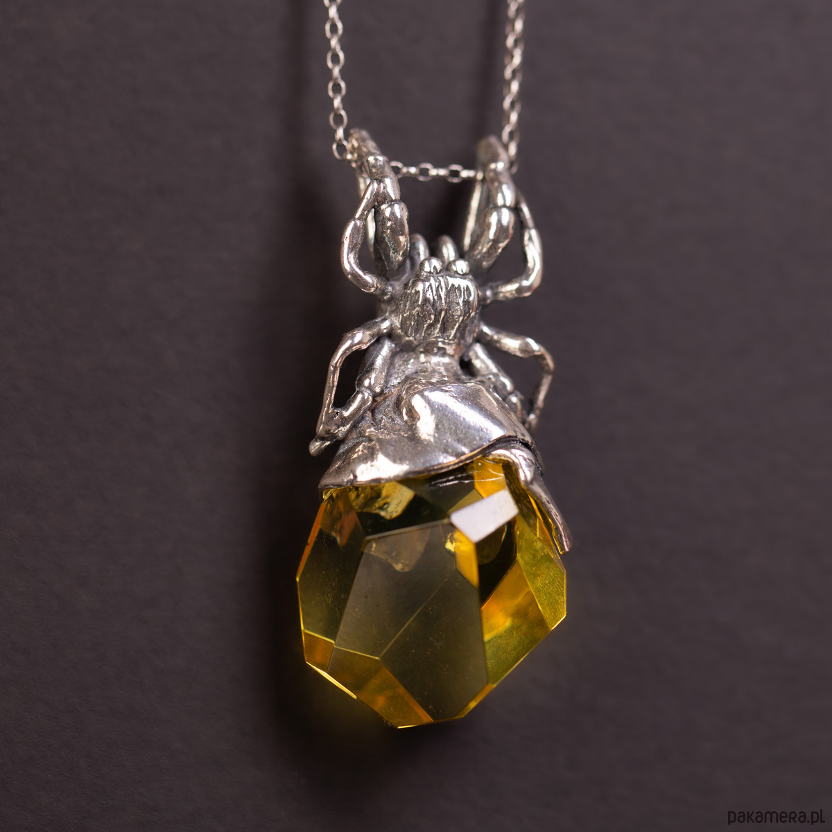 Artystyczny wisiorek wykonany z niezwykłą precyzją w srebrze próby 925. Srebrna rzeźba pająka została zaprojektowana tak, by jego odwłok stanowiła duża bryła bursztynu bałtyckiego o cytrynowo-żółtej barwie. Bursztyn został poddany fasetowaniu, co sprawia, że jego liczne płaszczyzny intensywnie załamują światło, tworząc dynamiczną grę blasków pod srebrnym korpusem pająka.