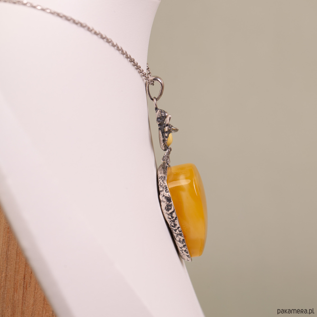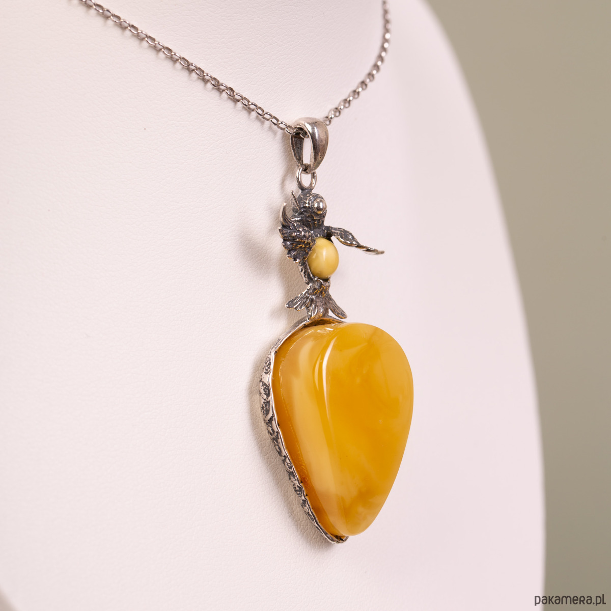Forma i charakter: Wisiorek zachwyca swoją trójwymiarowością i dynamiką. Kontrast między ciemnym, oksydowanym srebrem a ciepłym, słonecznym odcieniem bursztynu tworzy kompozycję pełną elegancji i wyrazistości. To biżuteria z duszą, która dzięki motywowi ptaka symbolizuje wolność. Wyraźna wysokość bursztynu nadaje mu objętości, sprawiając, że ozdoba pięknie prezentuje się pod każdym kątem.