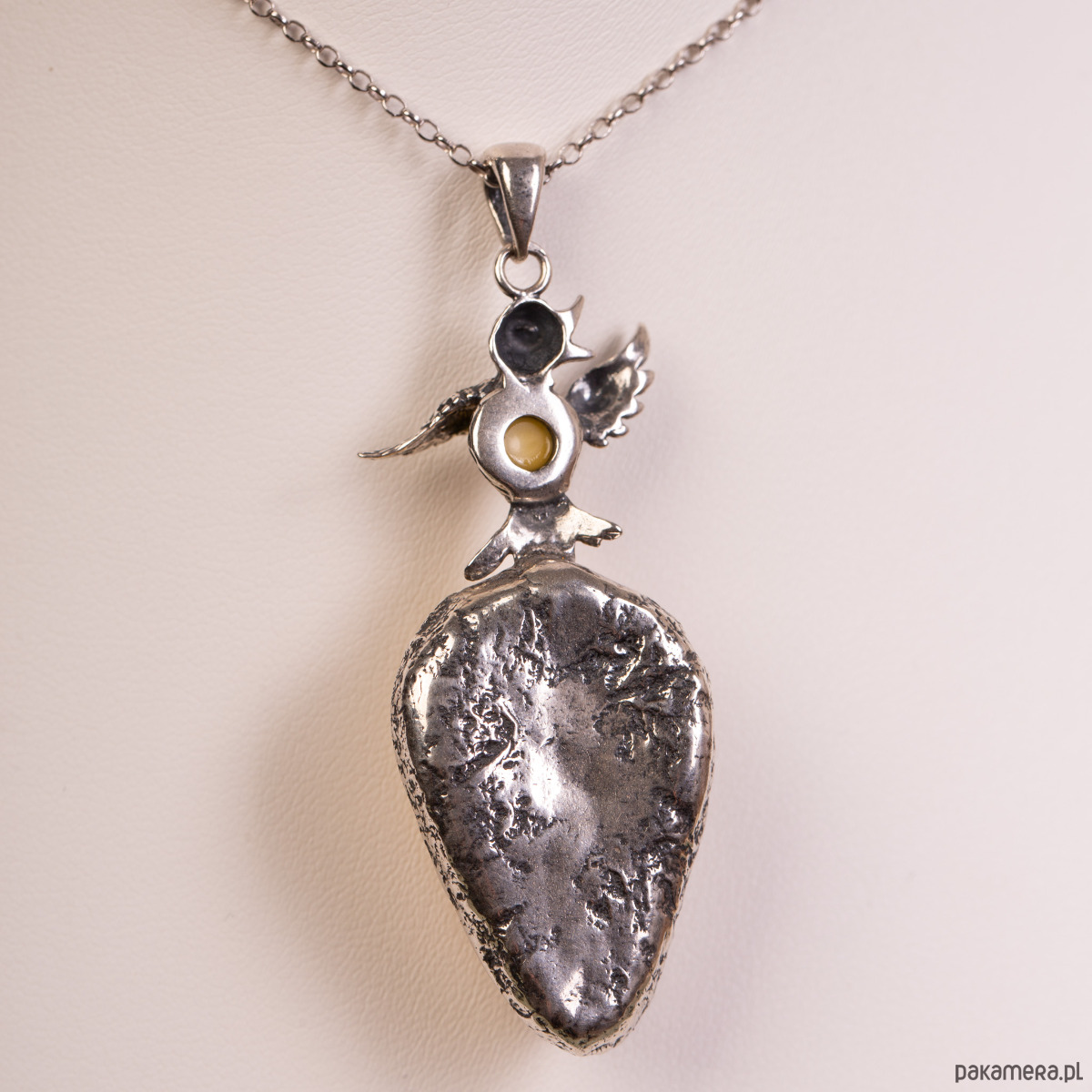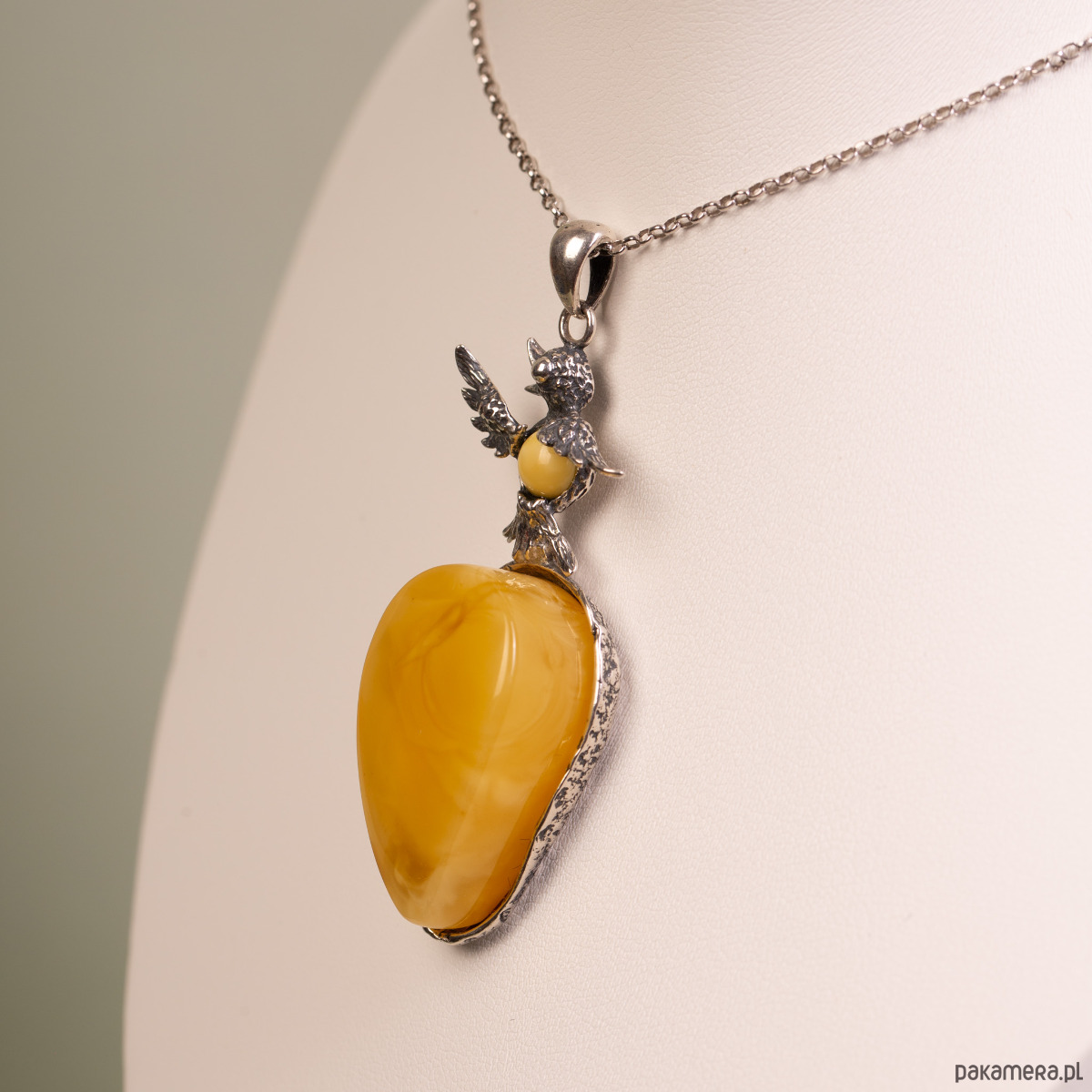 Niezwykle oryginalny, ręcznie wykonany wisiorek, który łączy w sobie jubilerską precyzję z naturalnym pięknem bursztynu bałtyckiego. Centralnym punktem kompozycji jest duży bursztyn o intensywnej, nieprzejrzystej, żółtej barwie. Nad nim góruje misternie wyrzeźbiona w srebrze postać ptaka w locie, którego brzuszek zdobi maleńka kuleczka bursztynu. Srebro zostało poddane procesowi oksydowania, co efektownie przyciemniło metal, wydobywając każdy detal upierzenia i nadając biżuterii szlachetnego, antycznego charakteru.