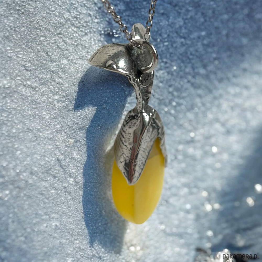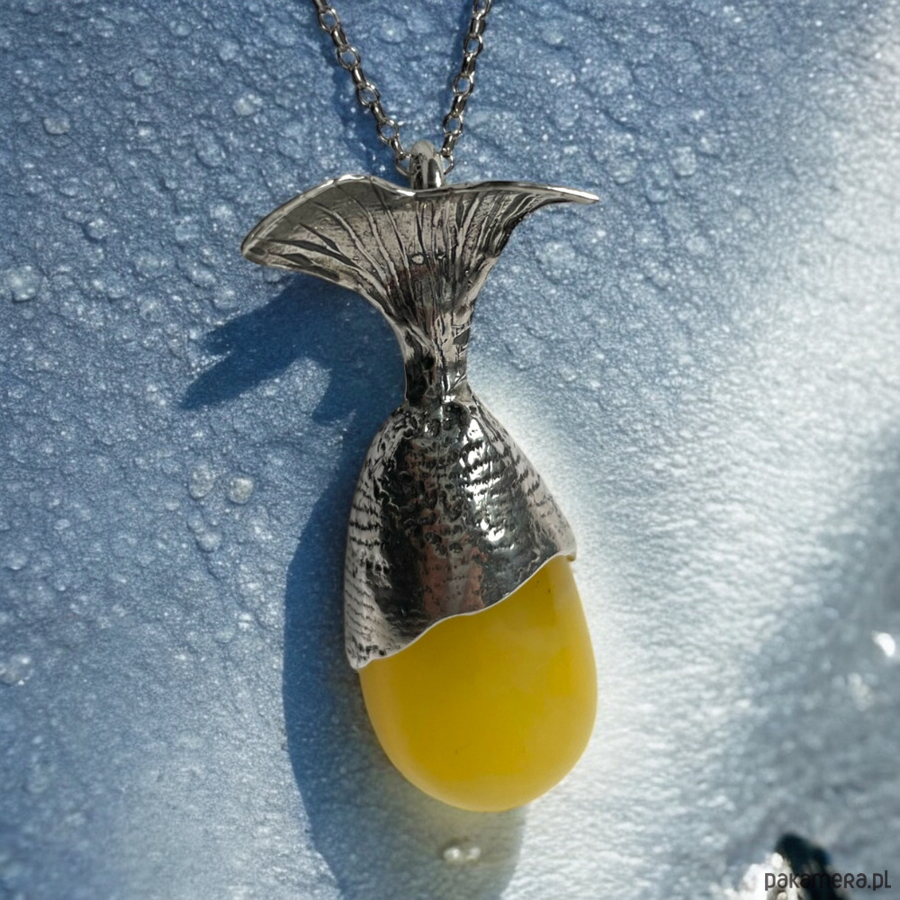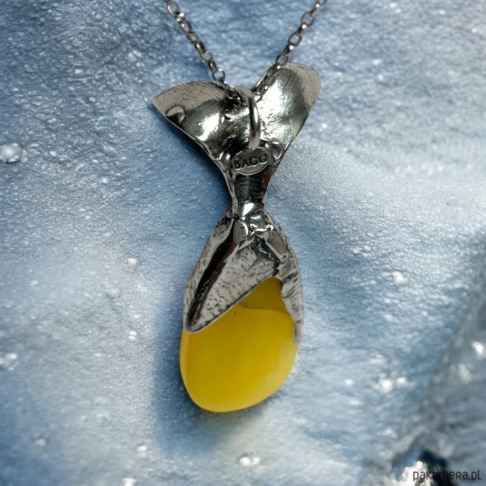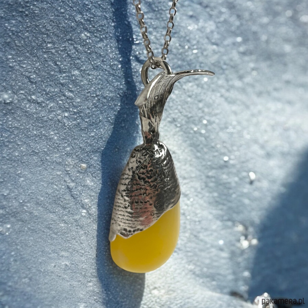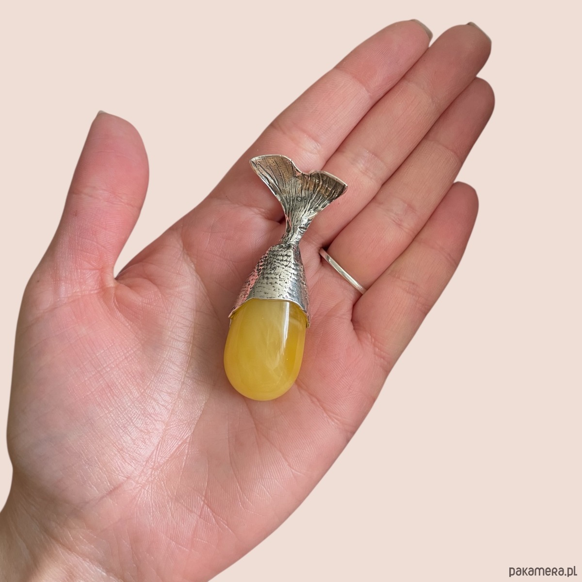 Wyjątkowy, ręcznie wykonany wisiorek ze srebra próby 925 w kształcie ryby, której ogon został misternie uformowany ze srebra, a reszta ciała to pięknie oszlifowany bursztyn bałtycki w ciepłym, miodowym odcieniu. Połączenie organicznej formy i naturalnego bursztynu tworzy harmonijną, lekko morsko-fantazyjną kompozycję.
