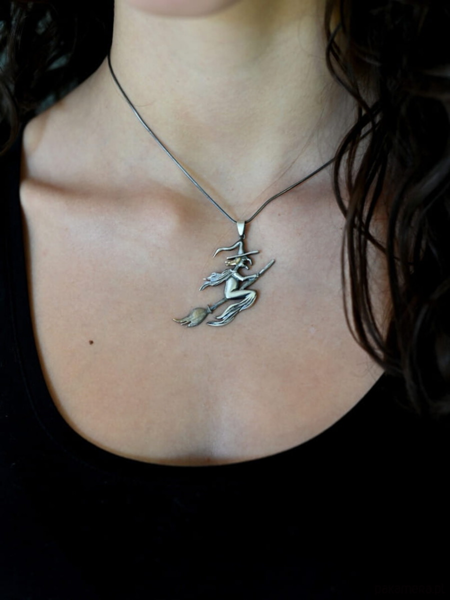 Ten wyjątkowy wisiorek, wykonany ze srebra próby 925, przedstawia wiedźmę na miotle, emanującą urokiem i tajemniczością.