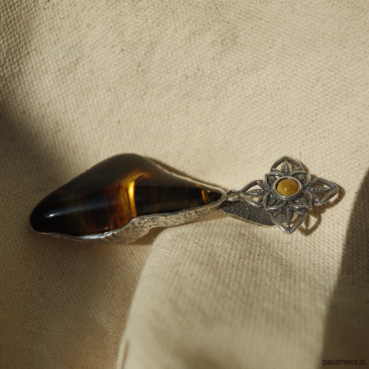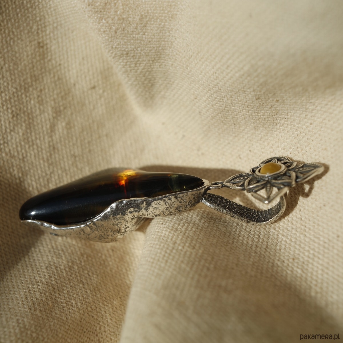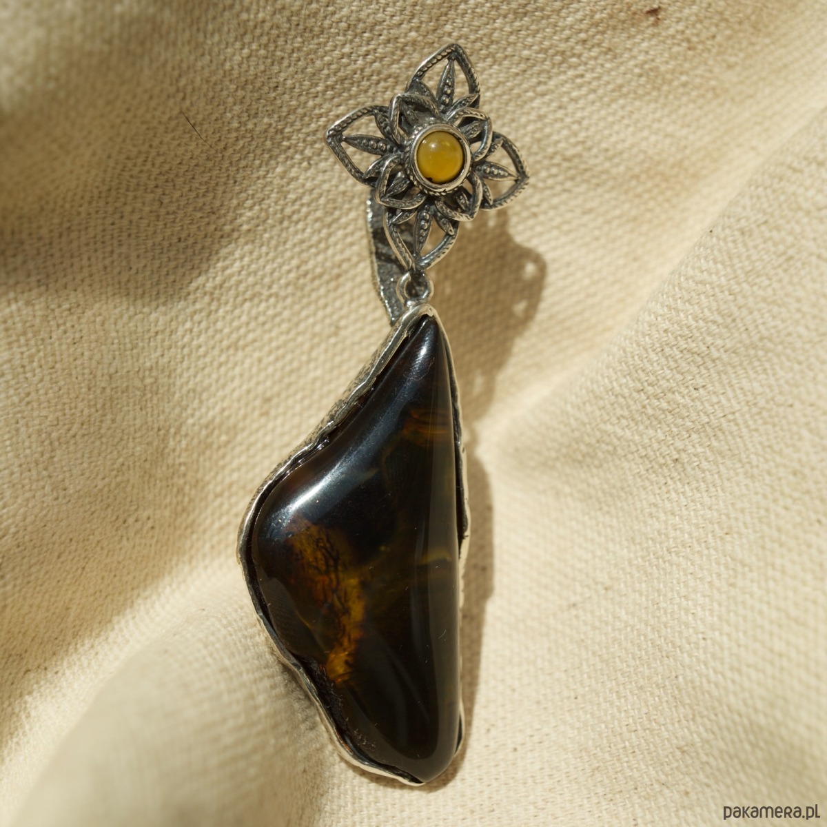 Niepowtarzalny wisiorek wykonany ręcznie w naszej pracowni w Gdańsku. Duży bursztyn w głębokim, ciemnym odcieniu skrywa w sobie niezwykłą grę barw, która ujawnia się w zależności od kąta padania światła - od złocistych refleksów po głębokie brązy. Oprawa ze srebra próby 925 zdobiona jest motywem kwiatowym z drobnym bursztynem w ciepłym, mlecznym odcieniu, co nadaje całości elegancki i unikatowy charakter.