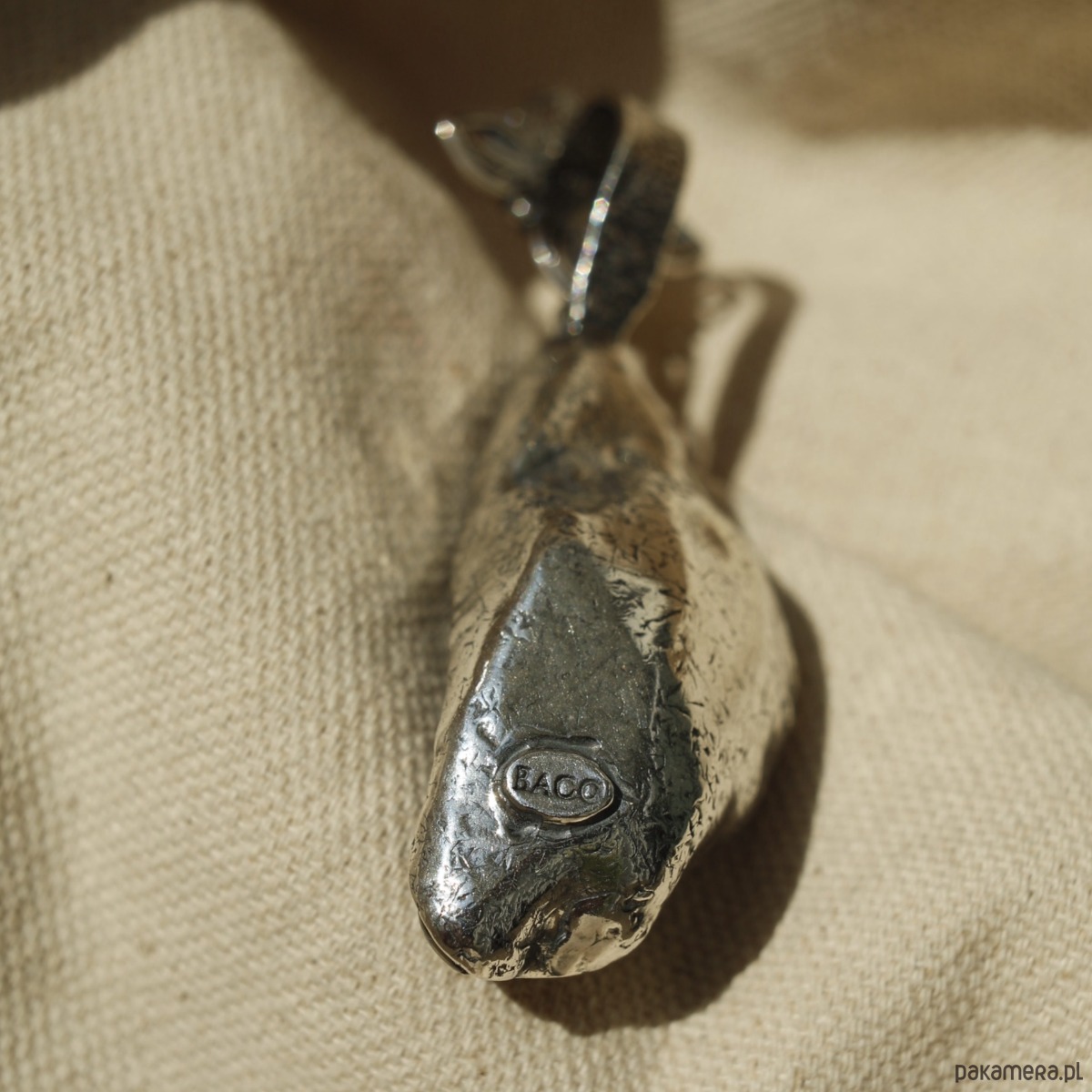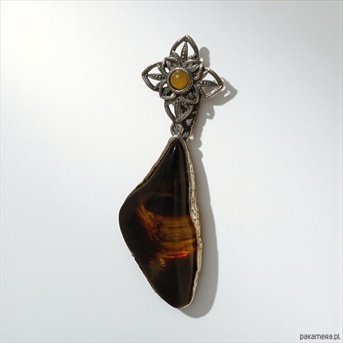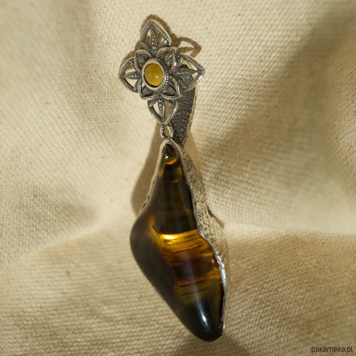 Niepowtarzalny wisiorek wykonany ręcznie w naszej pracowni w Gdańsku. Duży bursztyn w głębokim, ciemnym odcieniu skrywa w sobie niezwykłą grę barw, która ujawnia się w zależności od kąta padania światła - od złocistych refleksów po głębokie brązy. Oprawa ze srebra próby 925 zdobiona jest motywem kwiatowym z drobnym bursztynem w ciepłym, mlecznym odcieniu, co nadaje całości elegancki i unikatowy charakter.