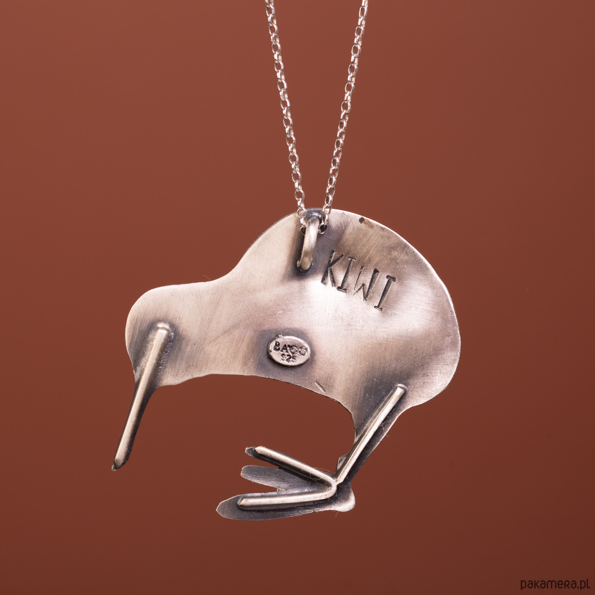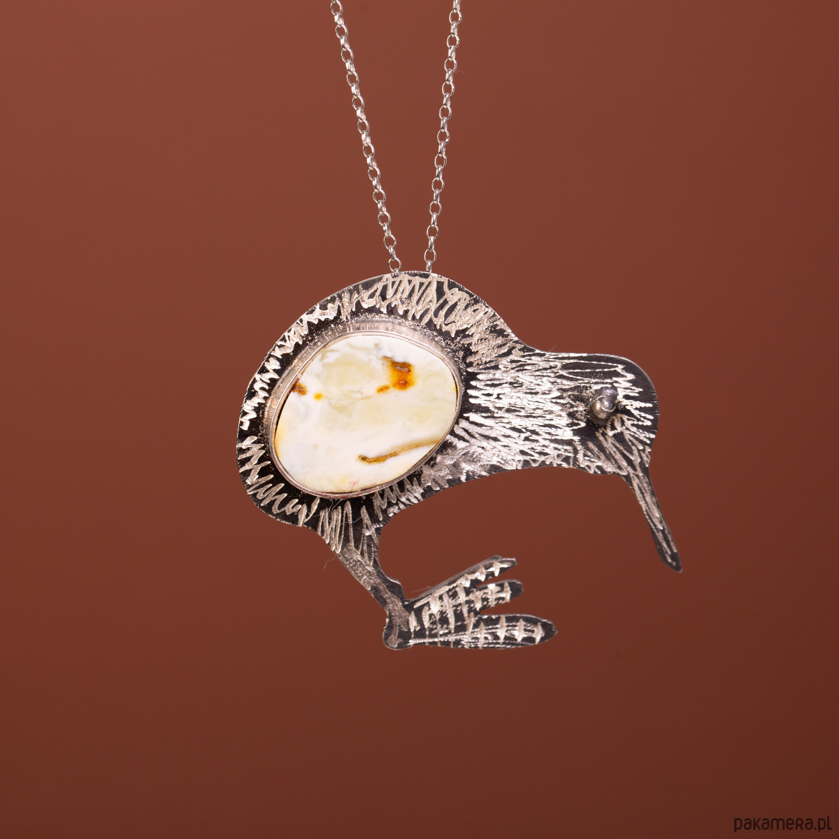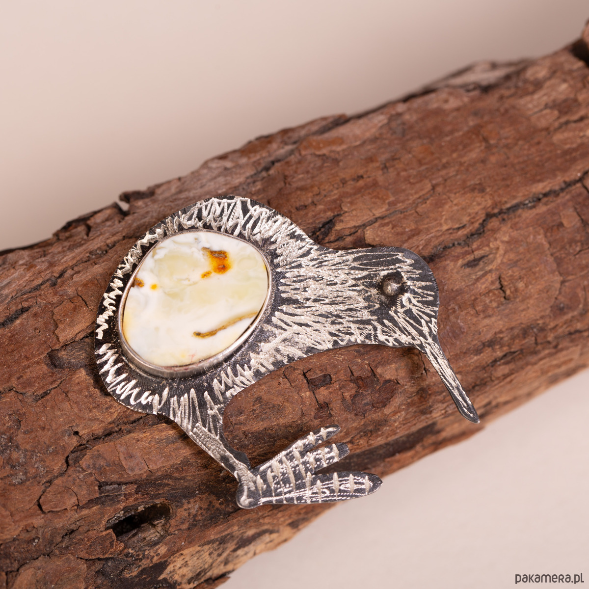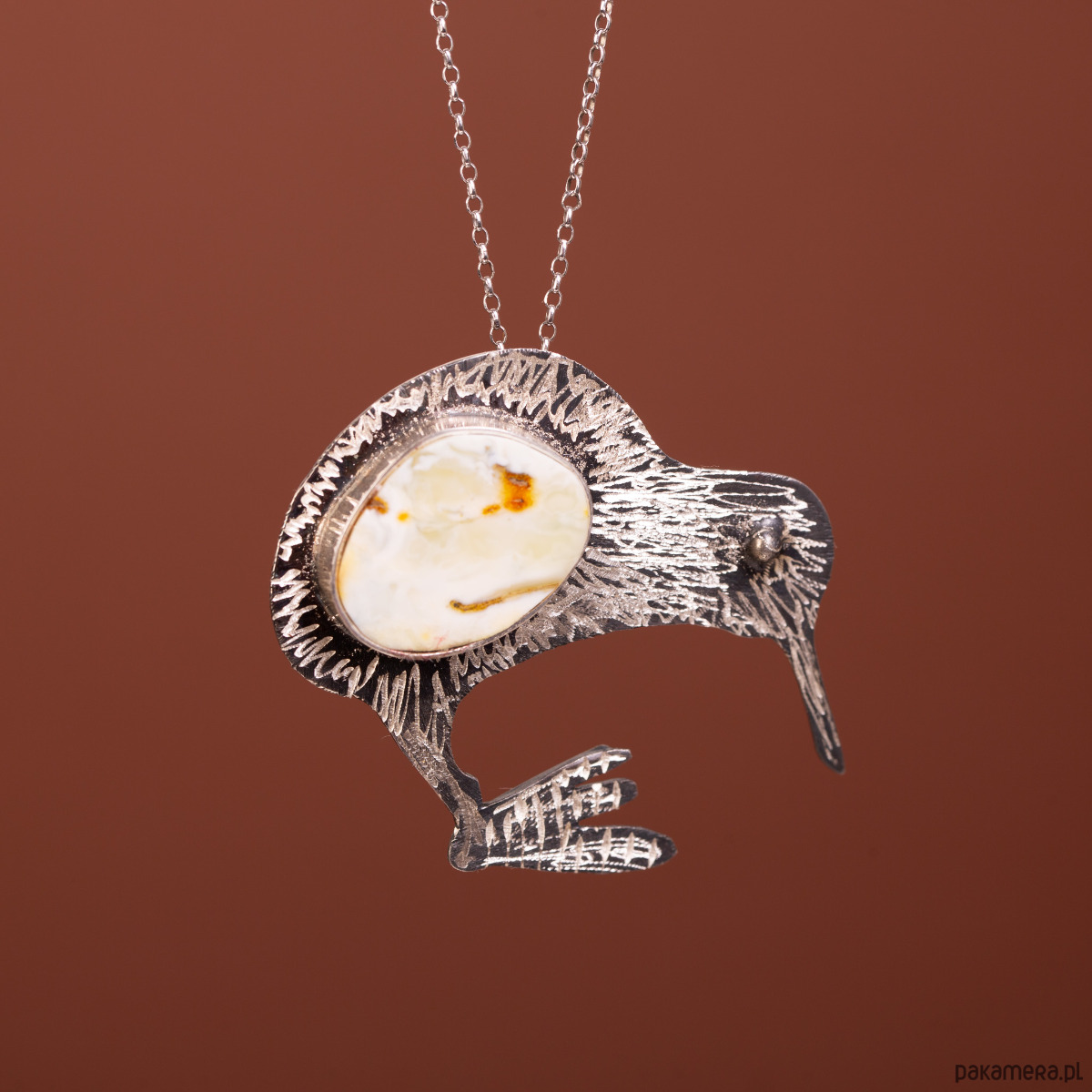 Artystyczny wisiorek wykonany ręcznie ze srebra próby 925, przedstawiający sylwetkę ptaka kiwi. Srebro zostało poddane misternej obróbce – liczne nacięcia i faktura metalu doskonale imitują puszyste upierzenie, a oksydowanie nadało całości głębi i charakteru. W centralnej części wkomponowano naturalny, mleczny bursztyn bałtycki o owalnym kształcie, który dzięki swojej jasnej barwie pięknie kontrastuje z surowym srebrem.