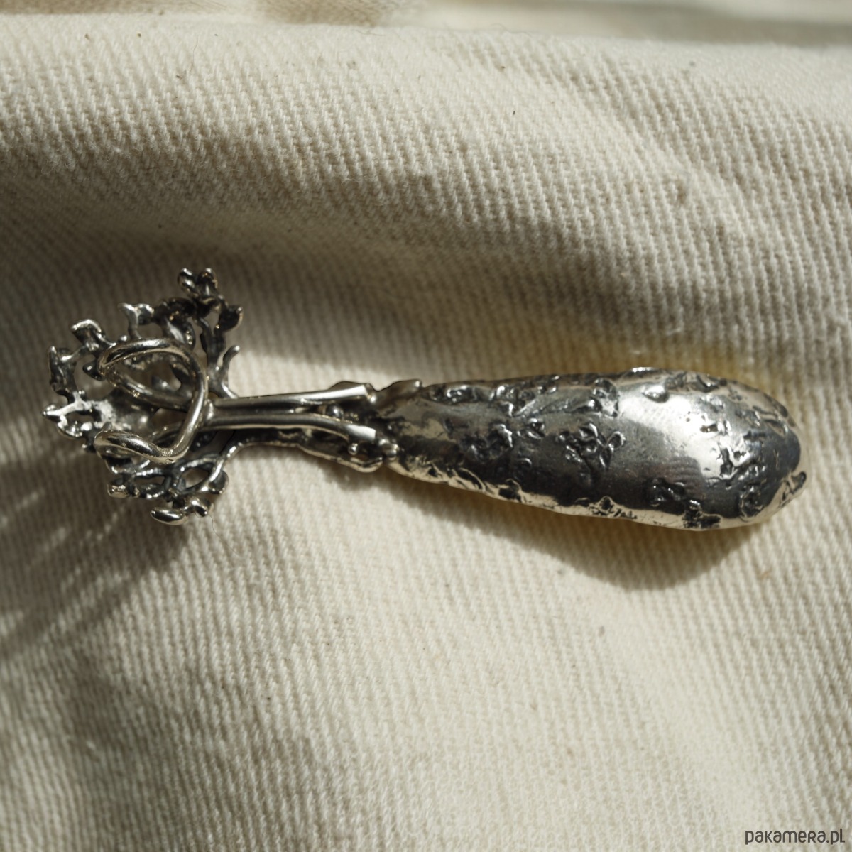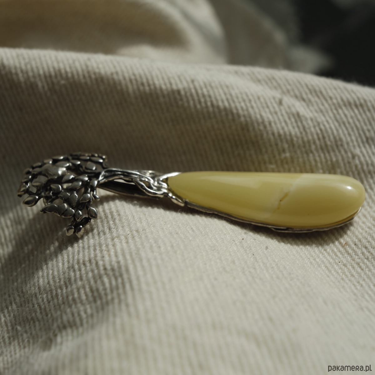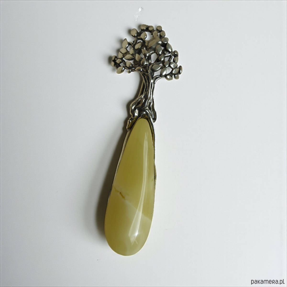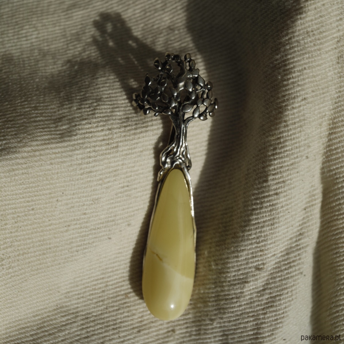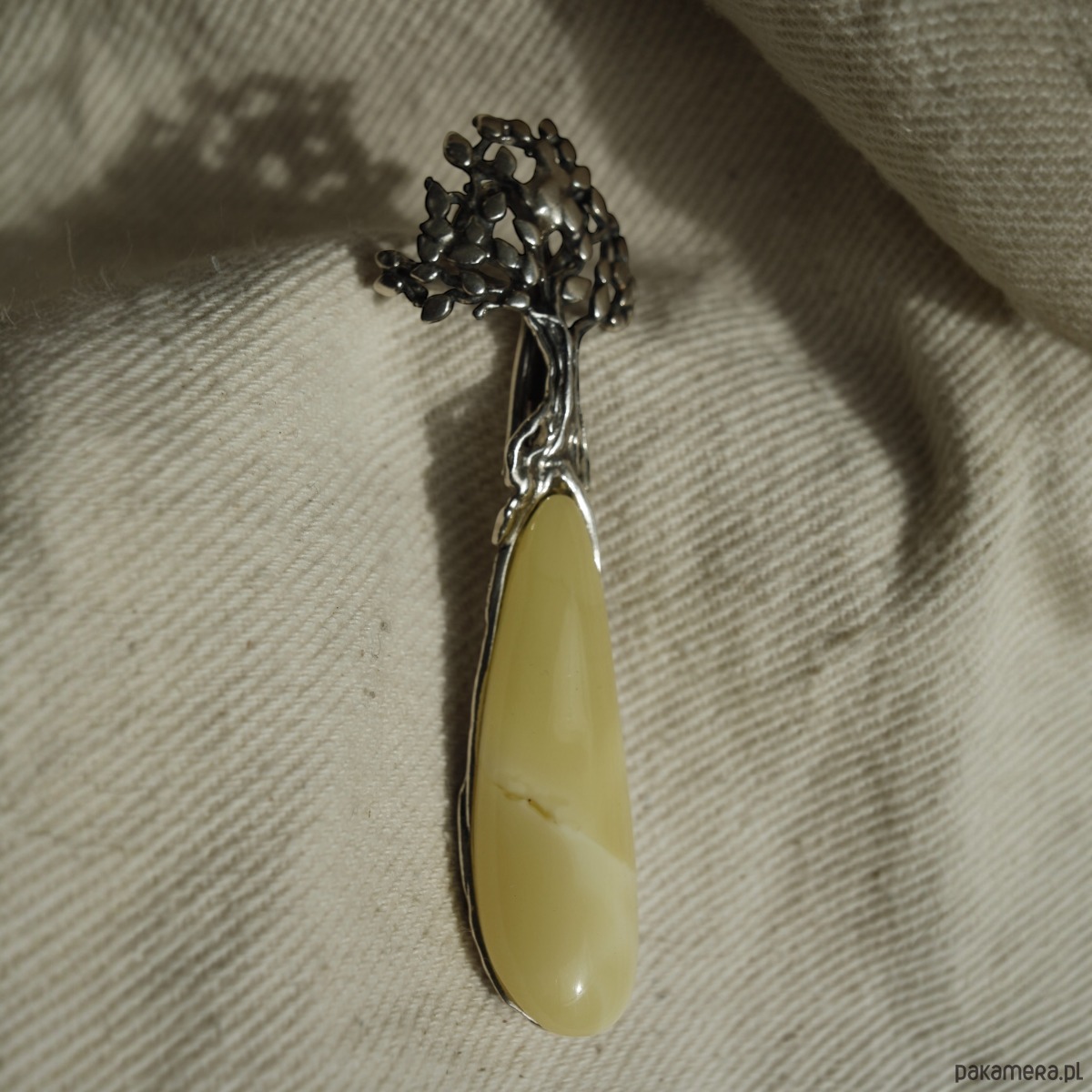 Ręcznie wykonany wisiorek ze srebra próby 925, ozdobiony dużym bursztynem w mlecznym odcieniu. Dekoracyjne wykończenie w formie rzeźbionego drzewa przyciąga wzrok i dodaje biżuterii wyjątkowego charakteru.