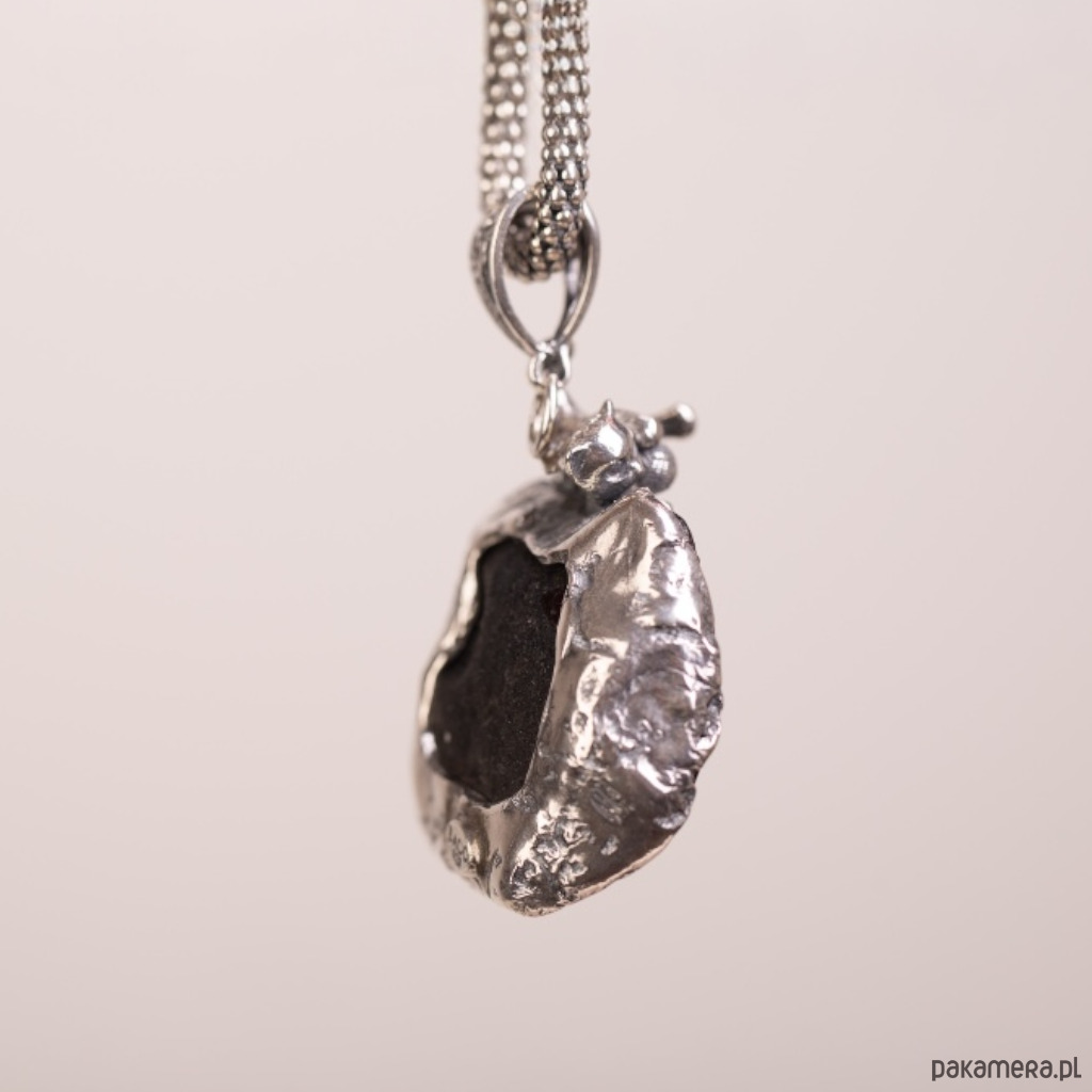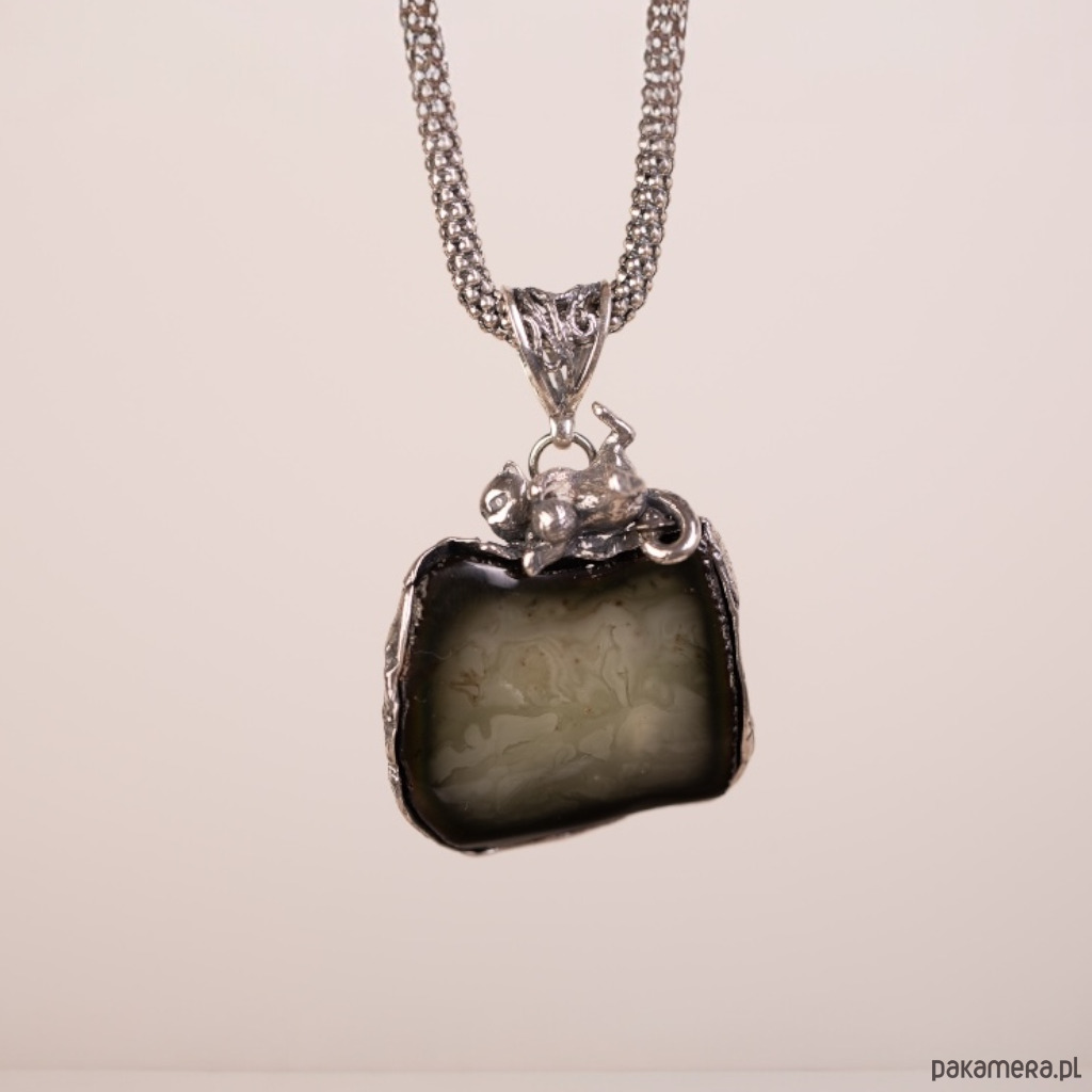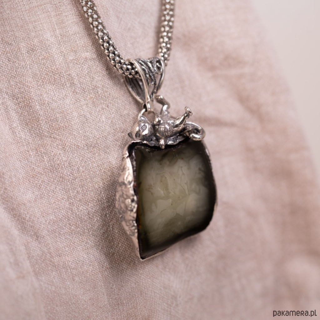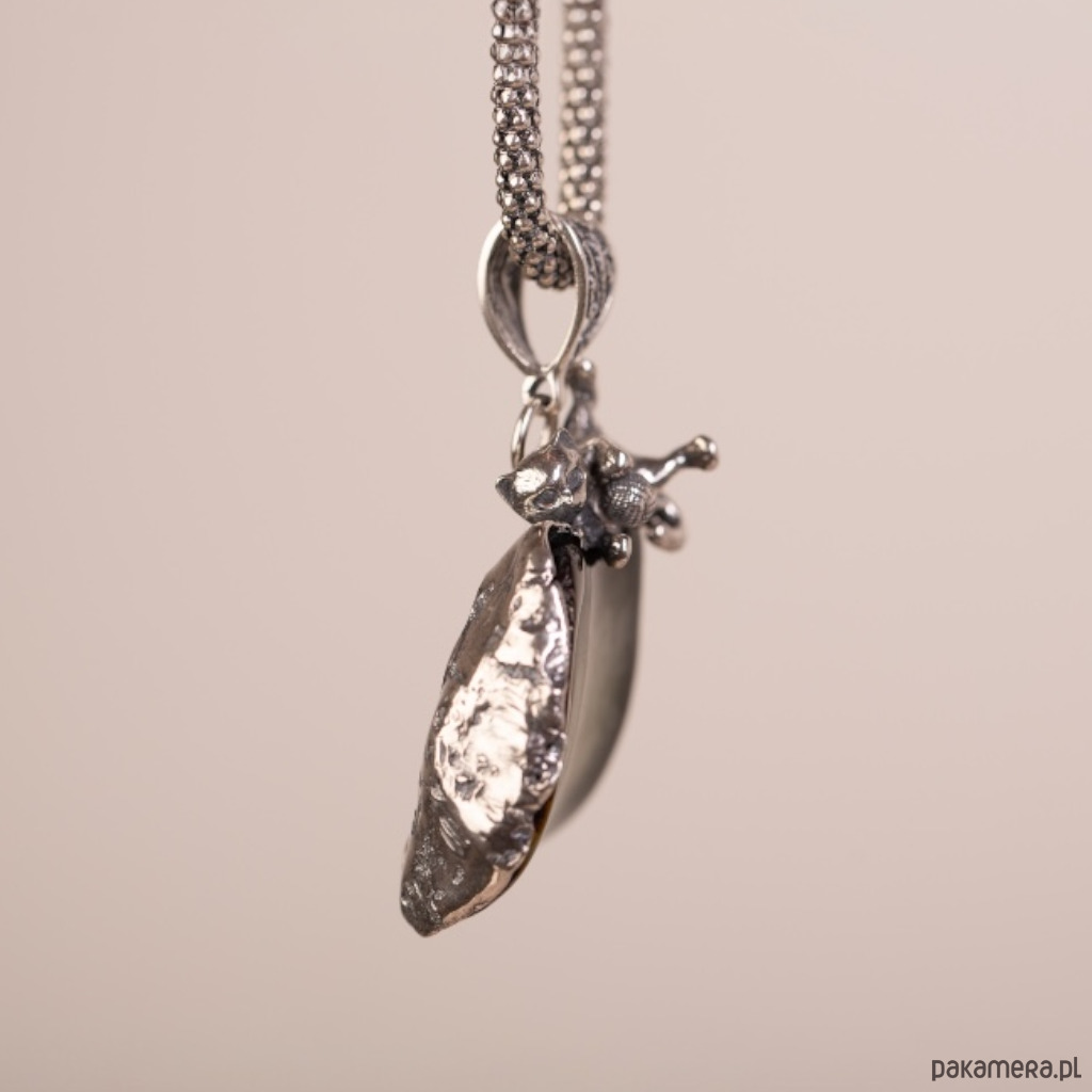 Ręcznie wykonany wisiorek ze srebra z dużym bursztynem o miękkiej, lekko zamglonej barwie. Na górze oprawy wyleguje się srebrny kotek z kłębkiem, dzięki czemu biżuteria ma lekko żartobliwy, ale wciąż elegancki charakter. To wyrazisty naszyjnik, który od razu przyciąga wzrok i świetnie pasuje do prostych, jednolitych stylizacji.