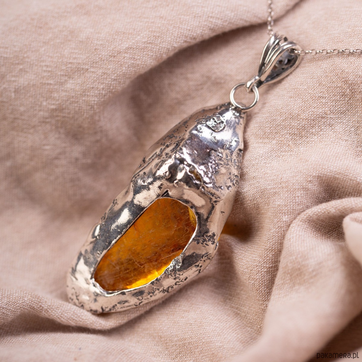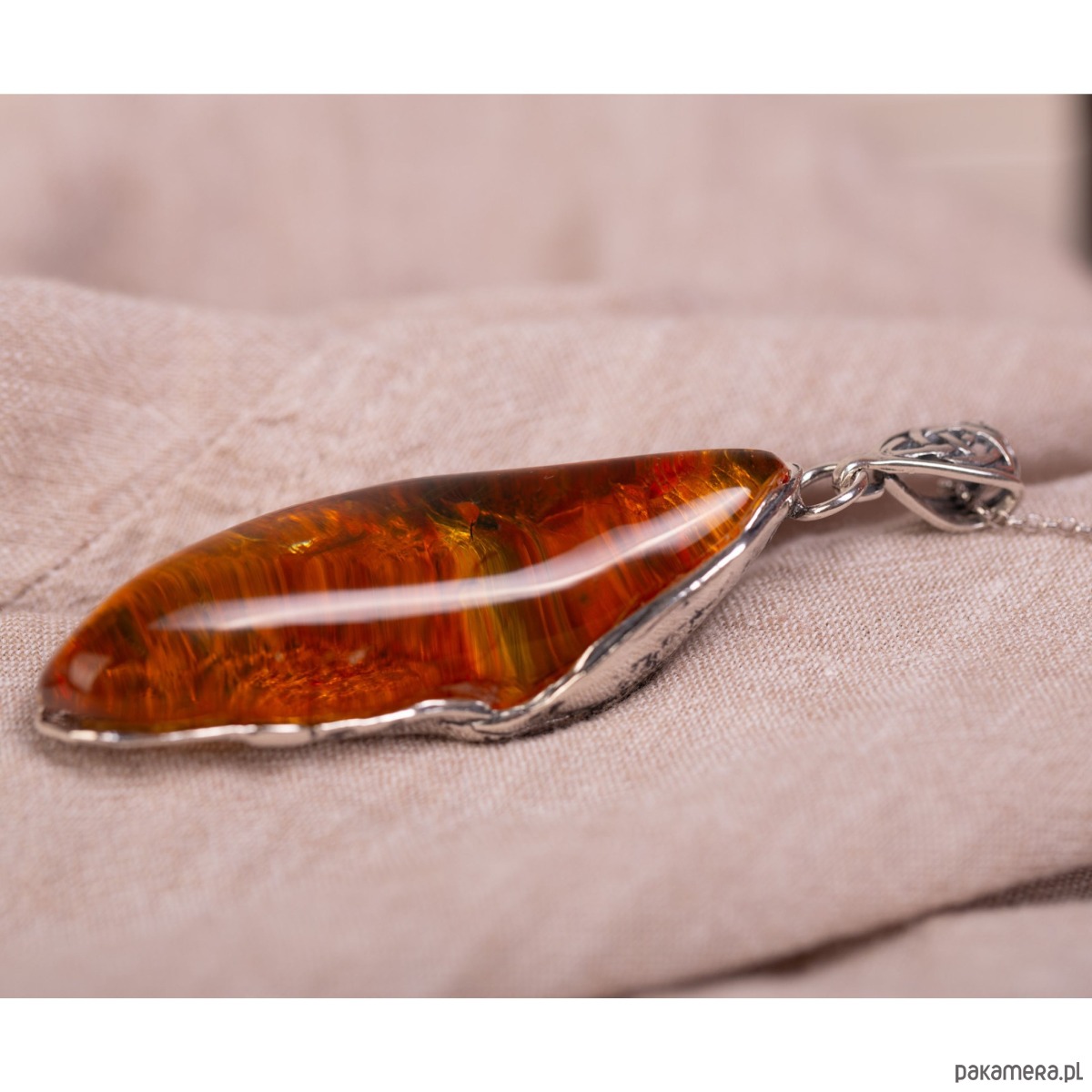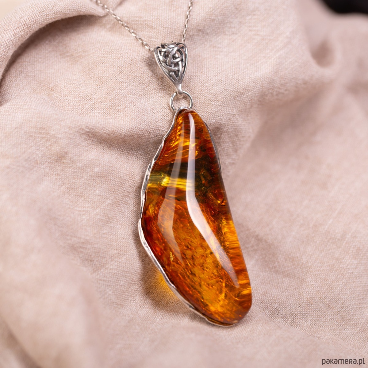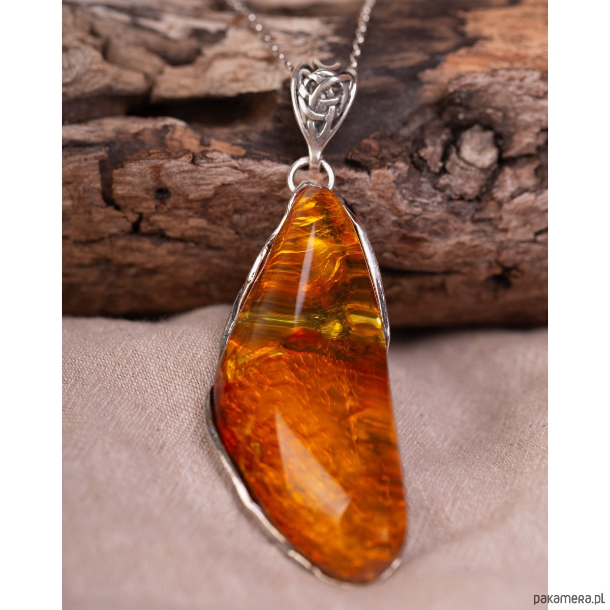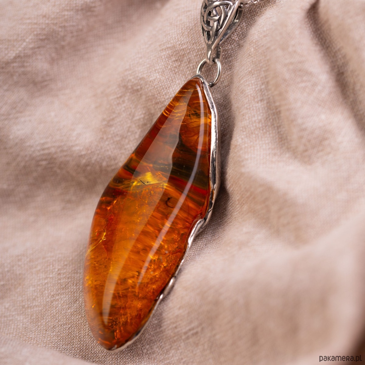 Wisior z naturalnego bursztynu bałtyckiego o imponującej, smukłej formie, ręcznie oprawiony w srebro próby 925. Płomienny bursztyn w odcieniach miodowo‑koniakowych pięknie wydłuża sylwetkę i przy każdym ruchu mieni się głębią barw, tworząc mocny, artystyczny akcent na dekolcie. To biżuteria dla osób, które lubią wyraziste, ale szlachetne formy.