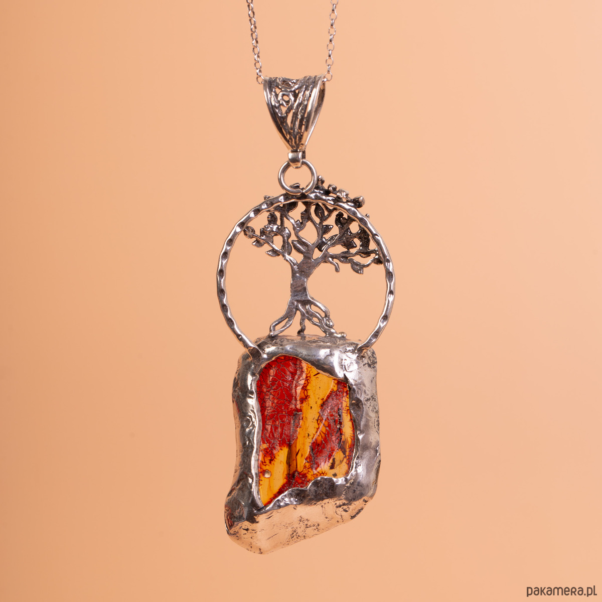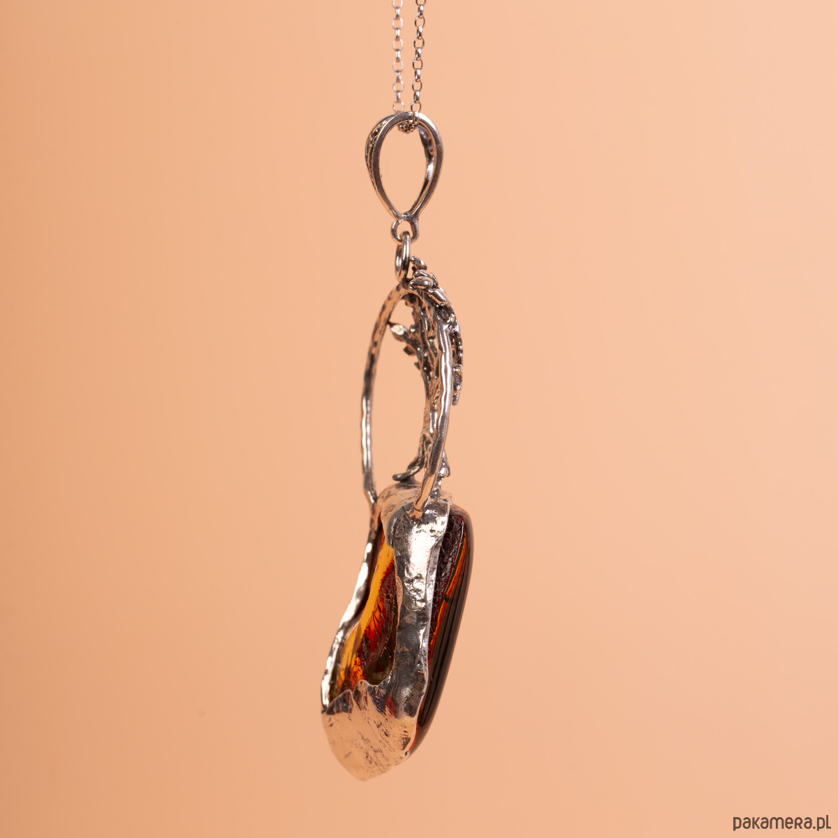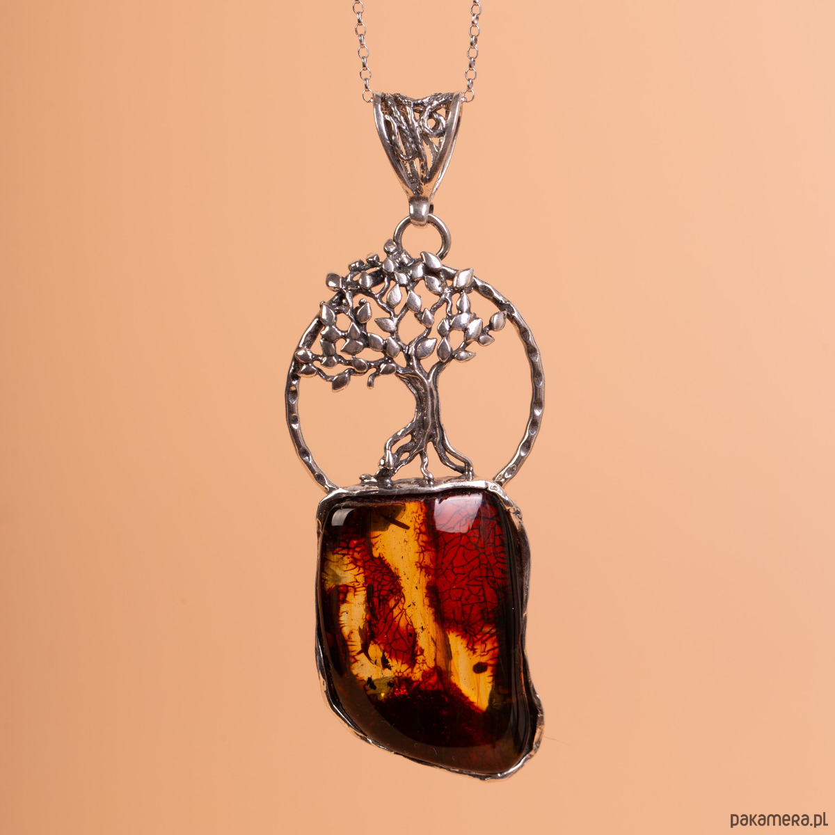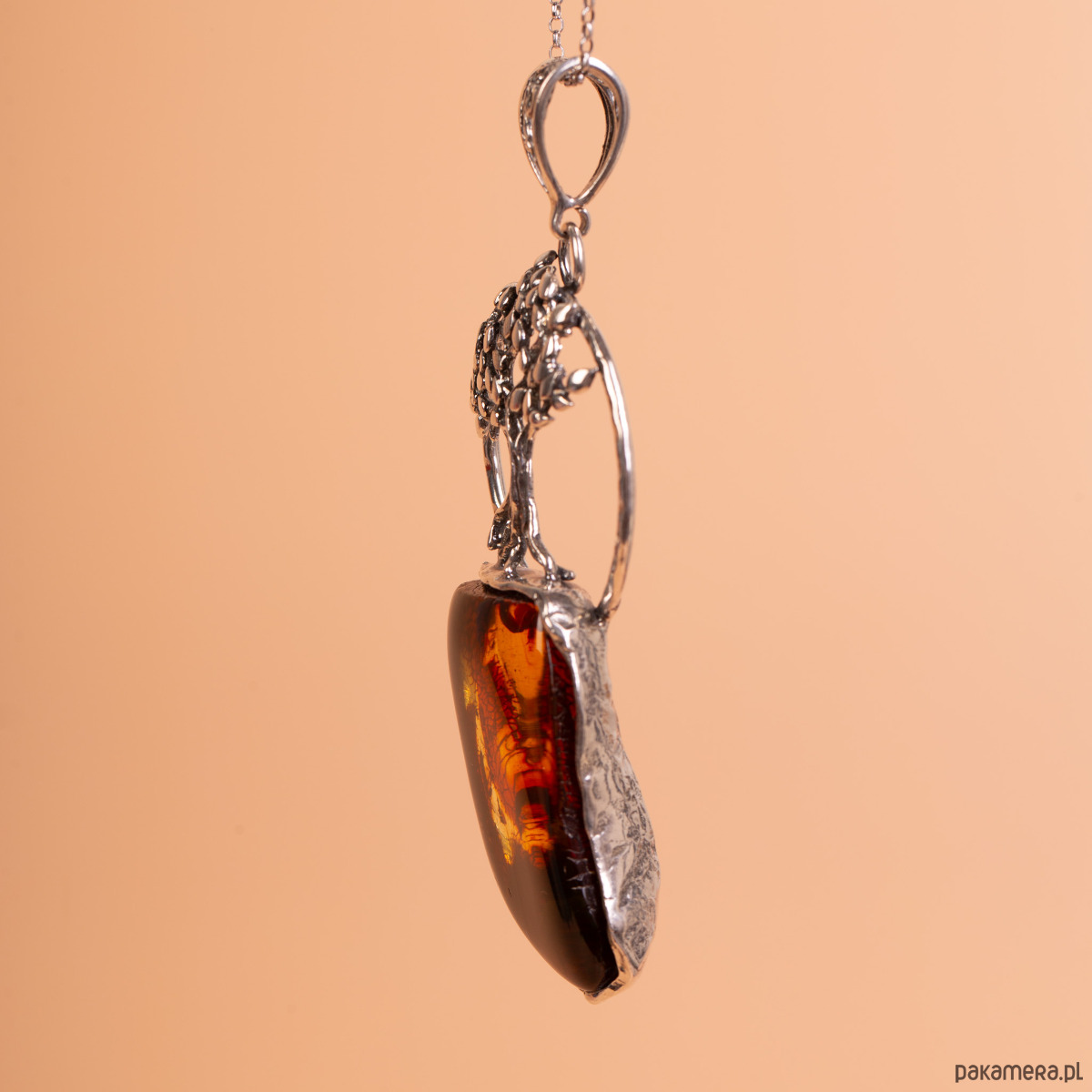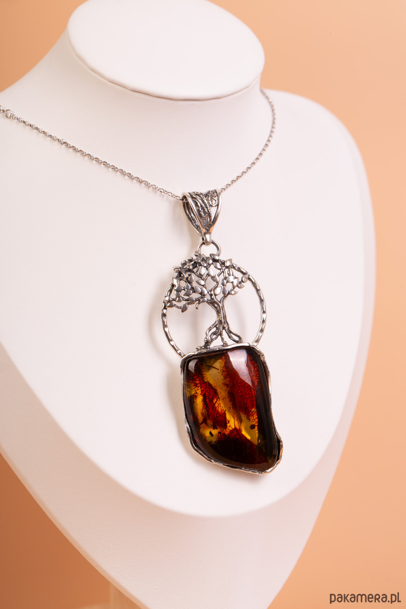 Artystyczny, ręcznie wykonany wisiorek ze srebra próby 925, łączący precyzyjny detal z surową formą bursztynu. Centralnym elementem projektu jest bryła naturalnego bursztynu bałtyckiego o nieregularnym kształcie i unikatowym wybarwieniu – od głębokiej, ciemnej wiśni po świetliste, miodowe smugi. Nad bursztynem znajduje się misternie wykonany w srebrze motyw drzewa, którego korzenie łączą się bezpośrednio z oprawą bałtyckiej żywicy.