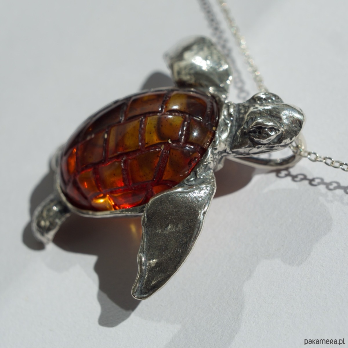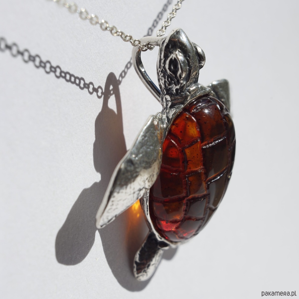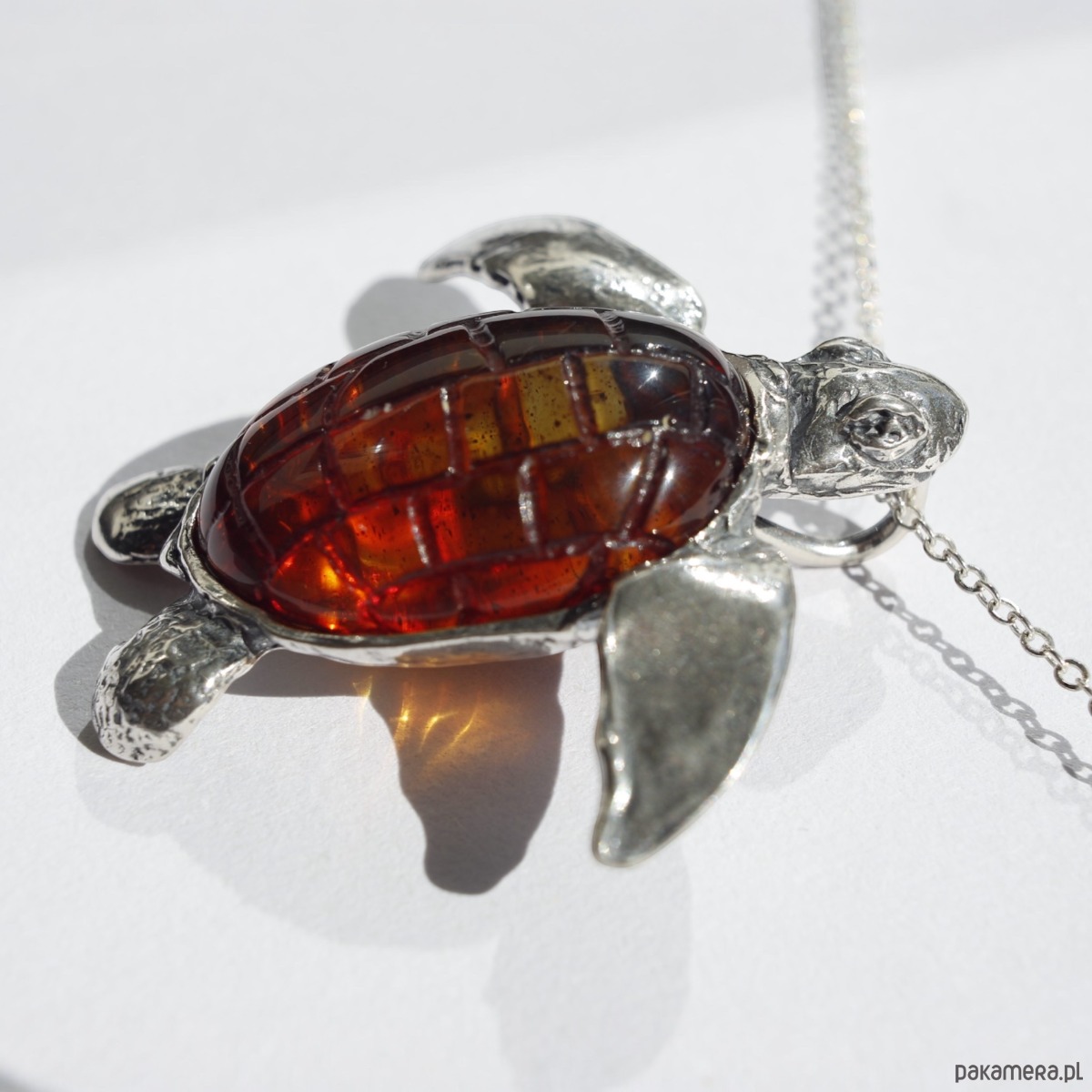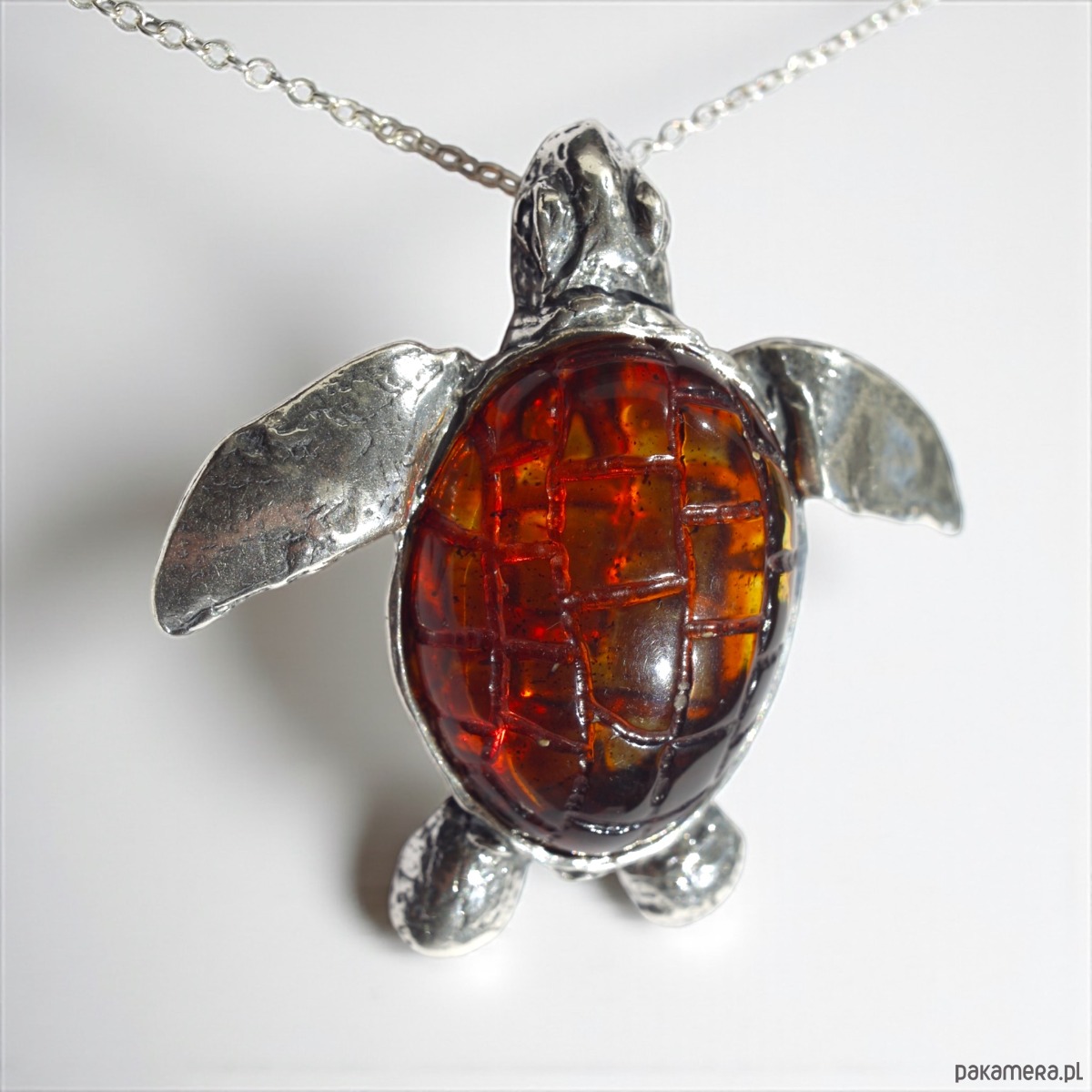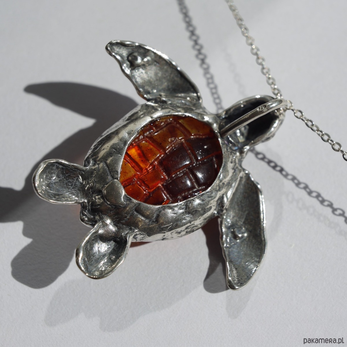 Ręcznie wykonany wisiorek w kształcie żółwia morskiego. Skorupa została wypełniona naturalnym bursztynem bałtyckim w koniakowym odcieniu, którego barwa pięknie współgra ze srebrem. Oryginalna forma sprawia, że to biżuteria, która wyróżnia się w każdej stylizacji.