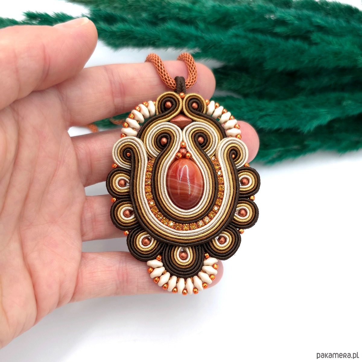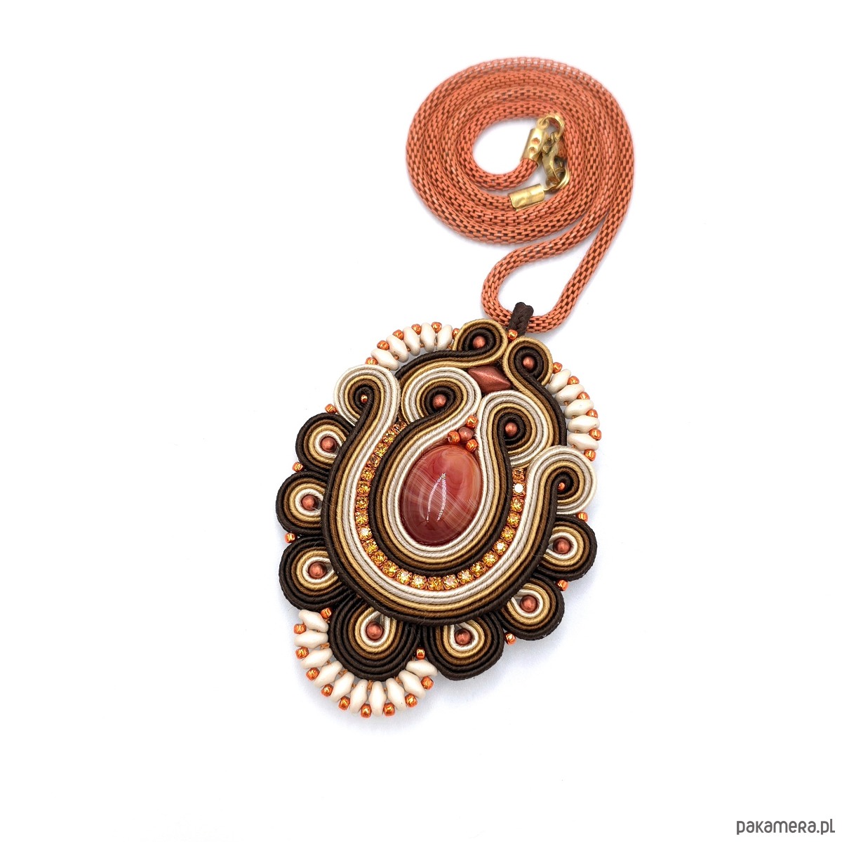 Ręcznie wykonany, oryginalny wisiorek sutasz z agatem, który przyciąga wzrok eleganckim połączeniem barw: śmietanki, złota, brązu, beżu oraz rudego.