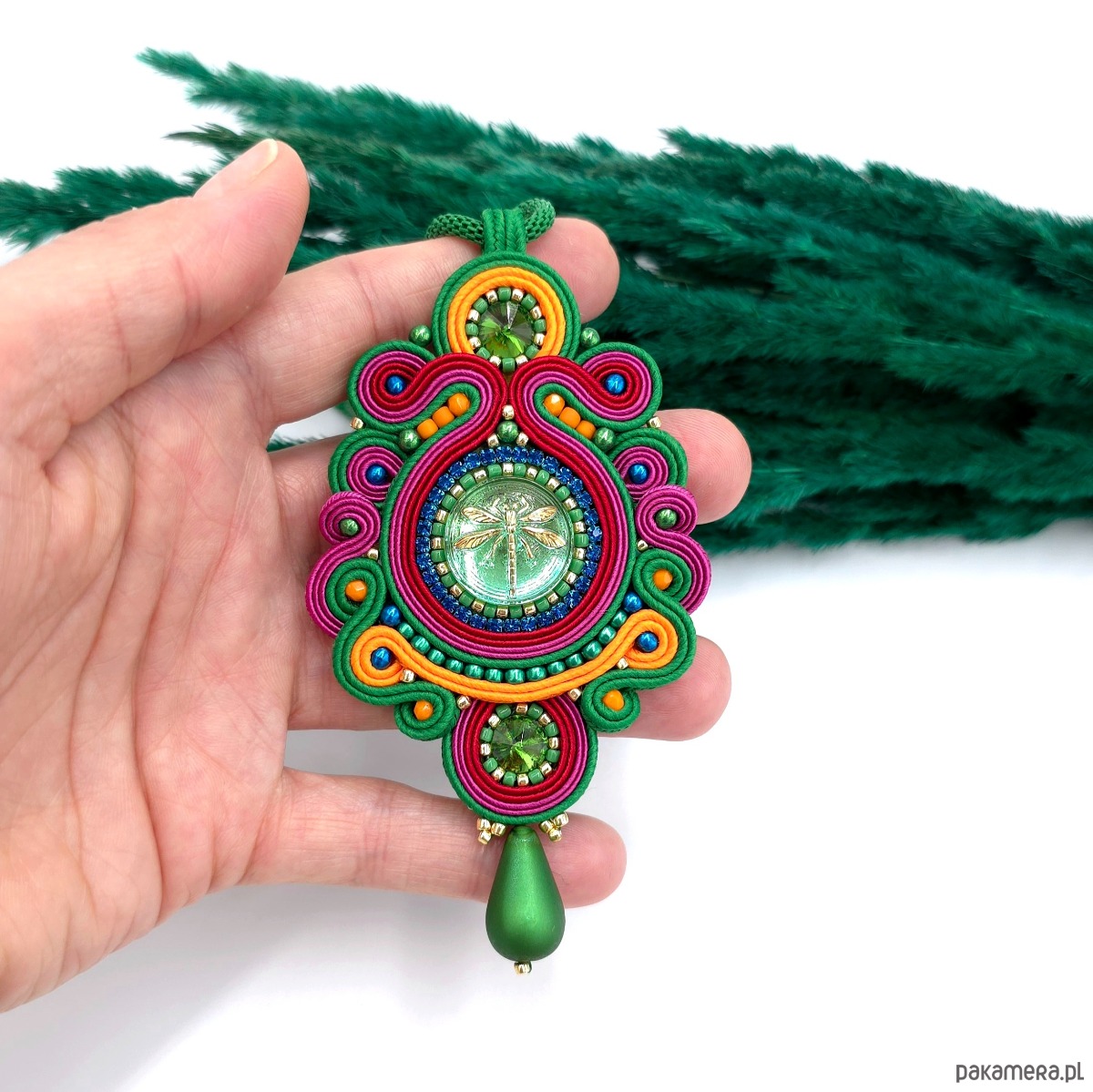 Ten ręcznie wykonany wisiorek sutasz to wyjątkowa, kolorowa biżuteria artystyczna, która przyciąga spojrzenia i dodaje energii każdej stylizacji.