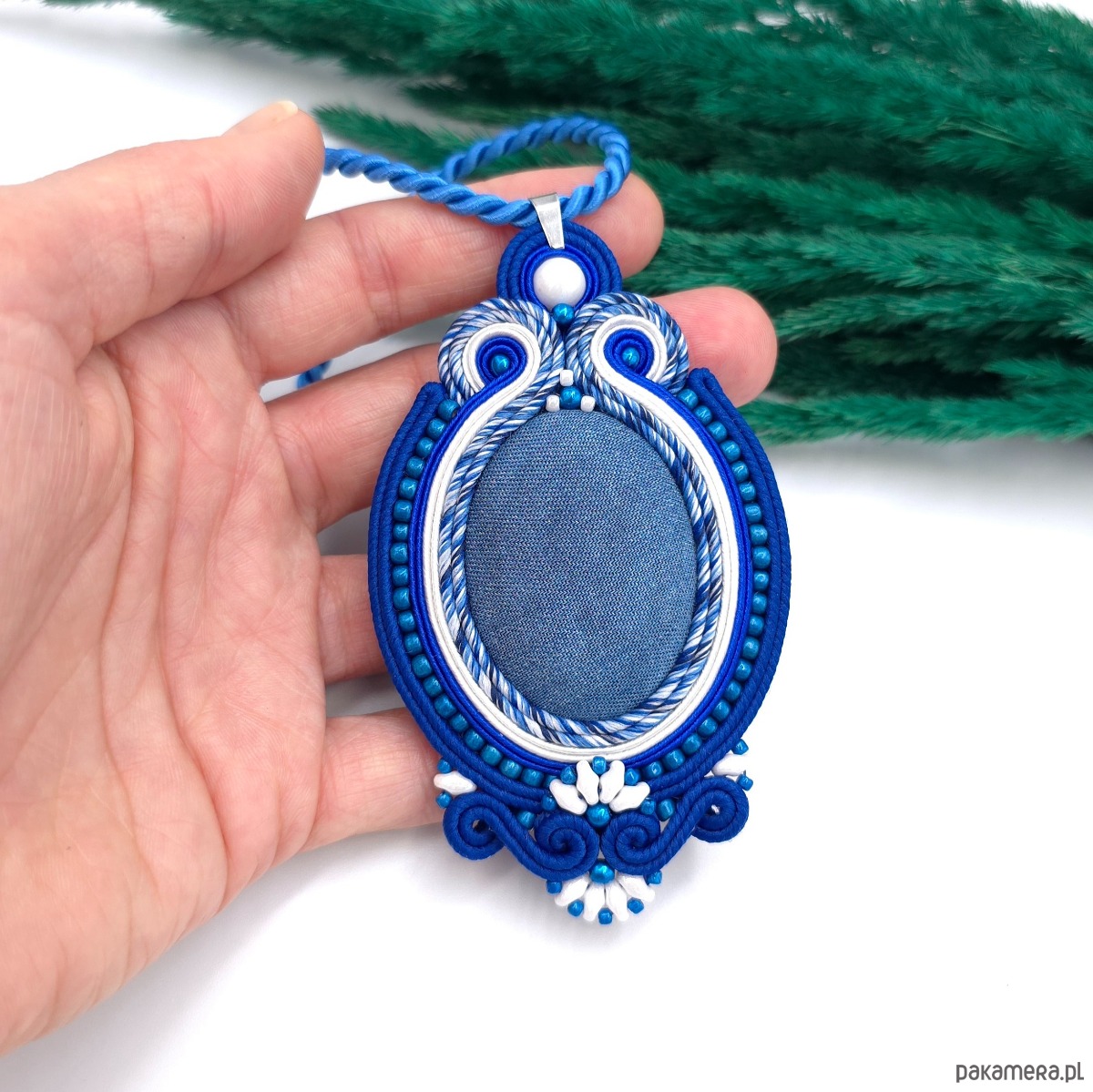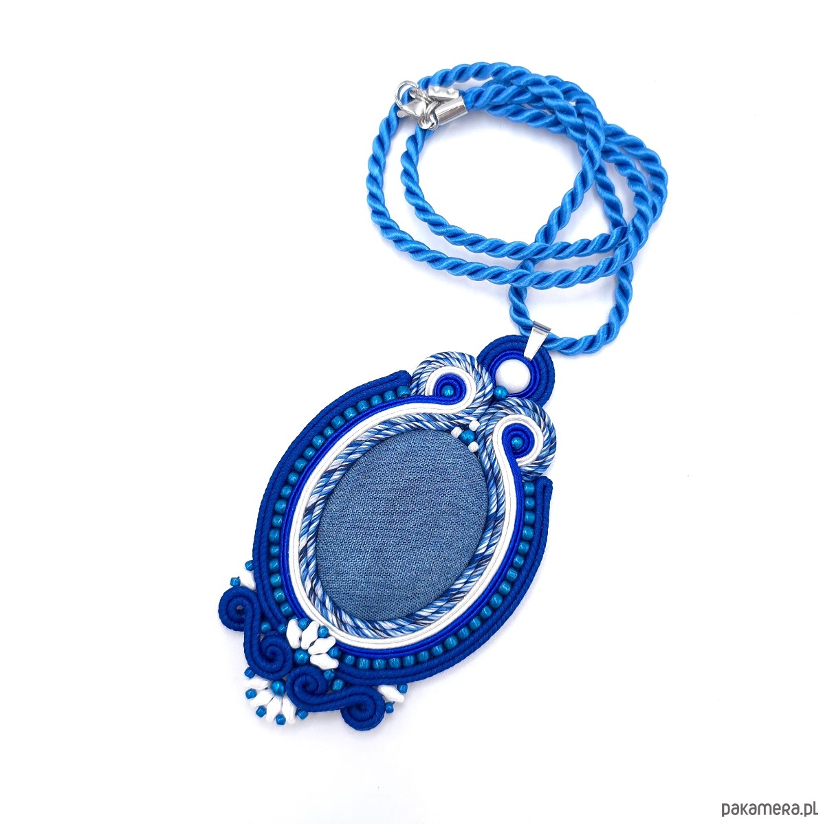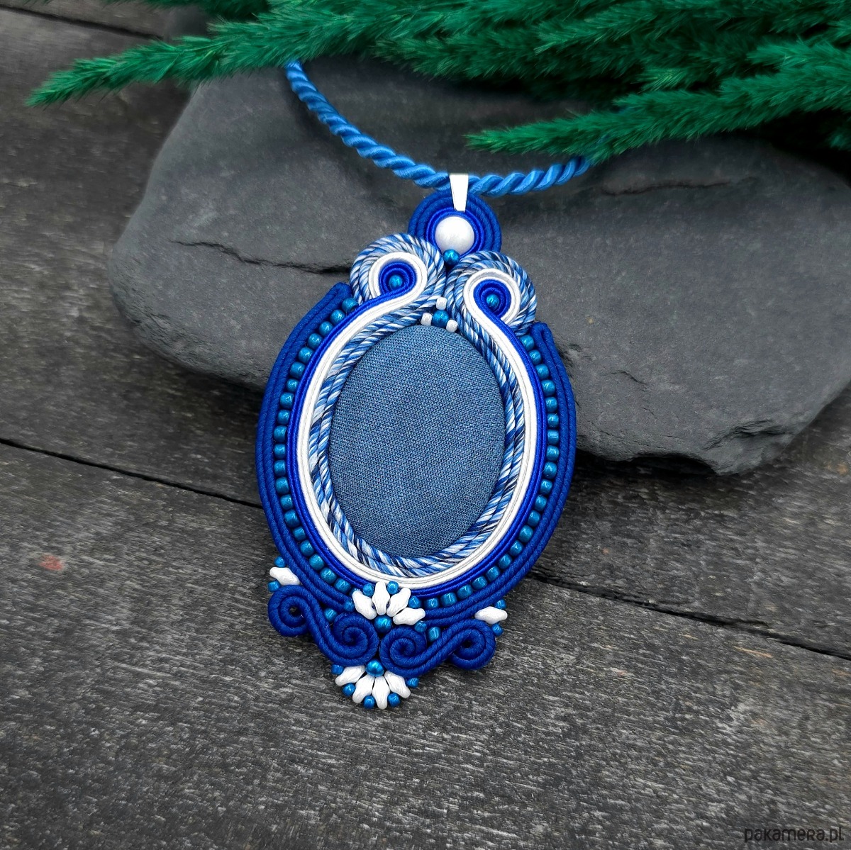 Ten wyjątkowy wisiorek został wykonany techniką sutasz i ozdobiony centralnym elementem z dżinsu, co nadaje mu nowoczesny, a zarazem casualowy charakter.