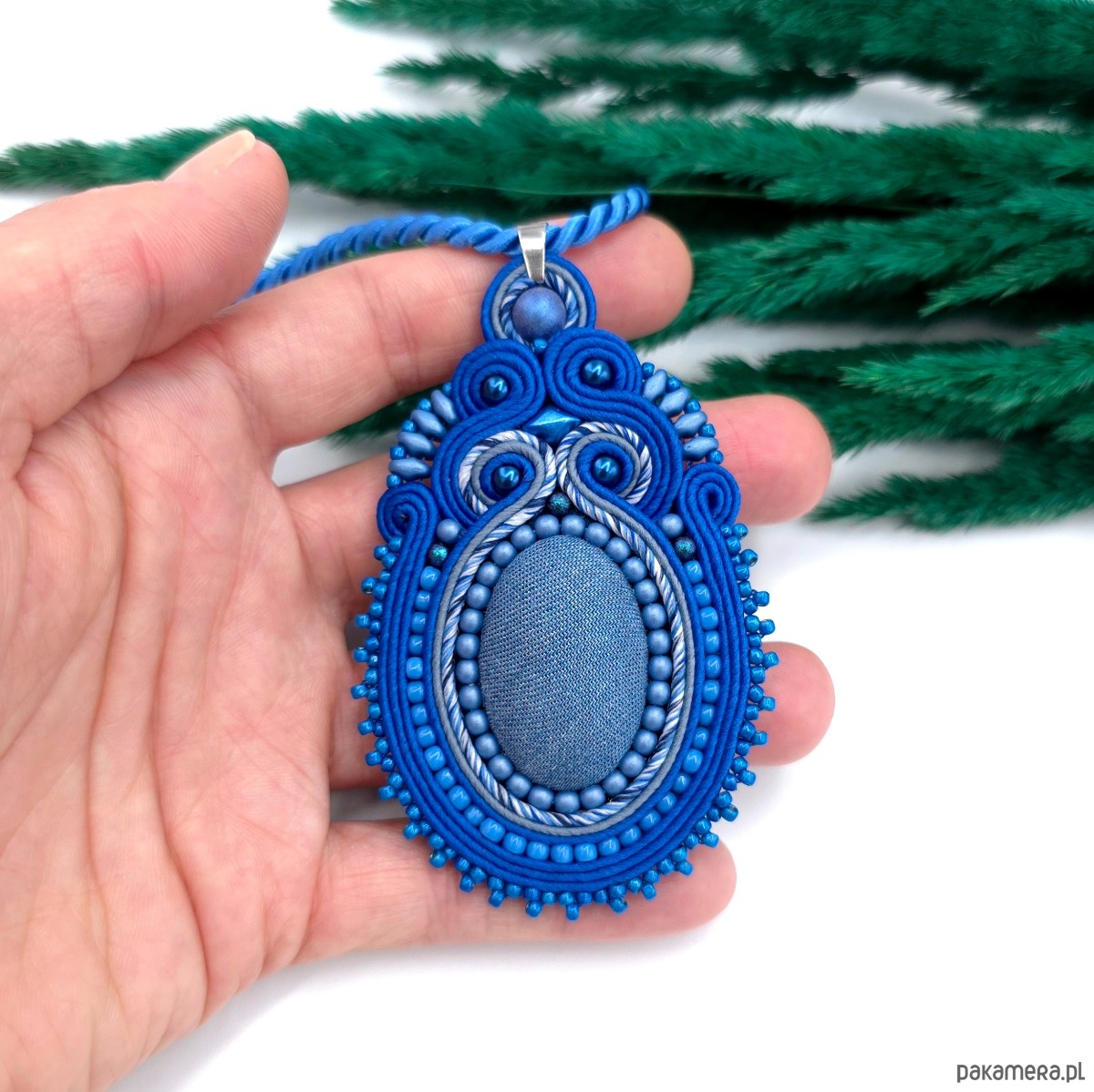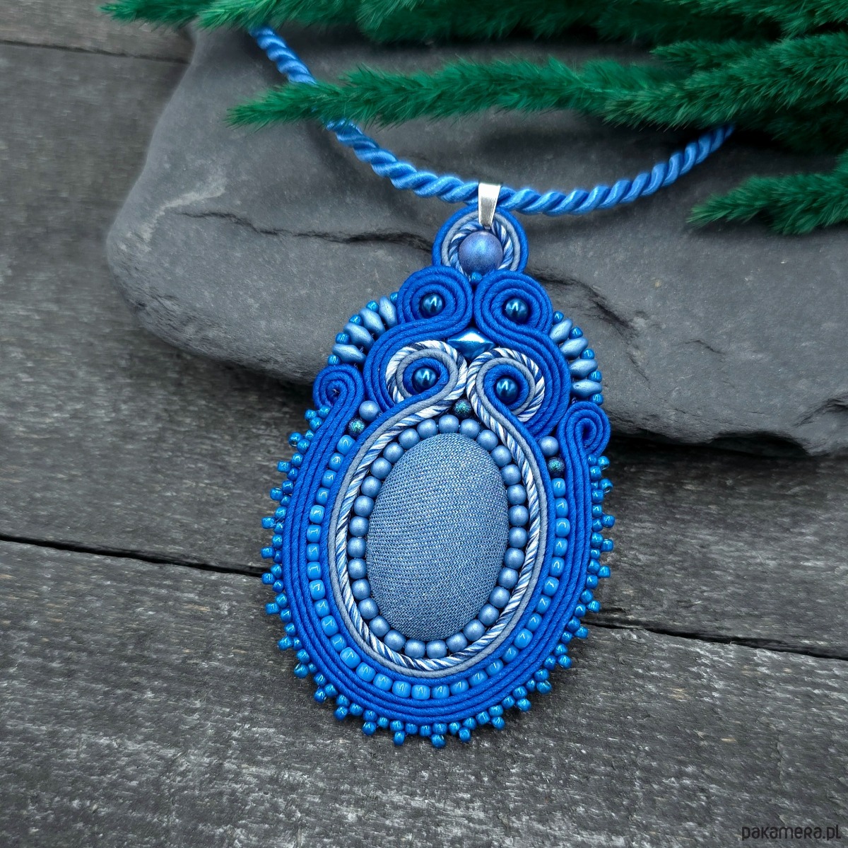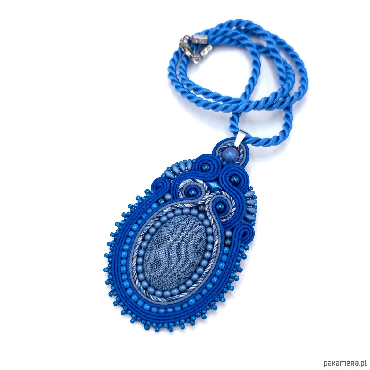 Ten wyjątkowy wisiorek został wykonany techniką sutasz i ozdobiony centralnym elementem z dżinsu, co nadaje mu nowoczesny, a zarazem casualowy charakter.