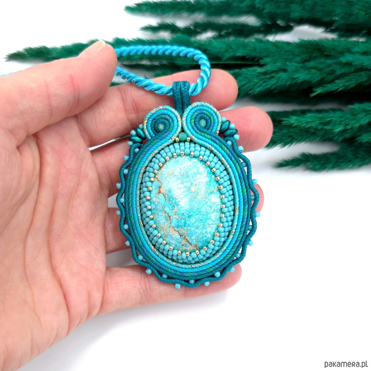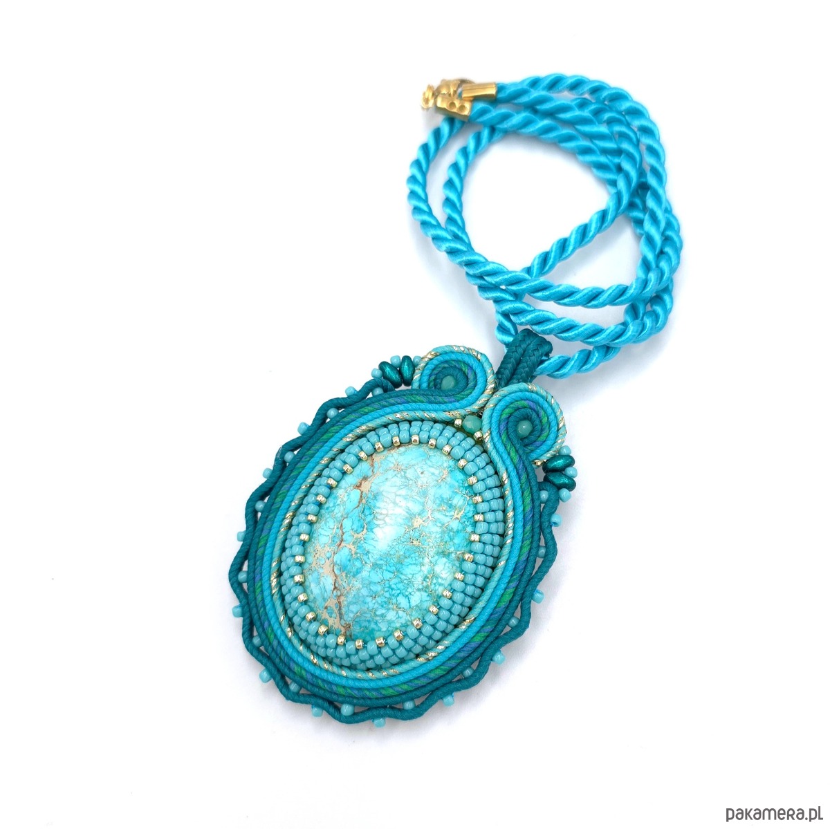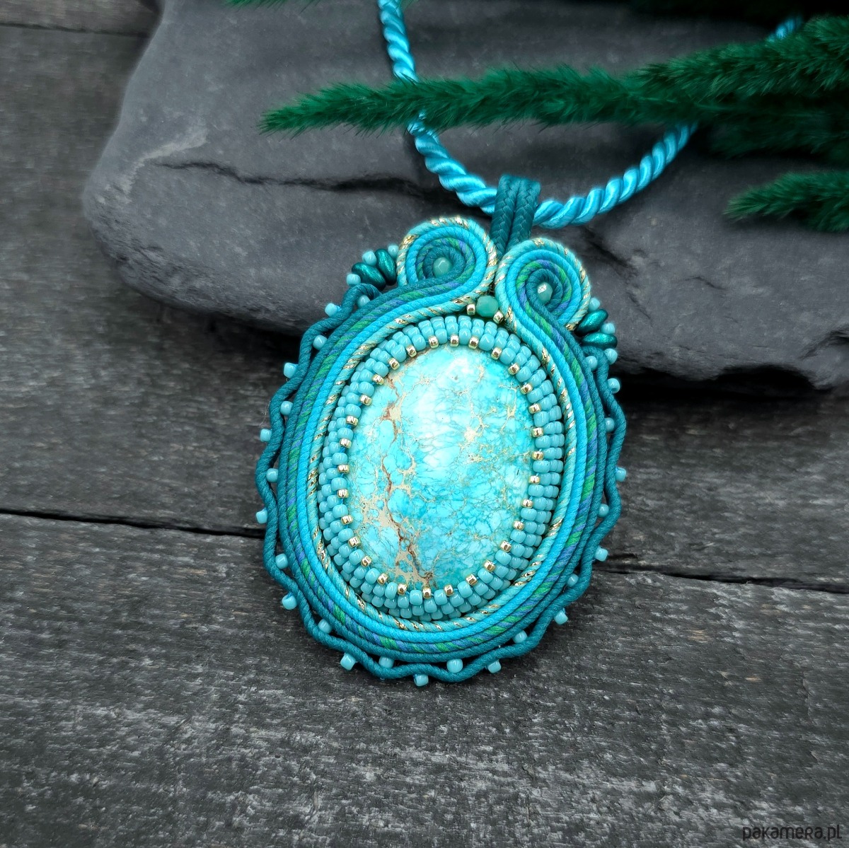Wisiorek z sutaszu w różnych odcieniach turkusu, z dużym kamieniem jaspisu lazurowe wybrzeże.