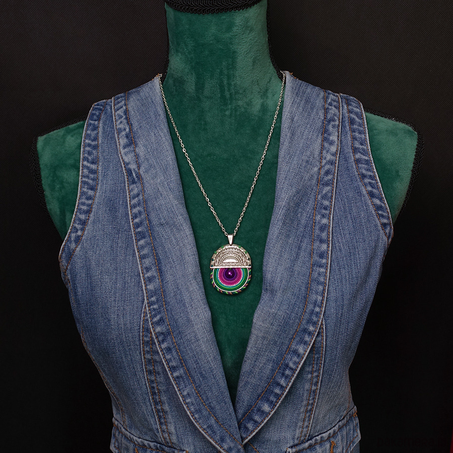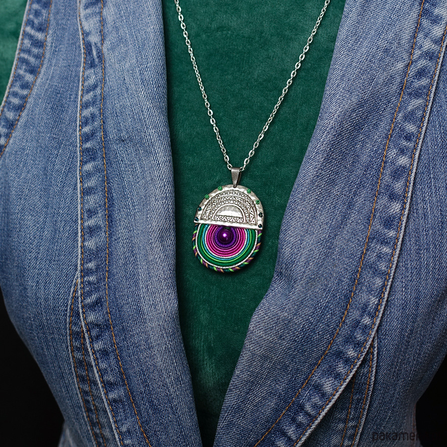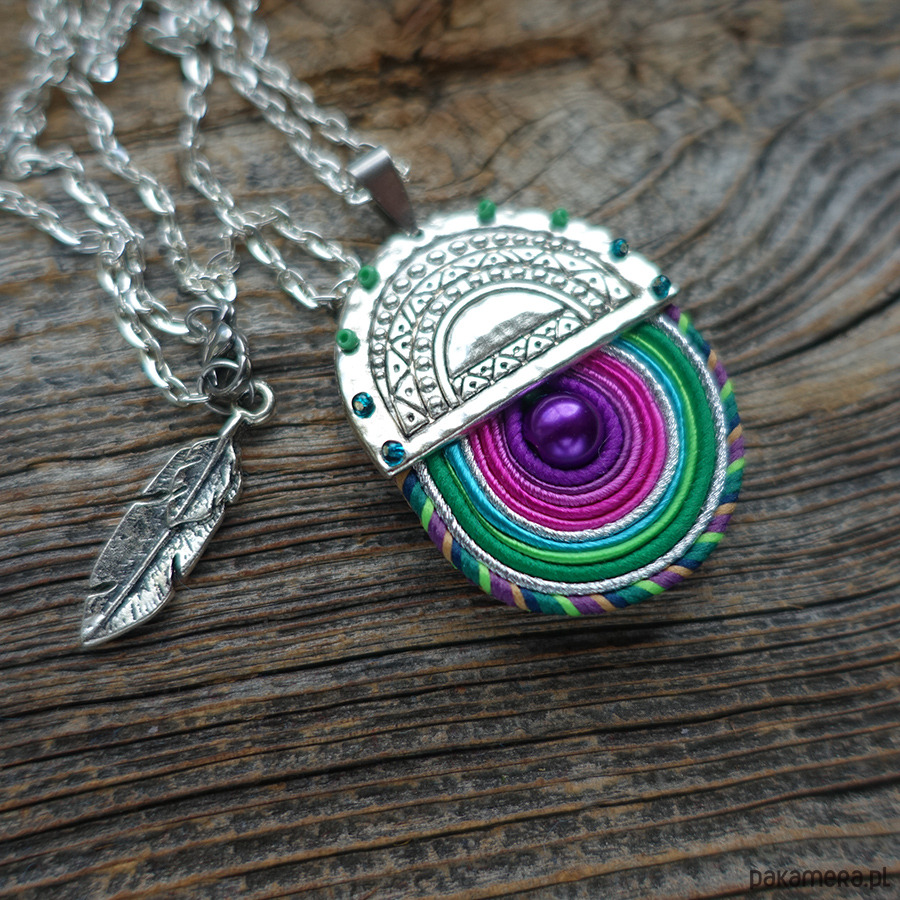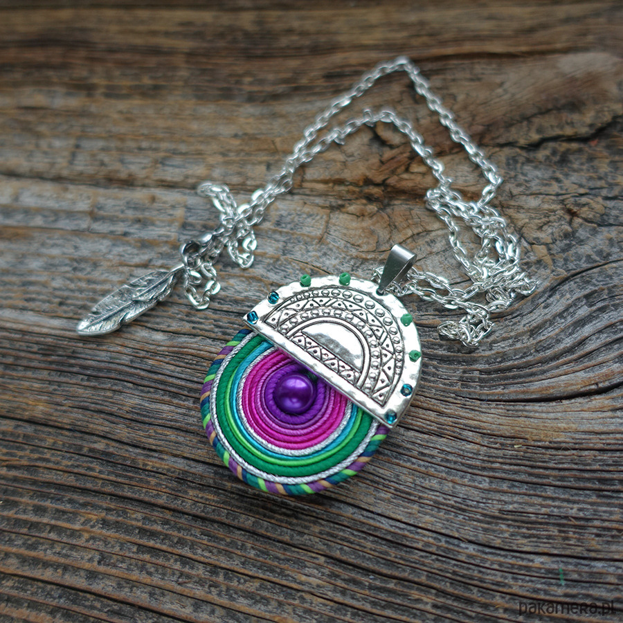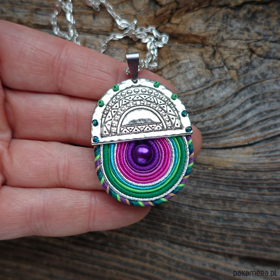 Ręcznie wykonany wisiorek w technice soutache to połączenie klasycznego srebra z barwnym detalem, który przyciąga spojrzenia, ale nie dominuje stylizacji. Geometryczny, tłoczony element ozdobny współgra z otaczającymi go kolorami – fioletem, zielenią i odcieniami turkusu.