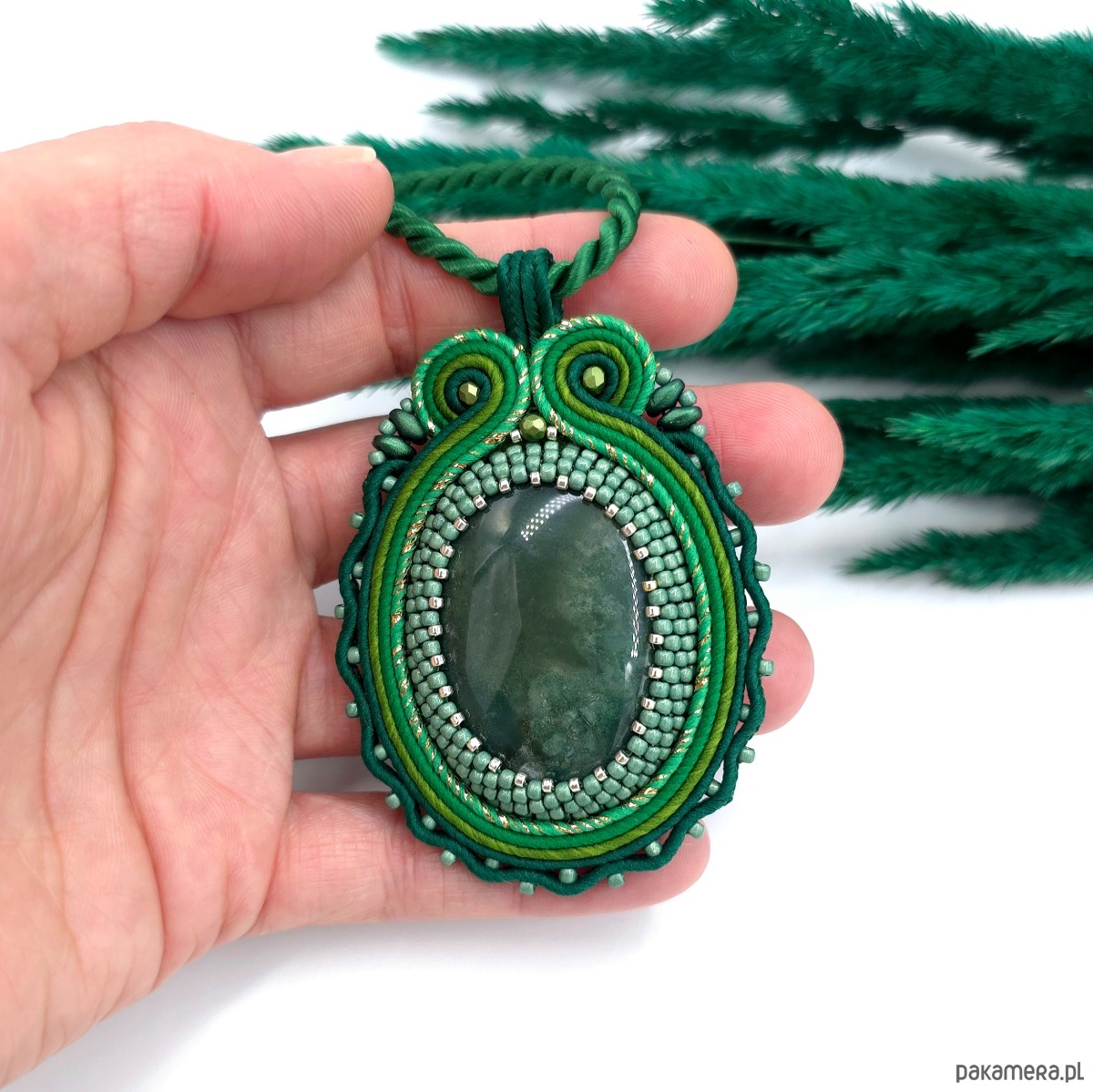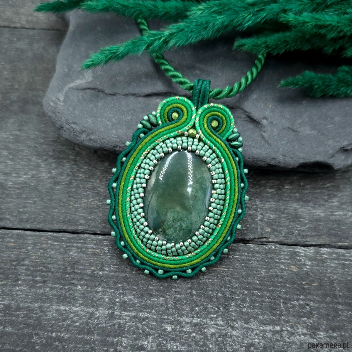 Wisiorek z sutaszu w różnych odcieniach zieleni, z dużym kamieniem agatu mszystego.
