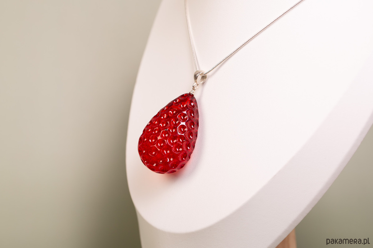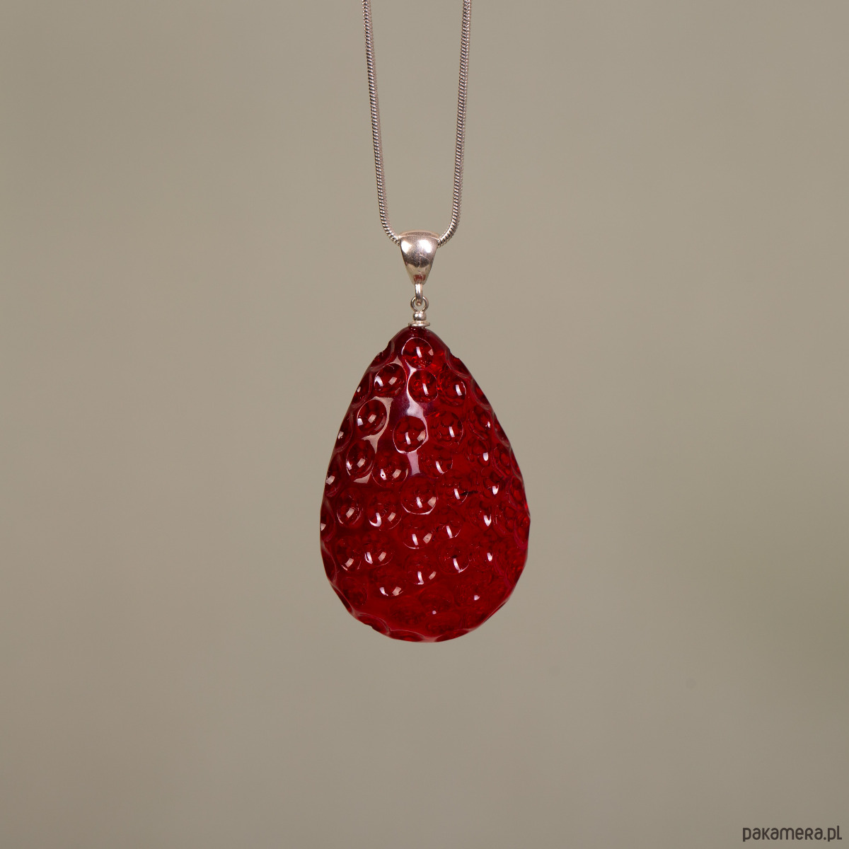 Artystyczny wisiorek wykonany z bursztynu bałtyckiego, który został poddany procesowi barwienia na intensywny, soczysty czerwony kolor. Bursztyn otrzymał unikatową, rzeźbioną formę, która swoją fakturą i kształtem do złudzenia przypomina dojrzałą truskawkę. To biżuteria o niezwykle wyrazistym charakterze, łącząca naturalny surowiec z nowoczesną, owocową stylistyką.