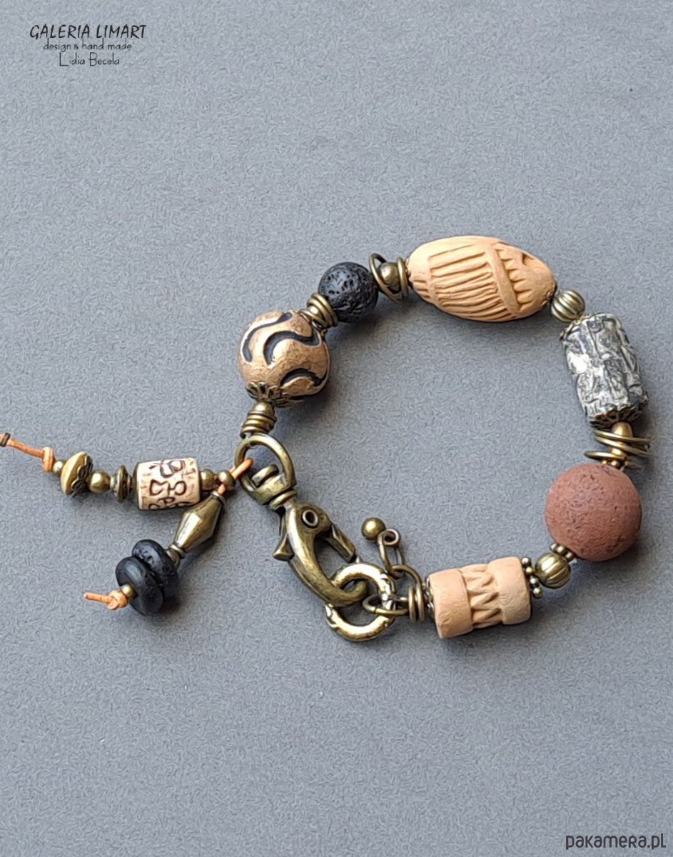 Mój wzór bransoletki z przeróżnych glinianych i ceramicznych koralików ręcznie wypalanych, lawy, drewna egzotycznego i mosiądzu. Bransoletka powstała niejako do kompletu z długim wisiorem utrzymanym w tej samej stylistyce.. Zarówno bransoleta jak i wisior są w takiej samej, zawsze modnej kolorystyce. Kolory ziemi nieodmiennie od lat są w modzie. Stonowane, modne i bardzo efektowne połączenie kolorystyczne.