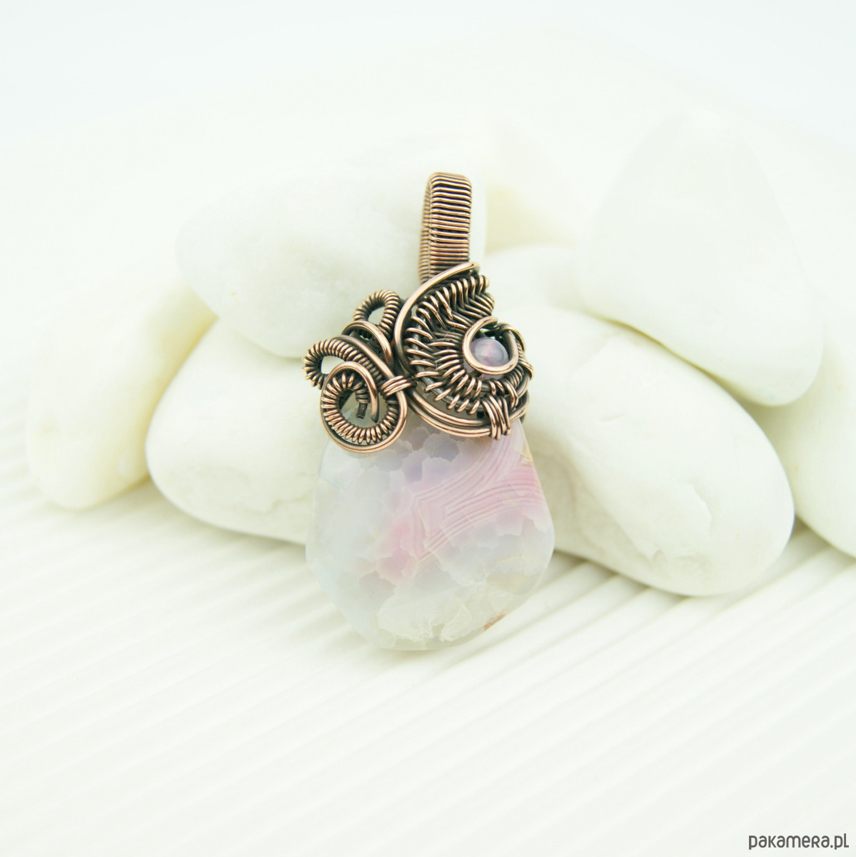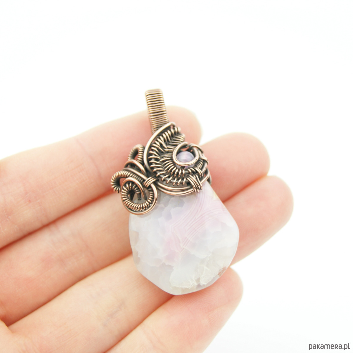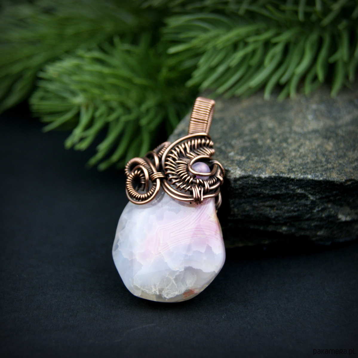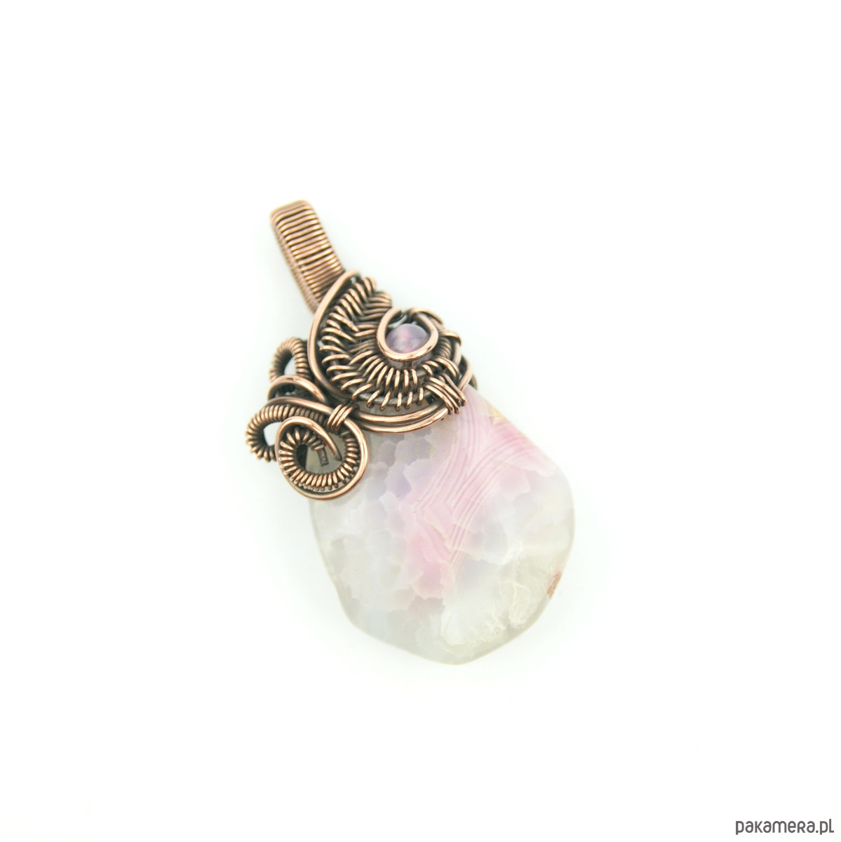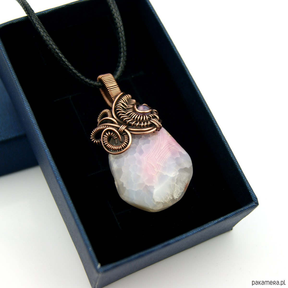 Wisiorek powstał z wzorzystego agatu o nieregularnym kształcie. W misternym miedzianym oplocie widoczny mniejszy kamień agatu, dobrany kolorystycznie.