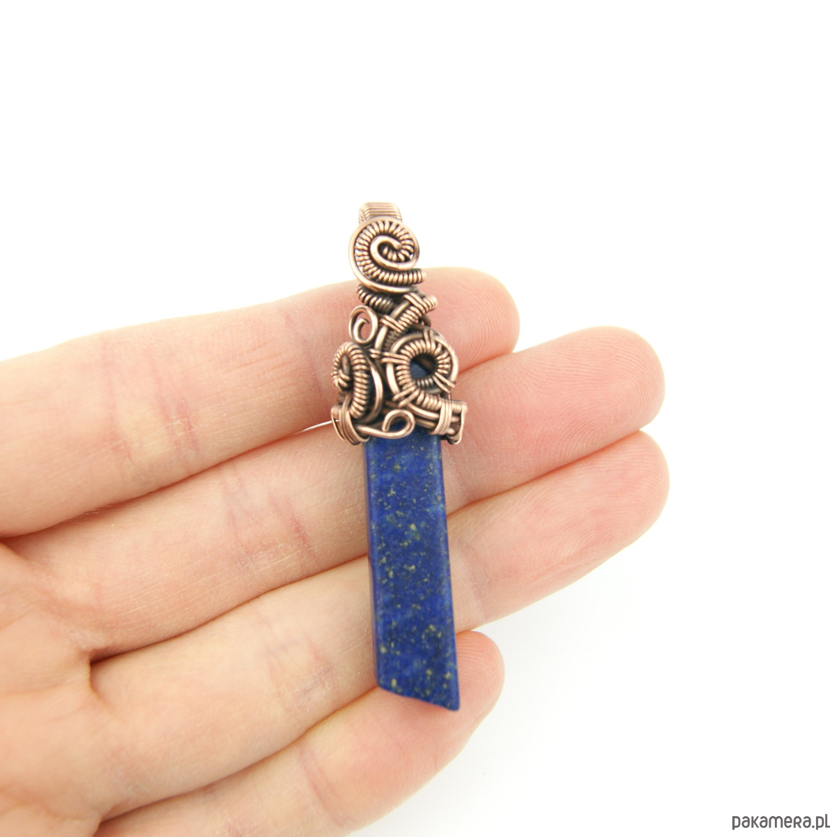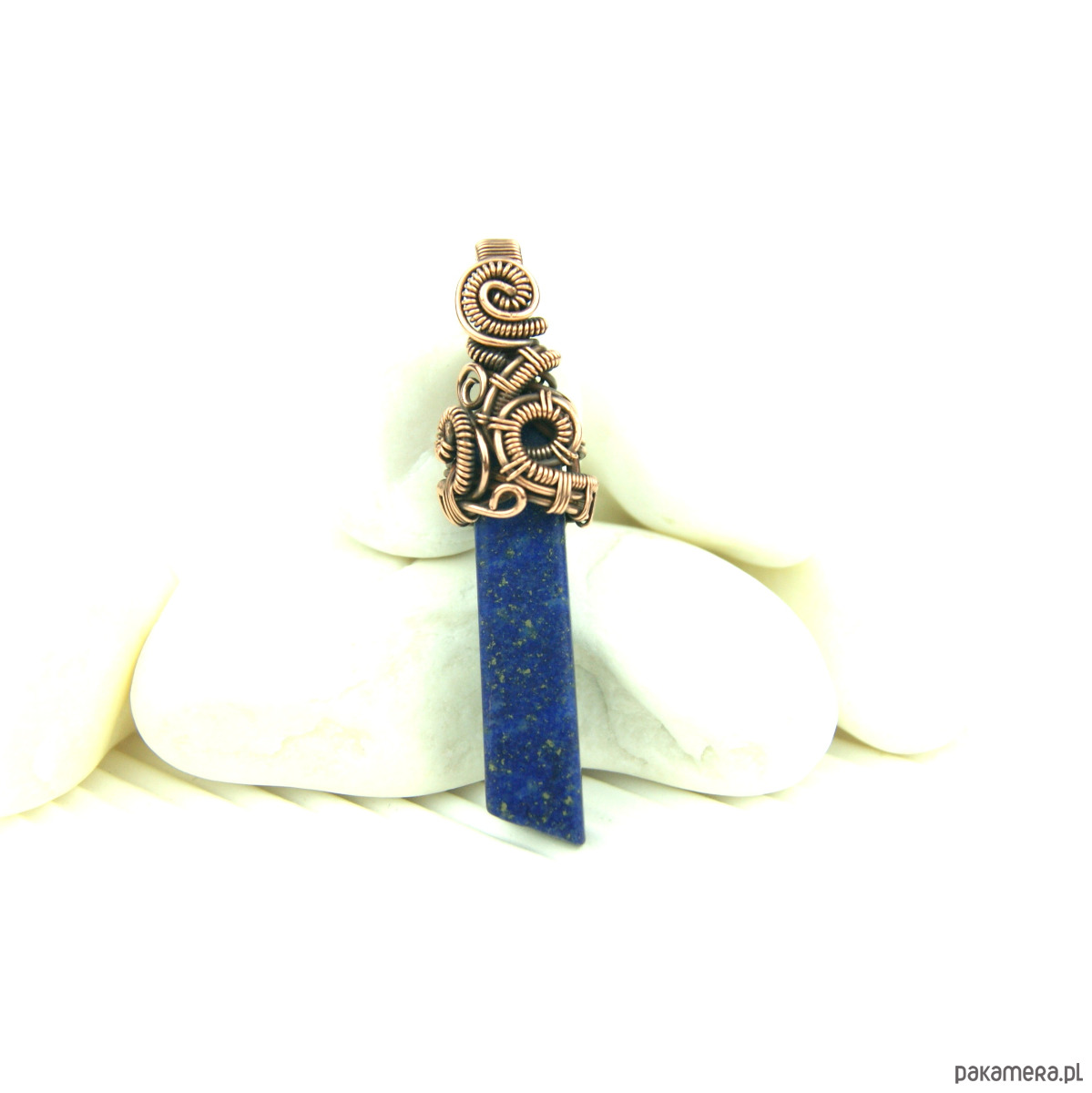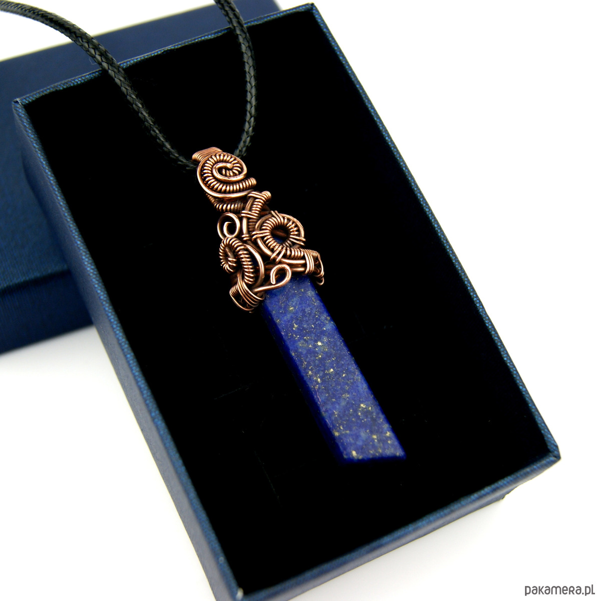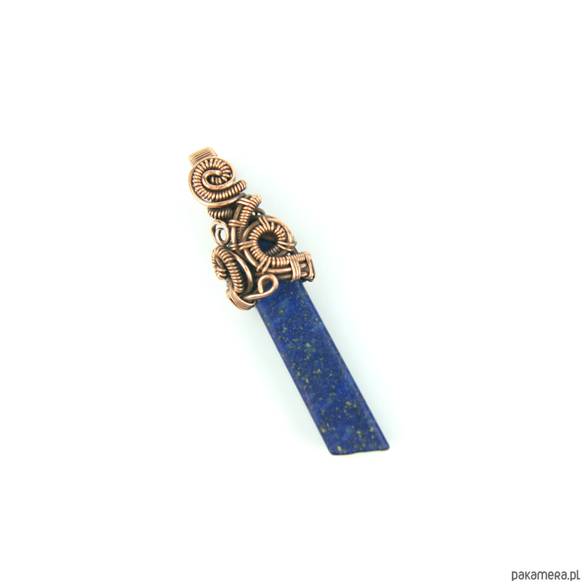 Wisiorek powstał z wyjątkowego kamienia lapis lazuli o intensywnej niebieskiej barwie i nieregularnym kształcie. Całość misternie opleciona miedzią.