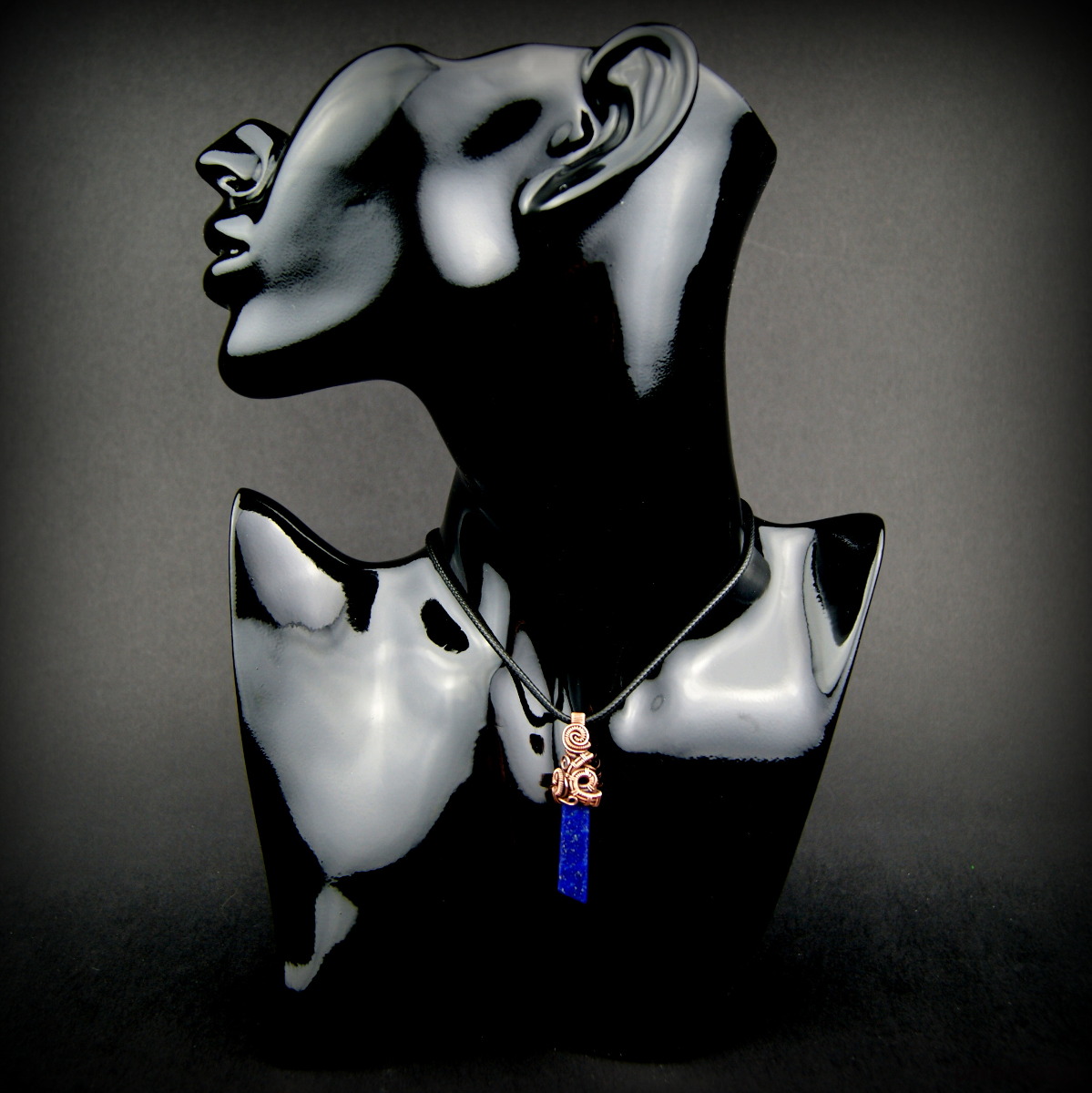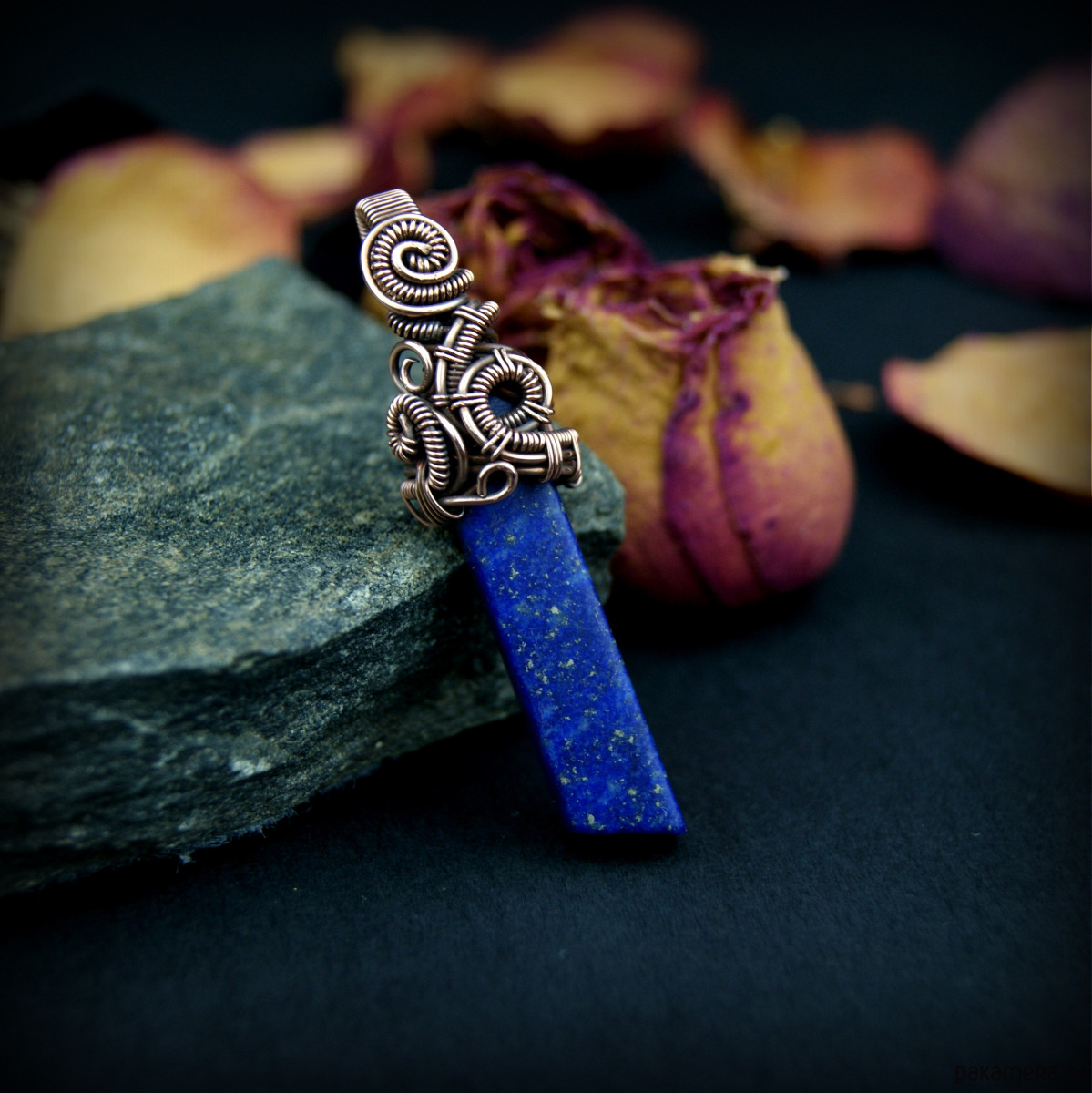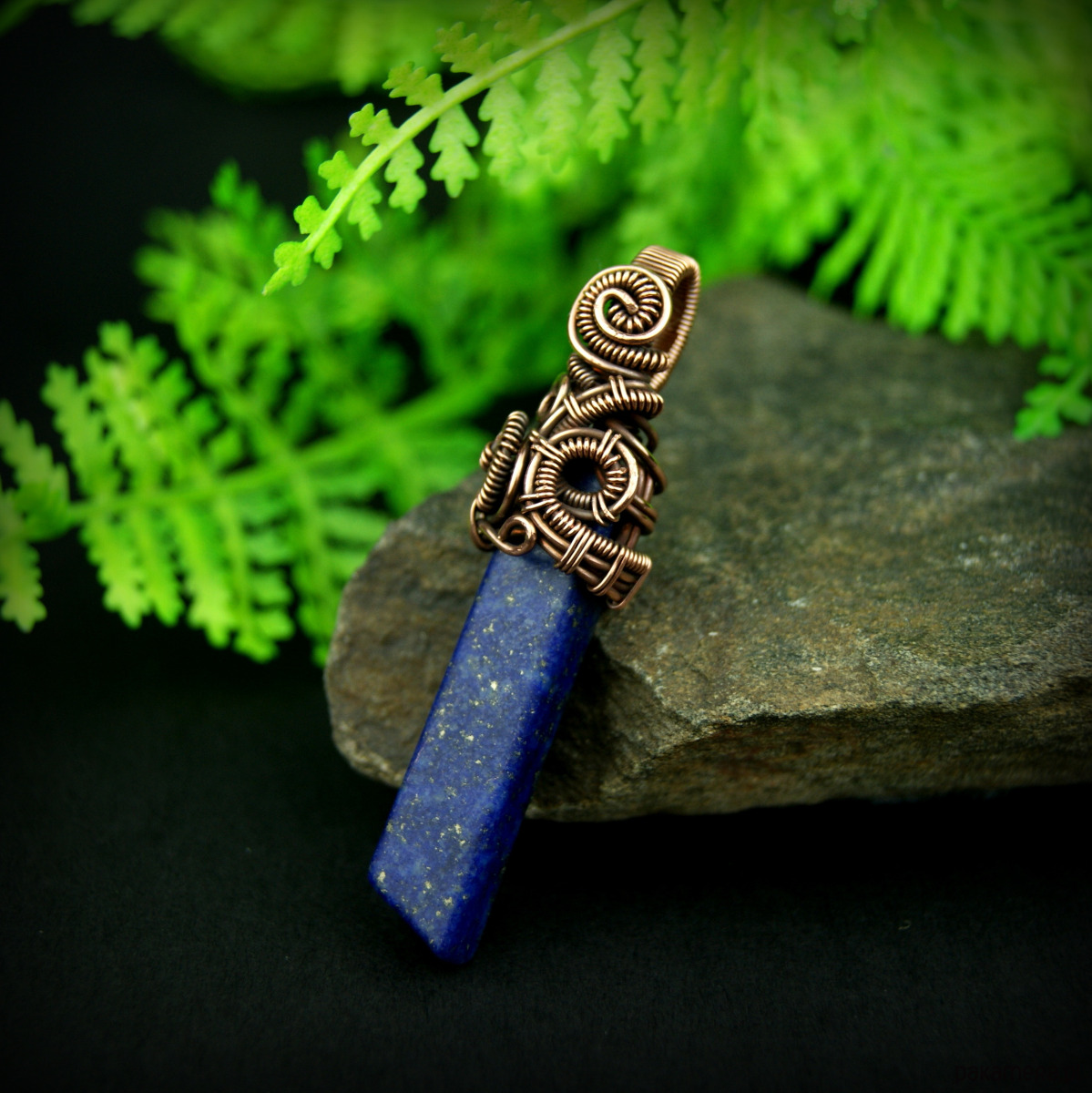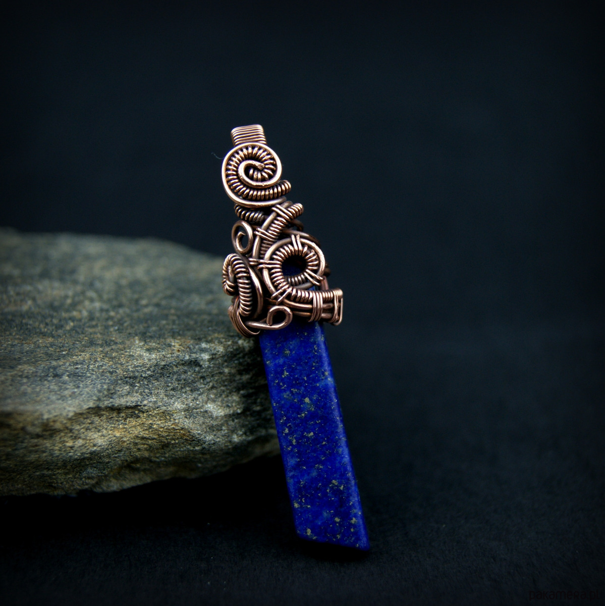 Wisiorek powstał z wyjątkowego kamienia lapis lazuli o intensywnej niebieskiej barwie i nieregularnym kształcie. Całość misternie opleciona miedzią.