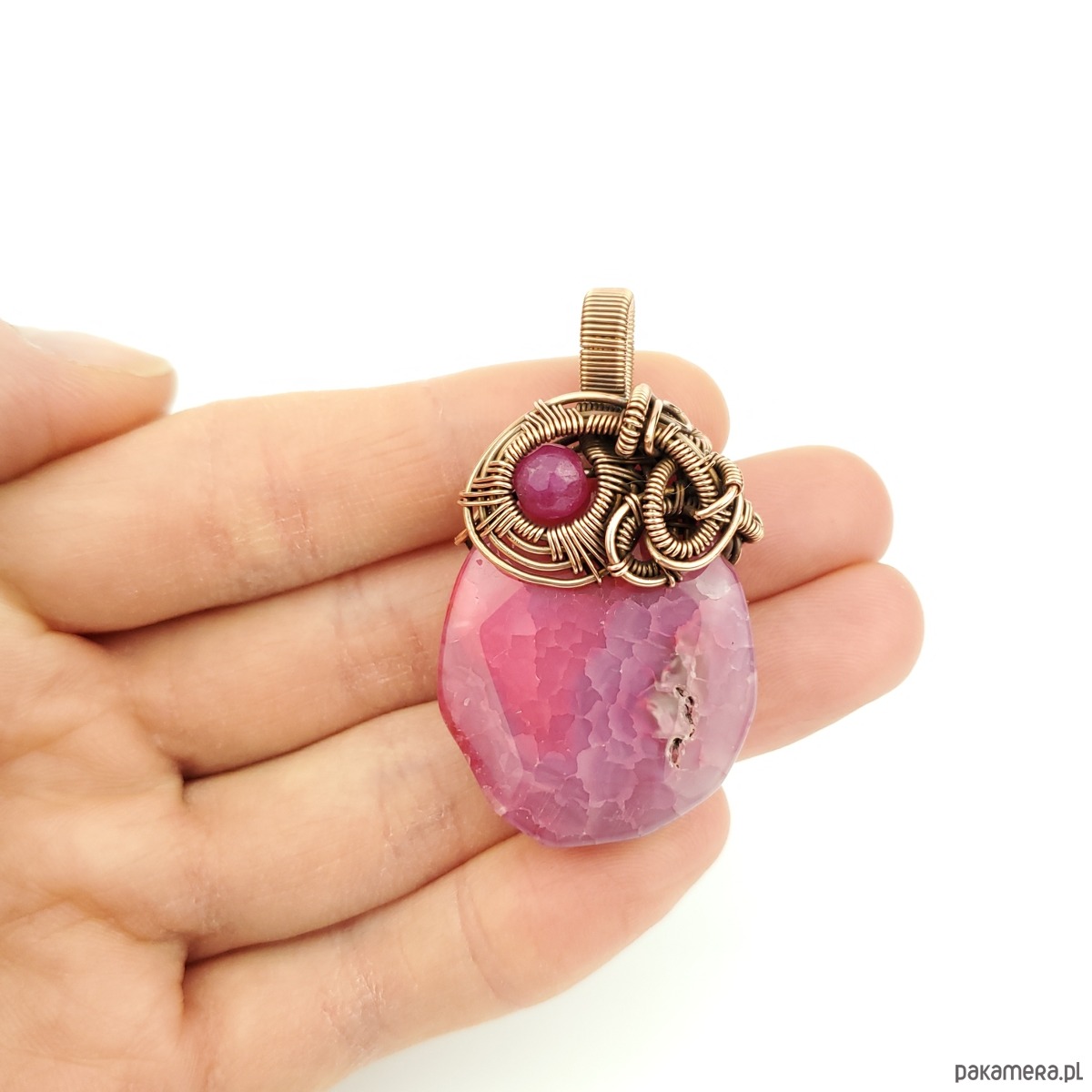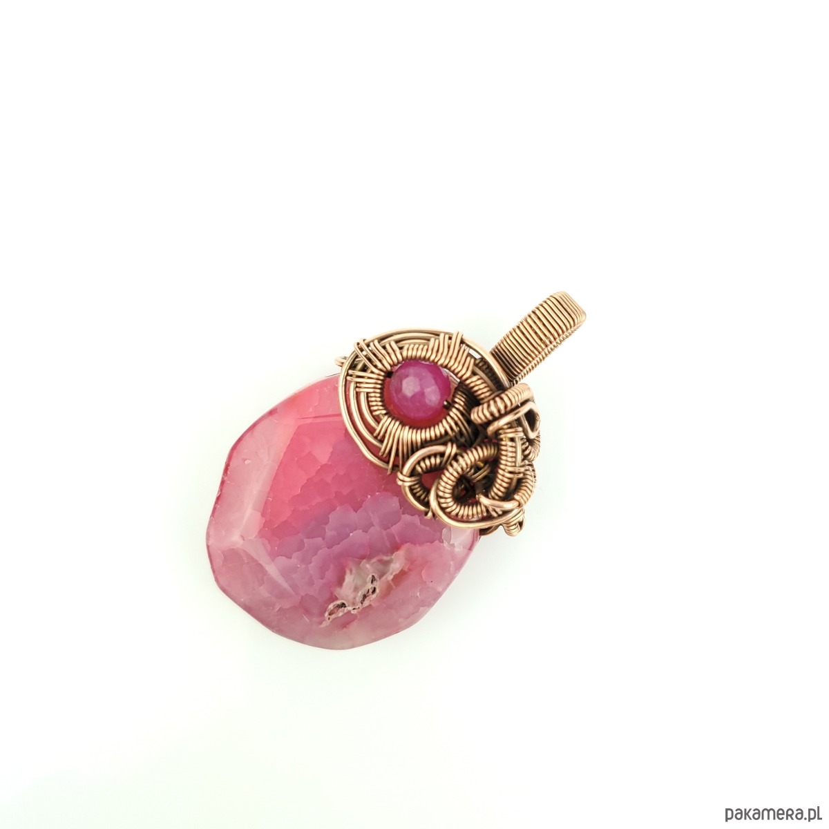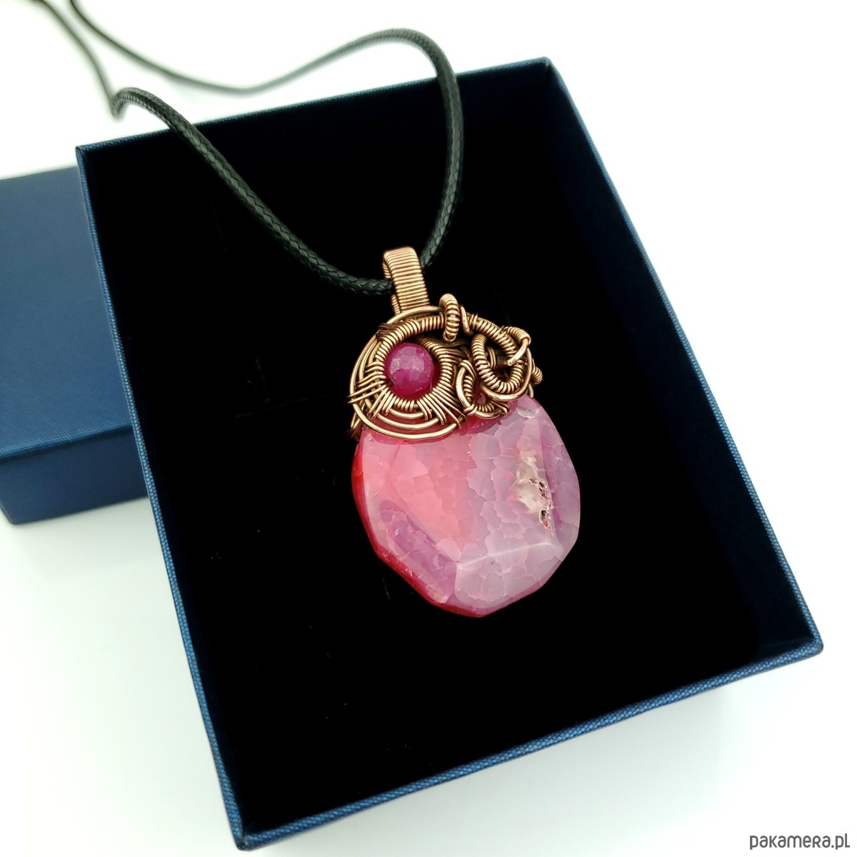 Wisiorek powstał na bazie kamienia o nieregularnym kształcie i wyjątkowej intensywnie różowej barwie. W misternie plecionej oprawie połyskuje mniejszy kamień agatu, pasujący kolorystycznie do całości.