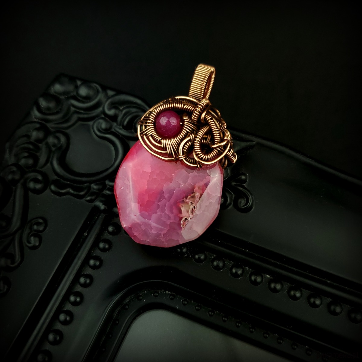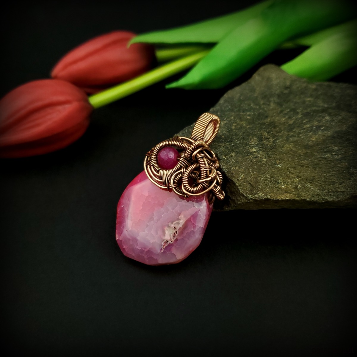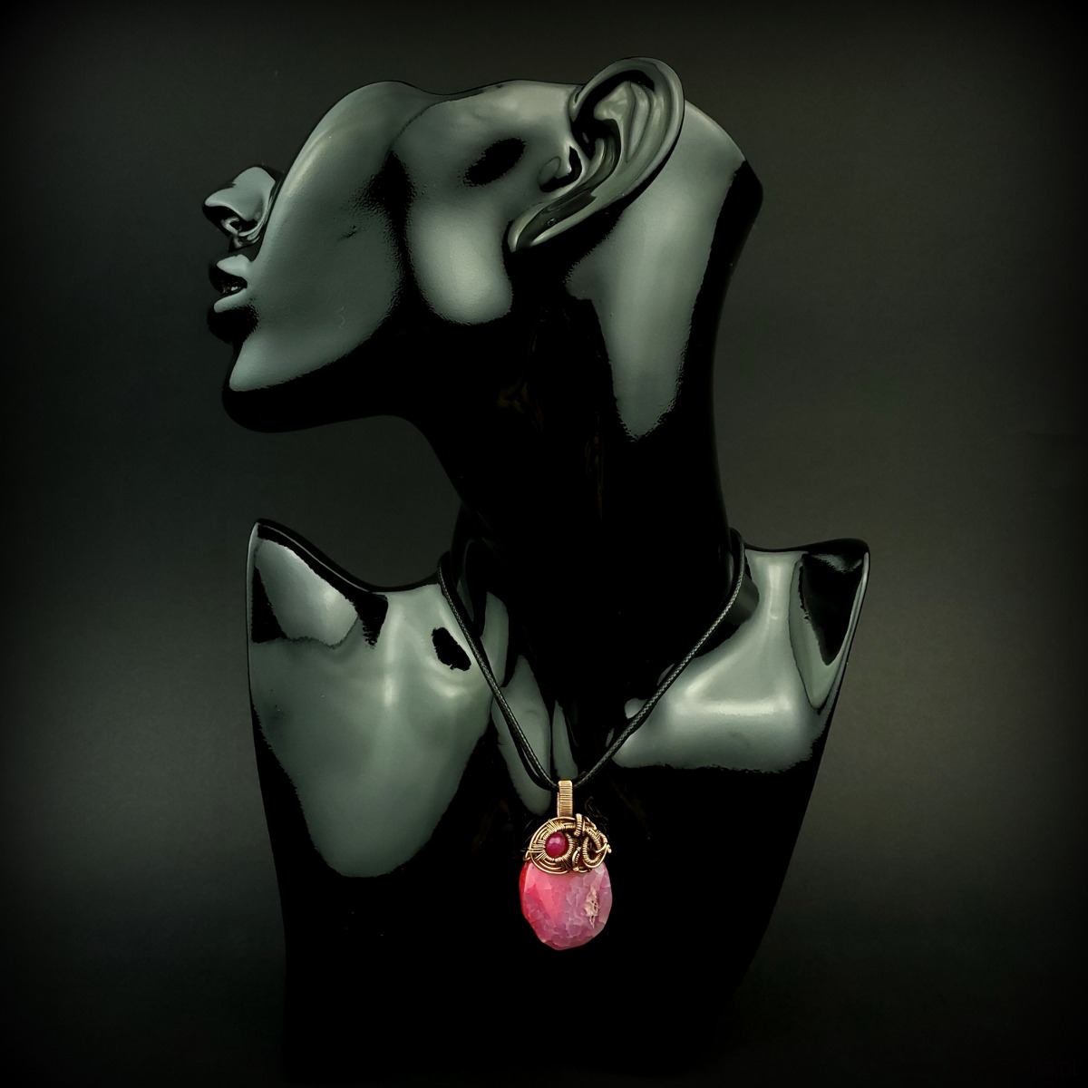 Wisiorek powstał na bazie kamienia o nieregularnym kształcie i wyjątkowej intensywnie różowej barwie. W misternie plecionej oprawie połyskuje mniejszy kamień agatu, pasujący kolorystycznie do całości.