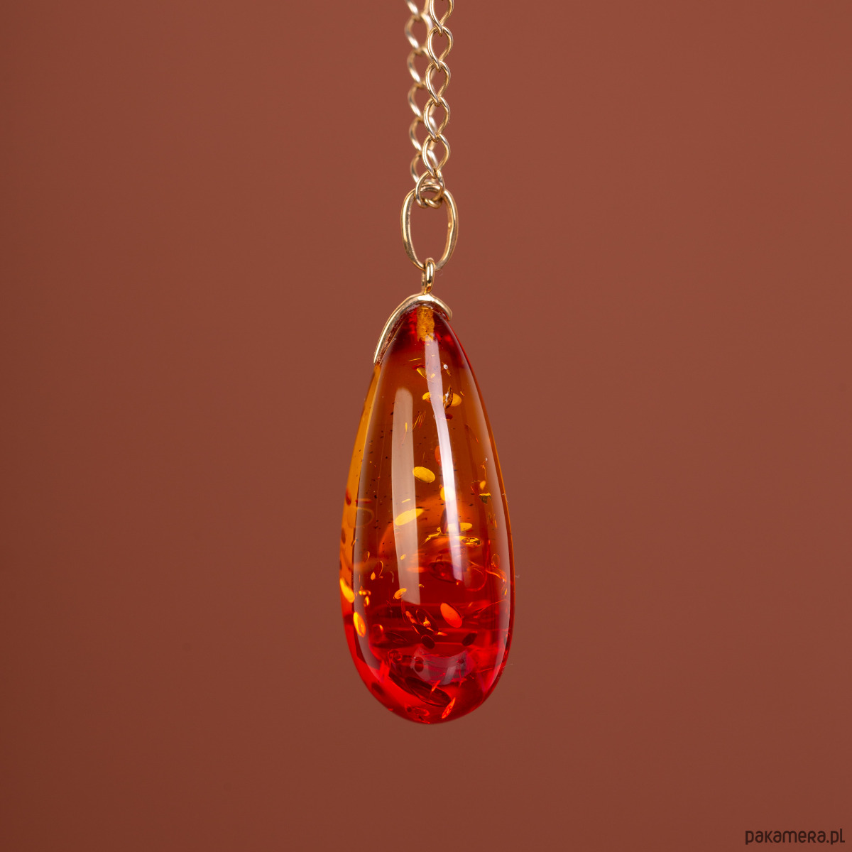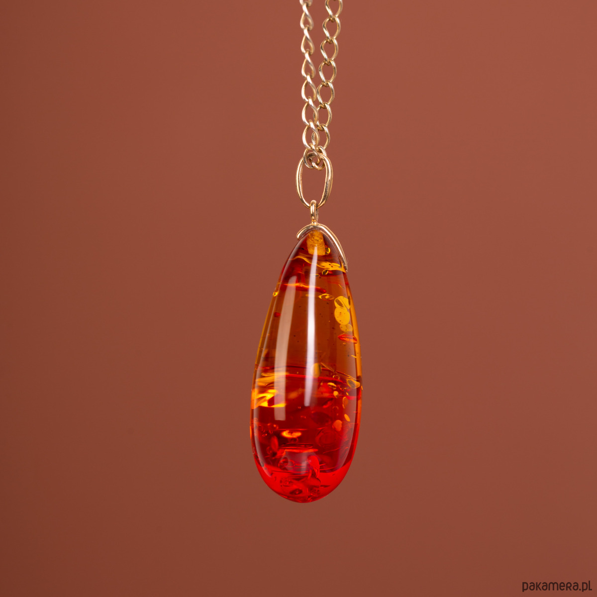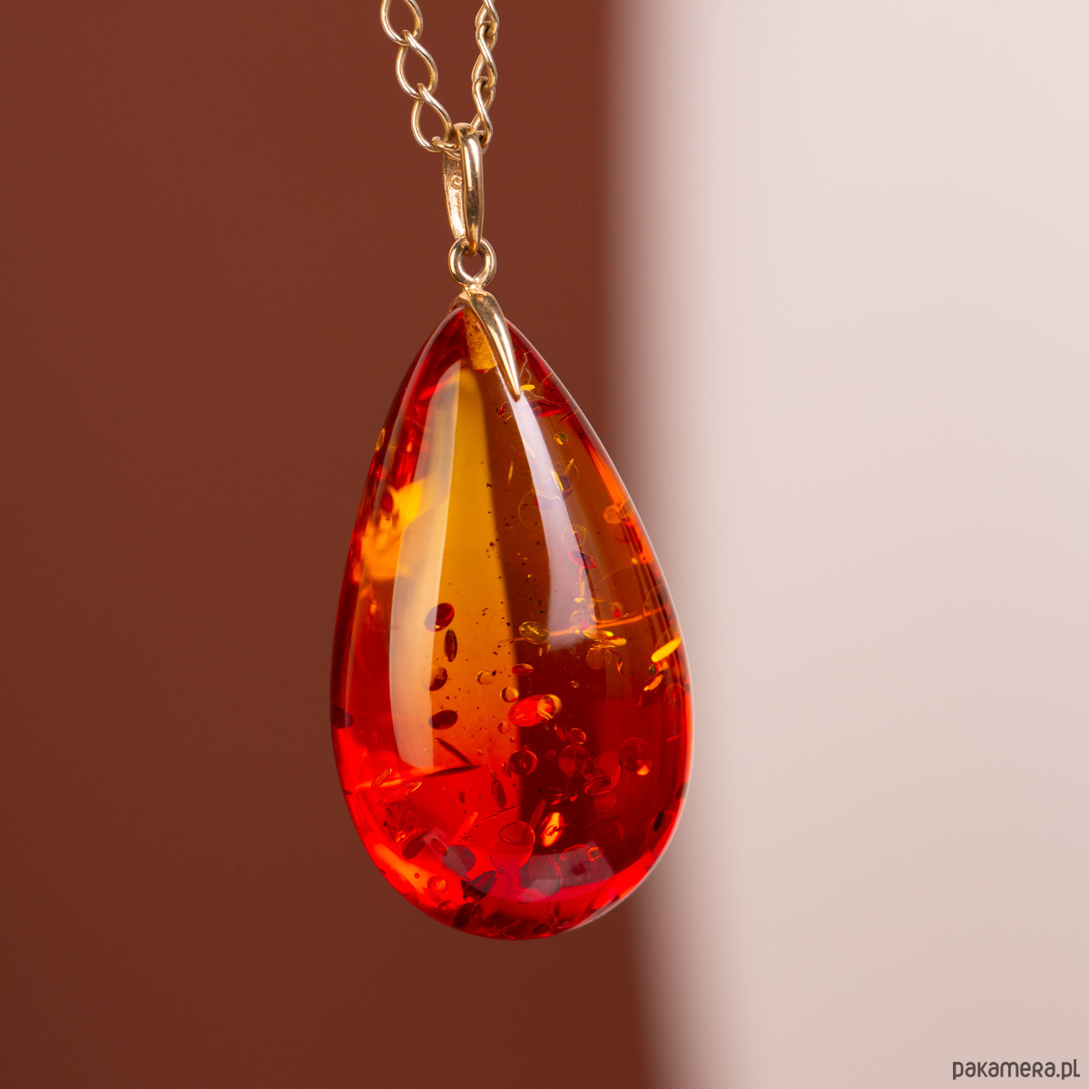 Elegancki wisiorek o klasycznym kształcie kropli, wykonany z bursztynu bałtyckiego poddanego procesowi barwienia. Dzięki temu bursztyn zyskał głęboki, nasycony odcień dojrzałej wiśni, który w górnej części płynnie przechodzi w słoneczny miodowy blask. Wnętrze bursztynu wypełniają naturalne łuski, które pod wpływem światła mienią się i dodają bryle niesamowitej głębi. Całość wieńczy minimalistyczna zawieszka wykonana z 14-karatowego złota (próba 585).
