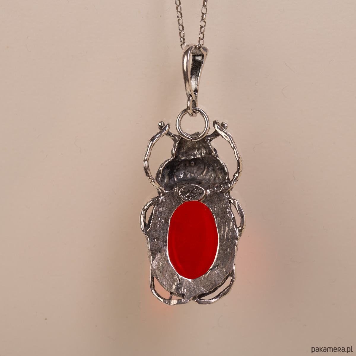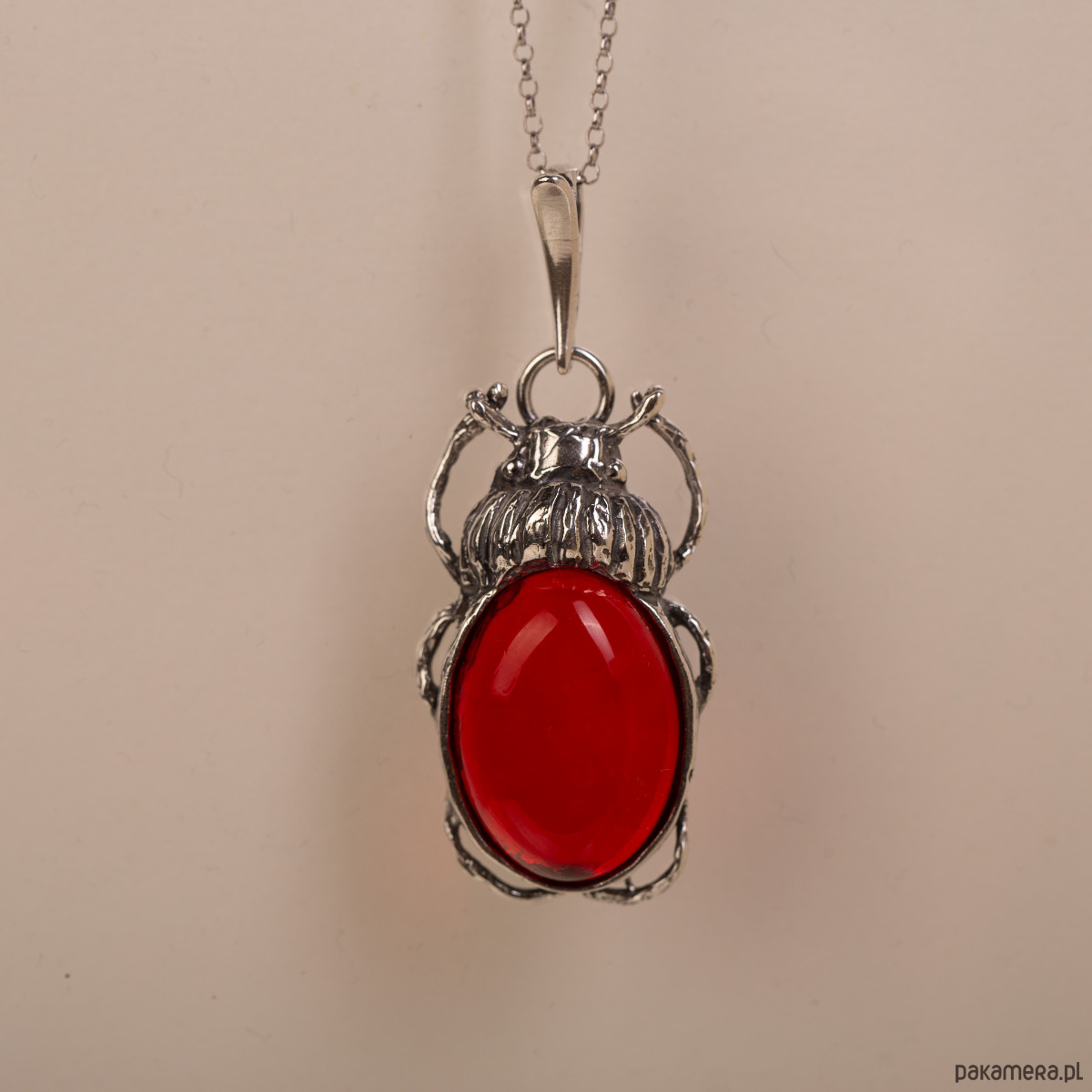 Forma i charakter: Motyw żuka z rozłożonymi „skrzydłami" tworzy przestrzenną, rzeźbiarską bryłę. Czerwony bursztyn w środku błyszczy i zmienia się wraz ze światłem, tworząc efekt biżuterii o wysokiej klasy wykonania.