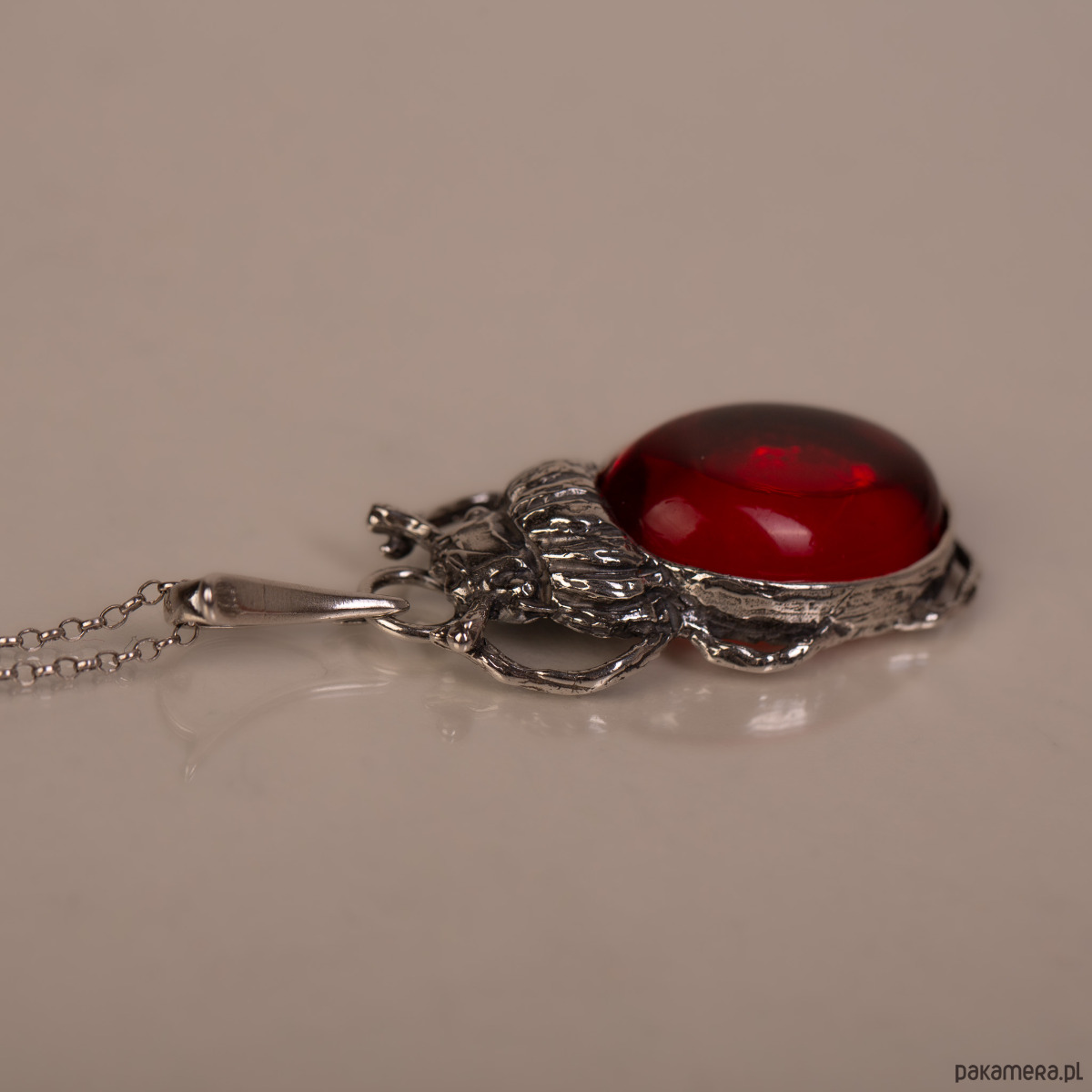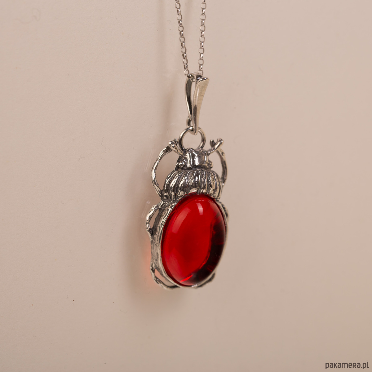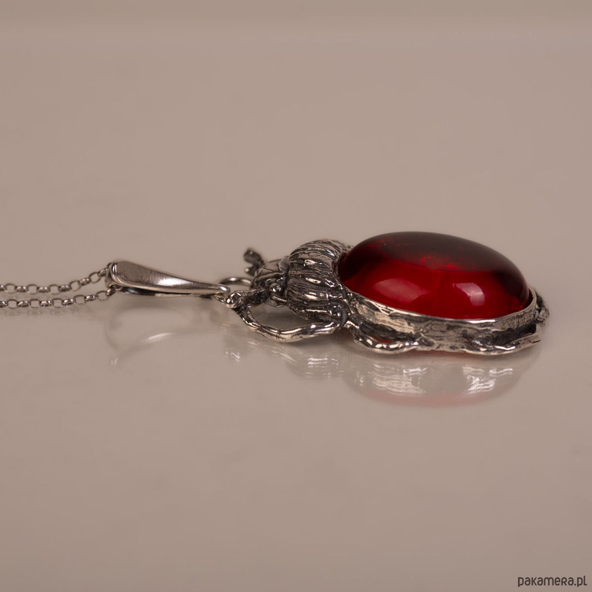 Efektowny wisiorek z motywem żuka, w którym centrum stanowi bursztyn bałtycki barwiony na głęboką, intensywną czerwień. Bursztyn ma piękny, szlachetny połysk, a ręcznie formowana srebrna oprawa o dekoracyjnym, rzeźbiarskim wykończeniu tworzy miniaturową rzeźbę. To biżuteria, która przyciąga spojrzenia — artystyczna, odważna i pełna charakteru.