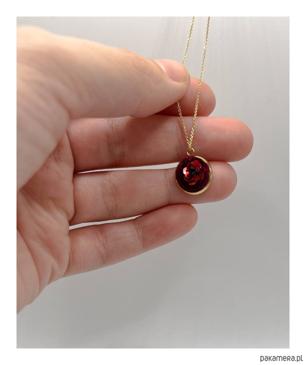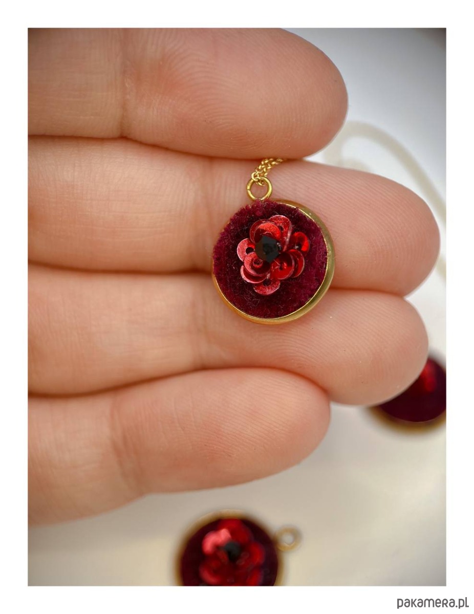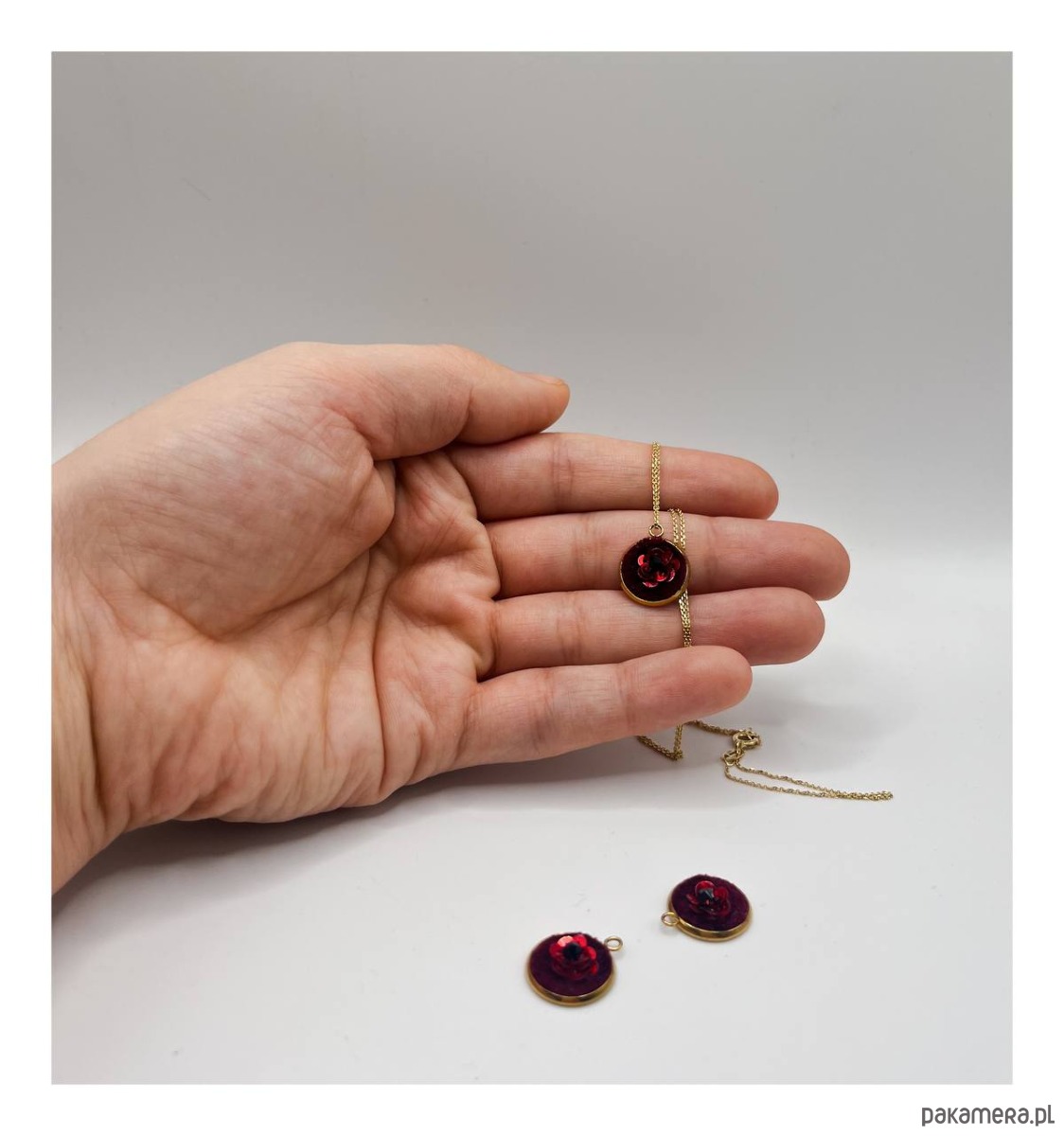 Wisiorek z bordowymi cekinami i kryształkiem spinelu