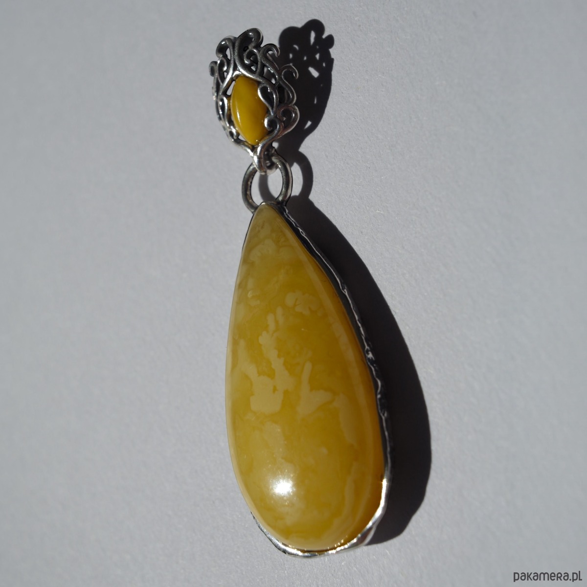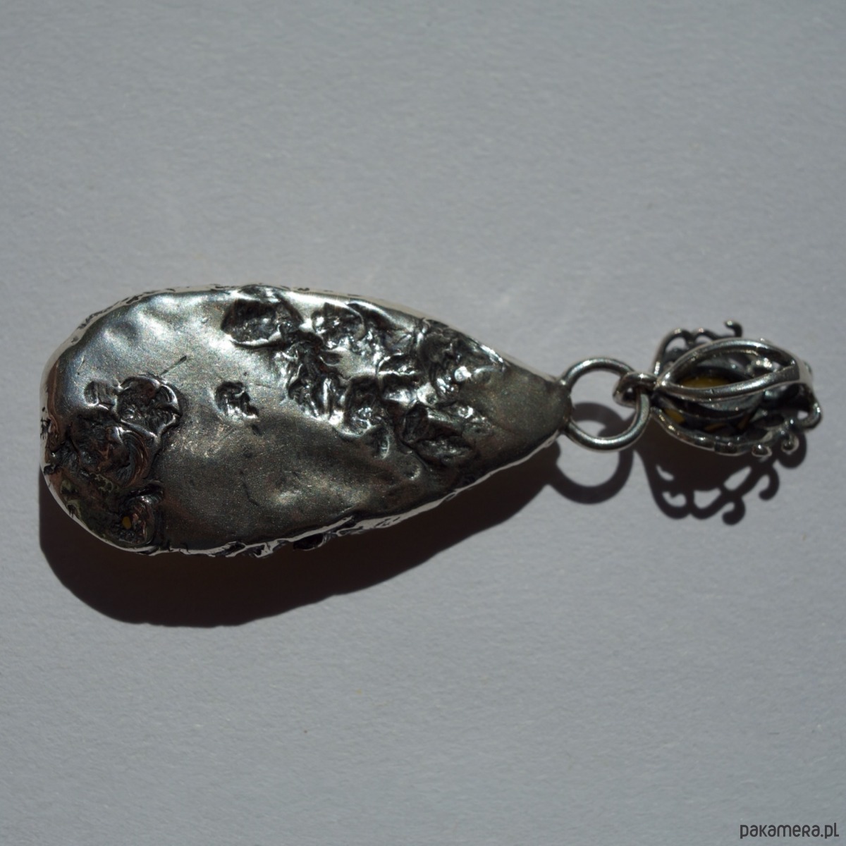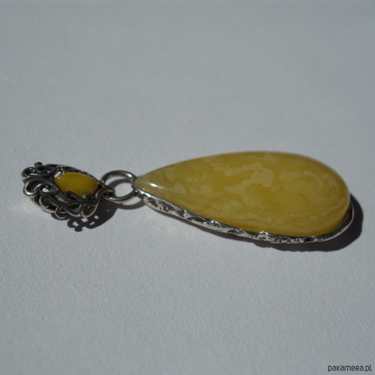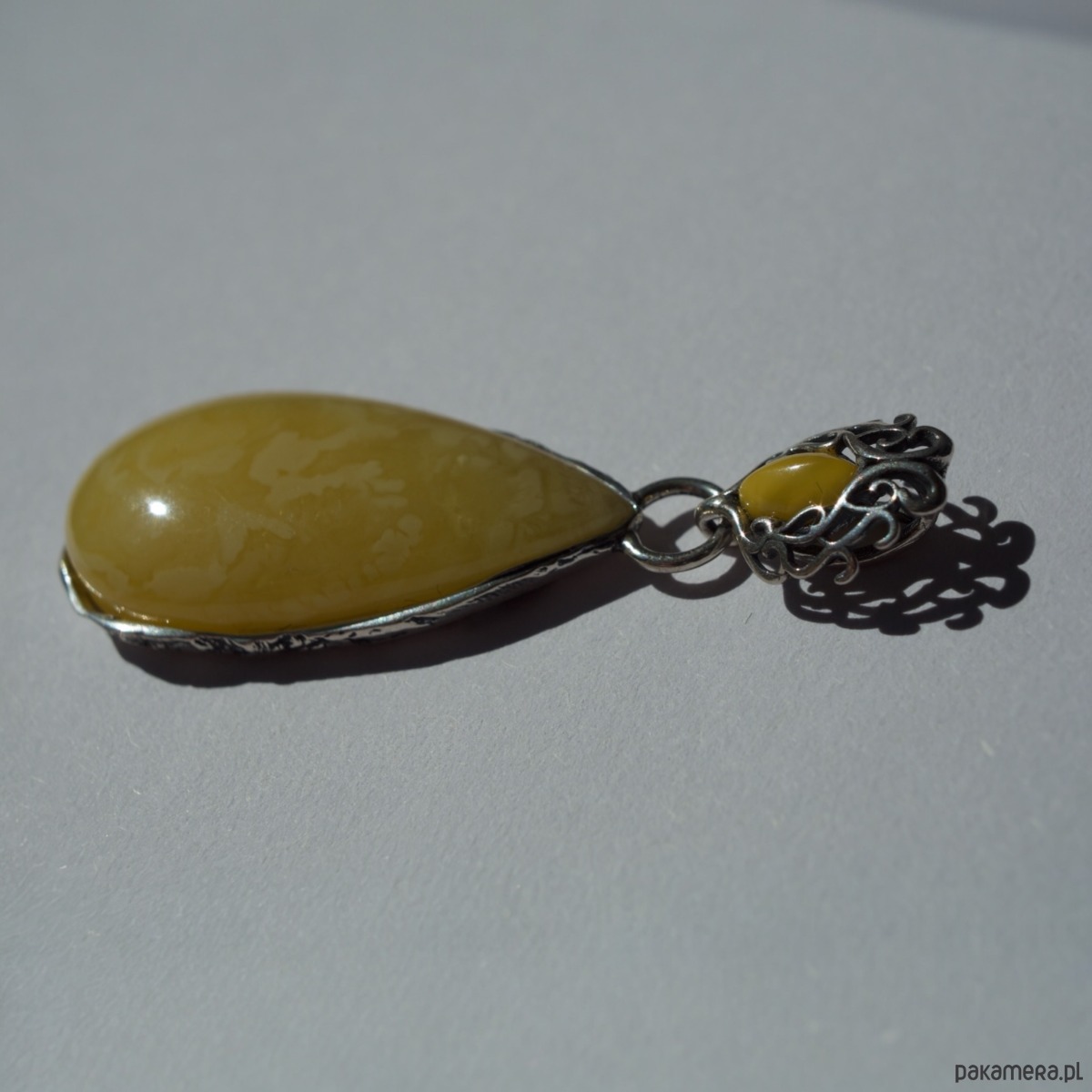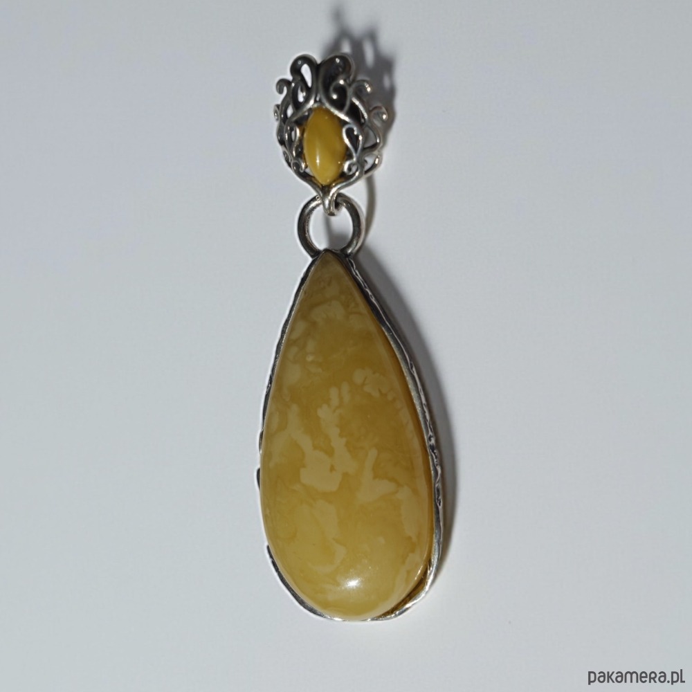 Ręcznie wykonany wisiorek o eleganckiej formie kropli, w którym główną rolę odgrywa duży bursztyn bałtycki w odcieniu miodowym. Naturalne wzory zamknięte w bursztynie nadają mu niepowtarzalny charakter. Całość dopełnia mniejszy bursztyn, osadzony w misternie zdobionej oprawie przy zawieszce, co dodaje biżuterii subtelnego, artystycznego wykończenia.