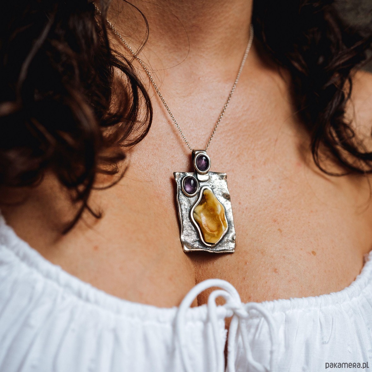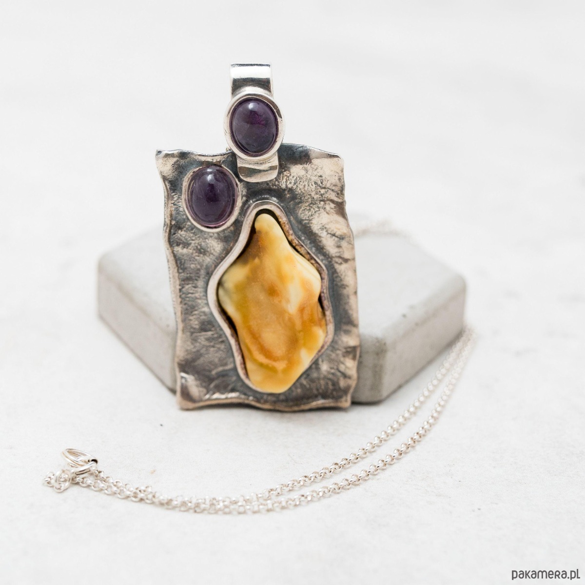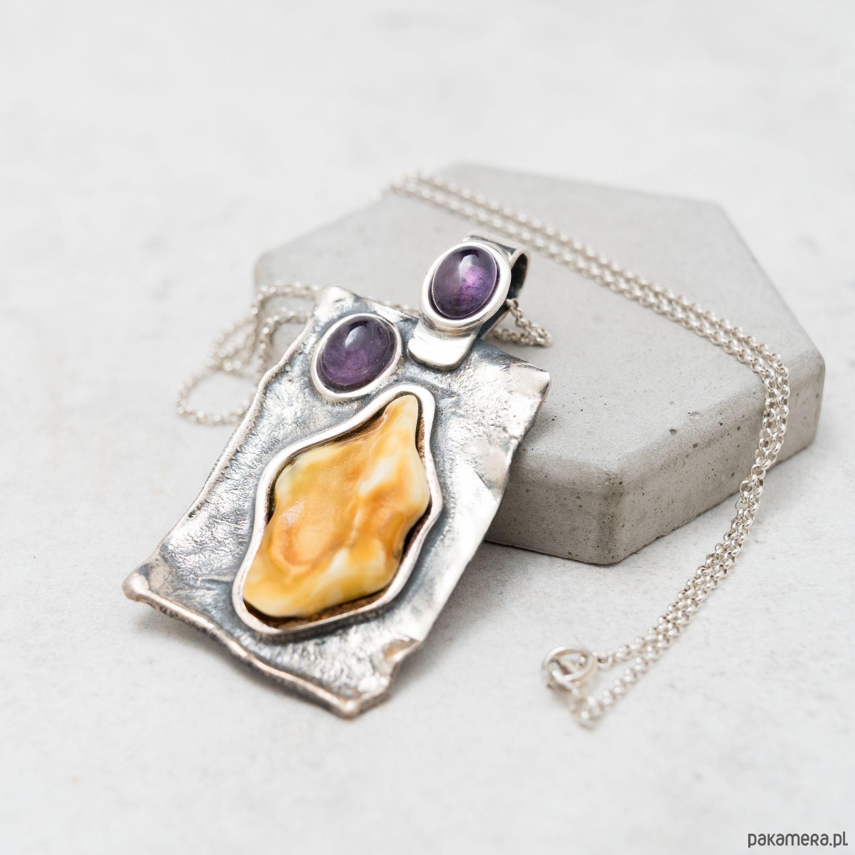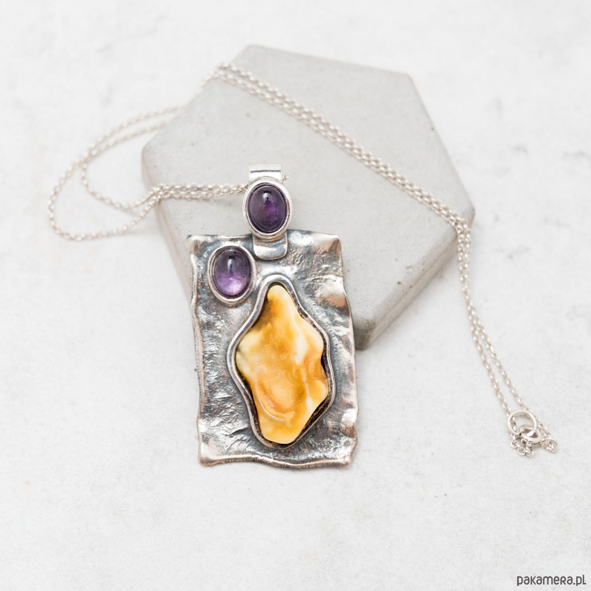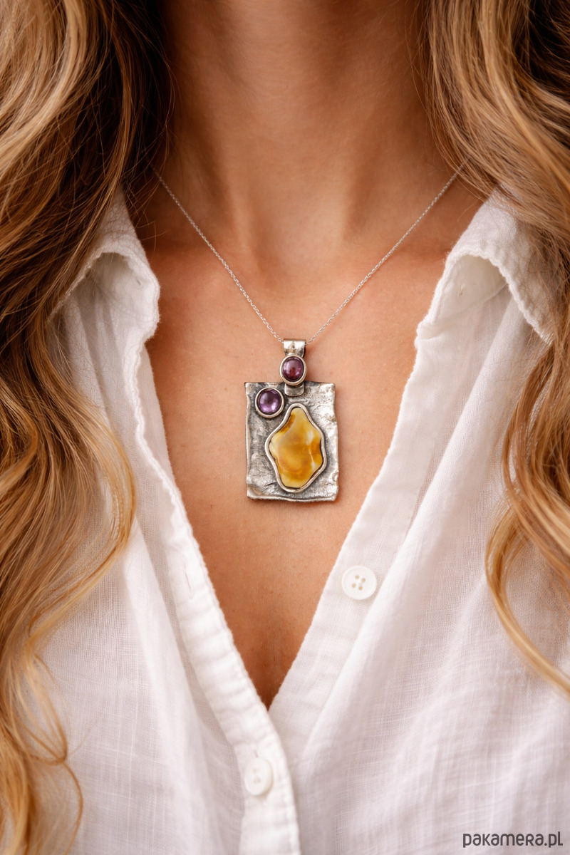 - materiały: naturalny bursztyn bałtycki, ametyst, srebro sterling 925