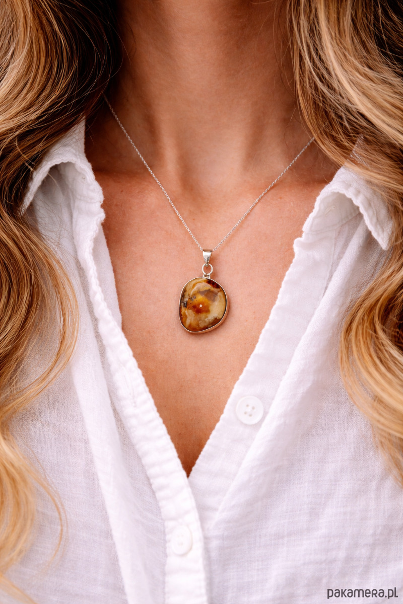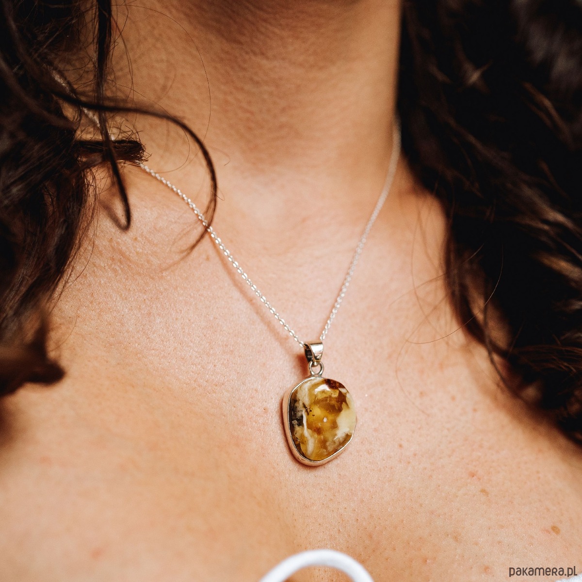 Srebrna oprawa podkreśla naturalny blask bursztynu i gwarantuje trwałość użytkowania, a delikatny łańcuszek o długości 47 cm zapewnia komfort noszenia na co dzień oraz uniwersalność stylizacji — od casualowych zestawów po bardziej eleganckie kreacje. Produkt wykonany z dbałością o detale, polecany osobom ceniącym naturalne materiały i minimalistyczny, klasyczny design.