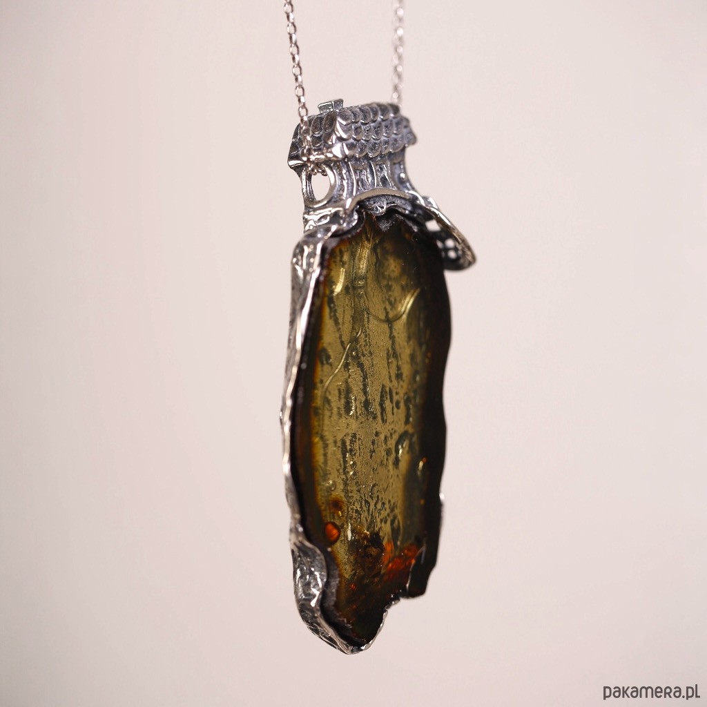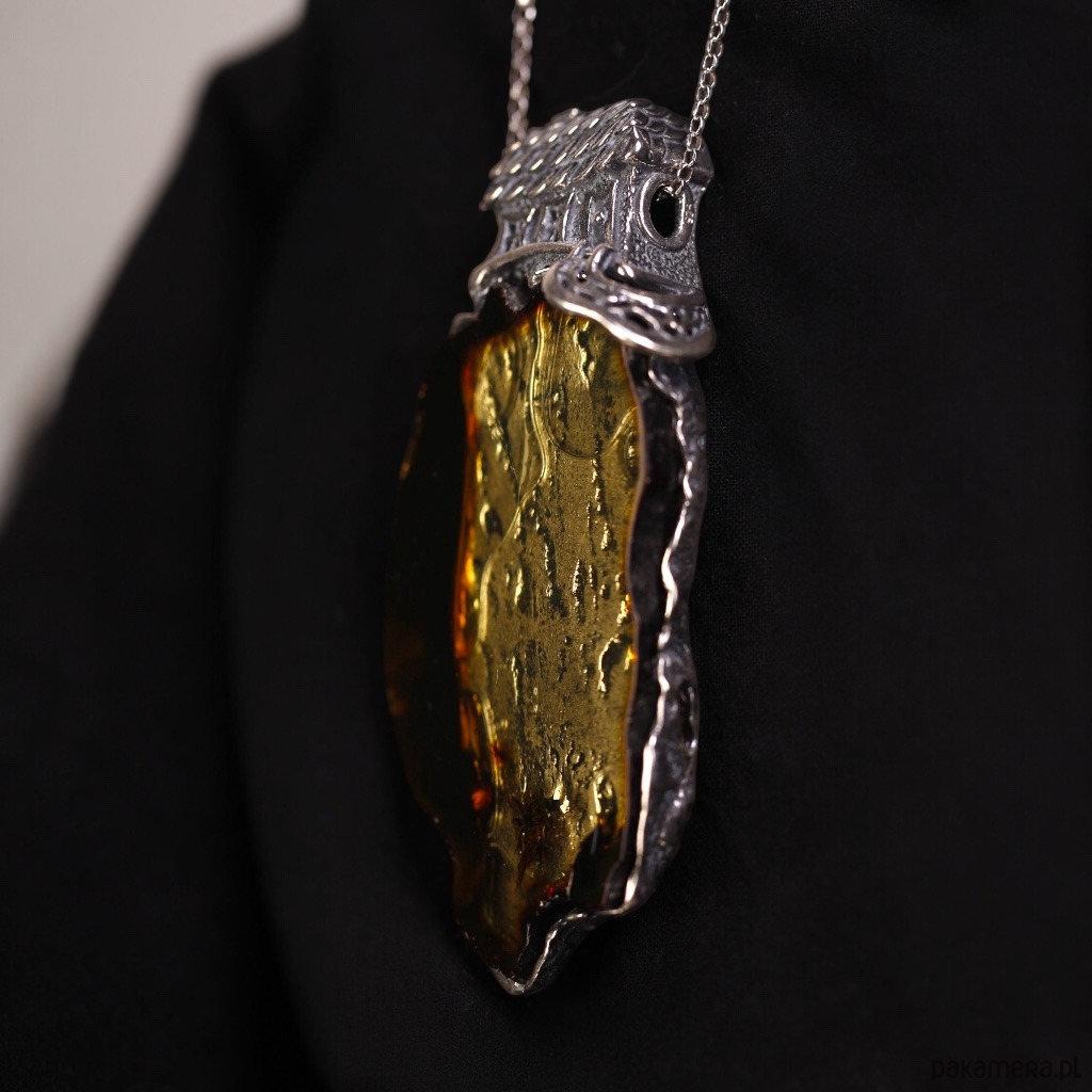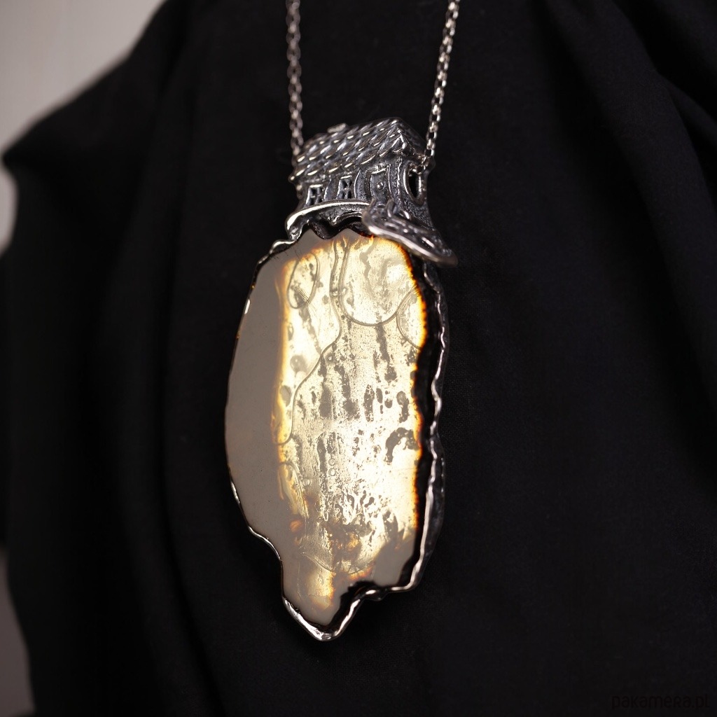 Wisiorek z motywem domku osadzonego na bursztynowym plastrze, który subtelnie mieni się złotymi refleksami. Surowa krawędź bursztynu ładnie kontrastuje z dopracowanym srebrem, tworząc prostą, ale bardzo charakterystyczną kompozycję. To dodatek, który od razu przyciąga wzrok, a jednocześnie pozostaje wygodny w codziennym noszeniu.